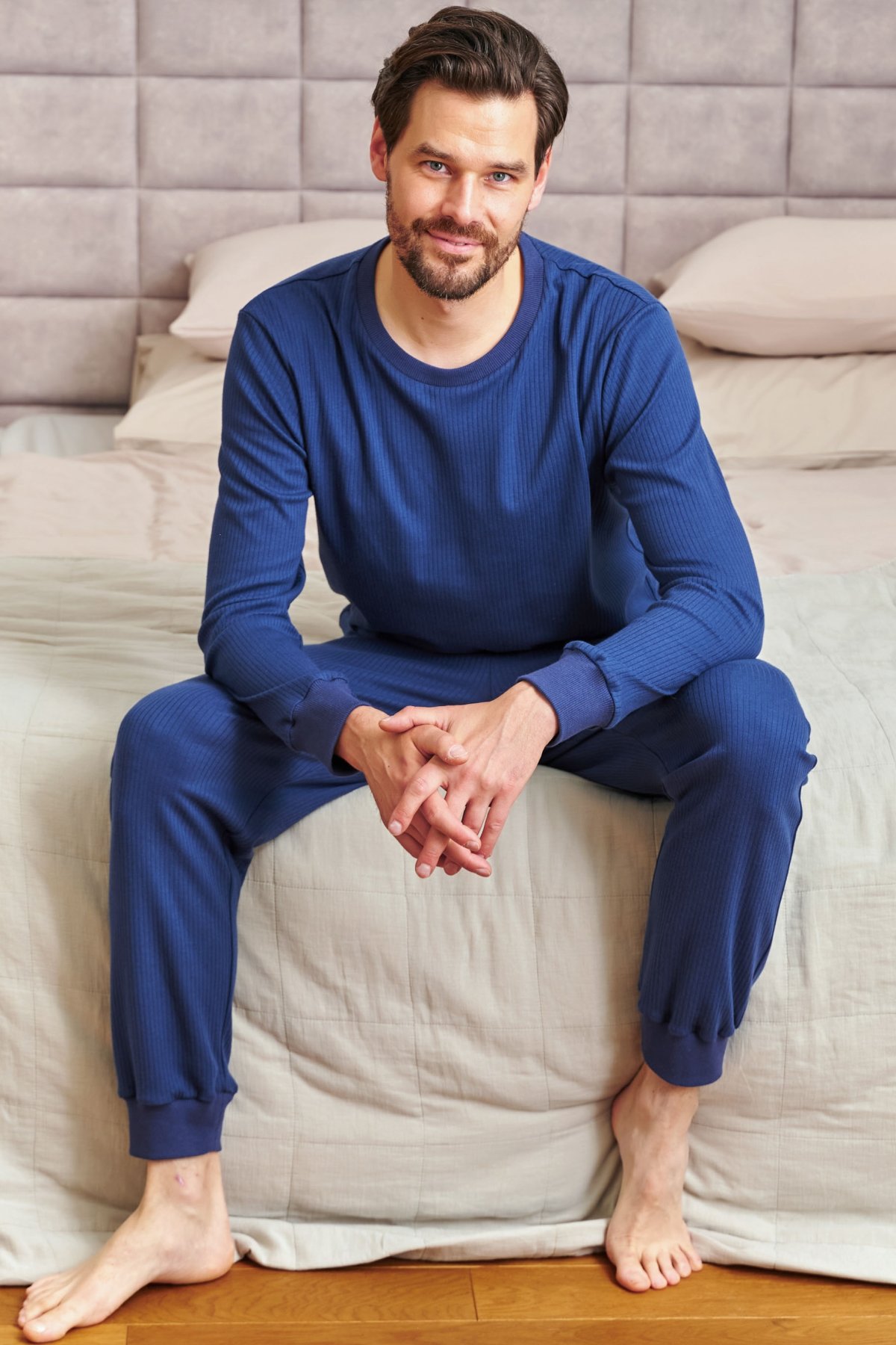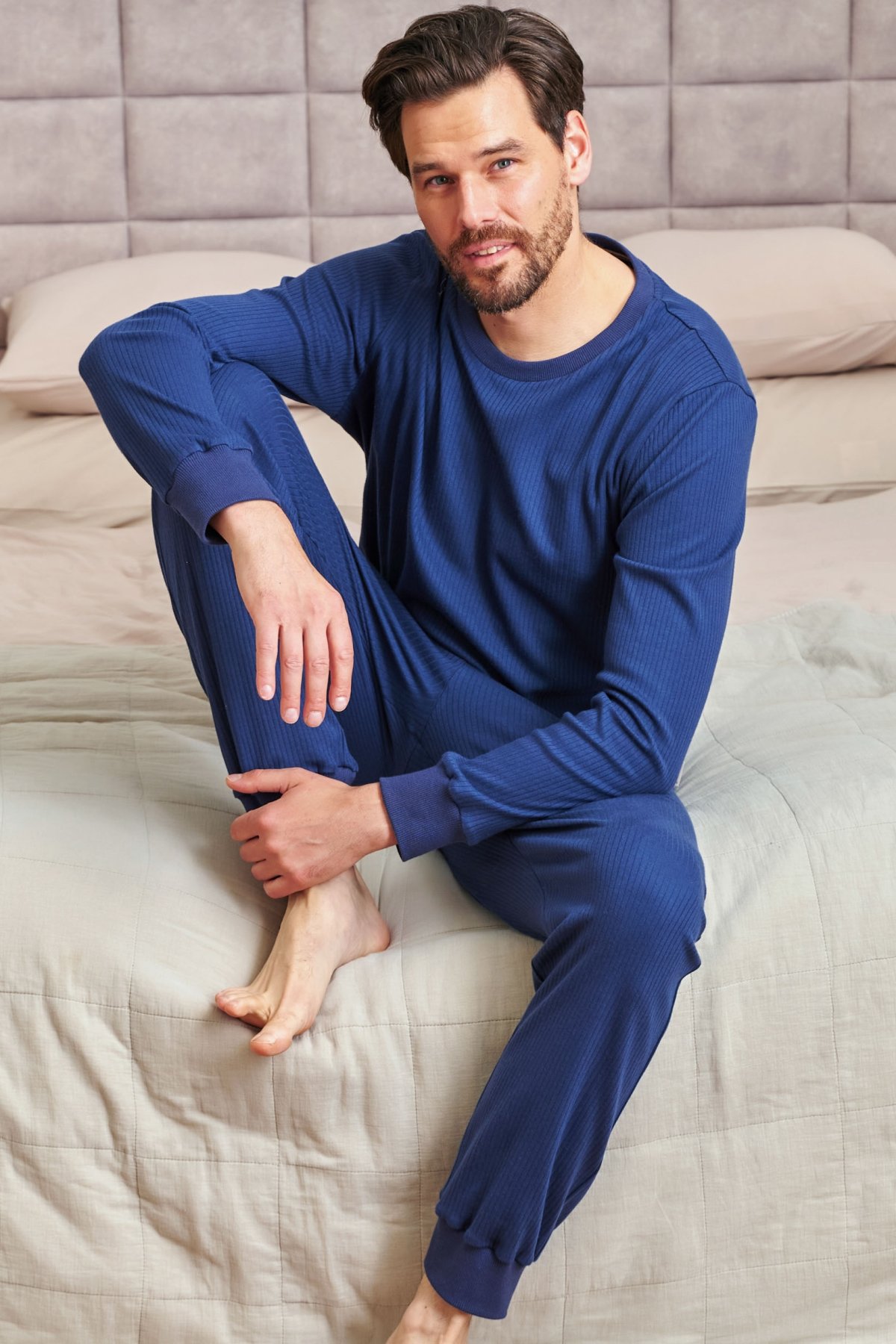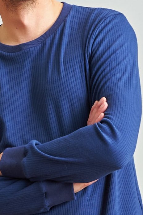 Panské pyžamo spájajúce klasický štýl s výnimočným pohodlím. Je vyrobené z rebrovanej bavlny, ktorá sa prirodzene prispôsobuje telu a zaručuje pohodlie počas spánku aj počas lenivých víkendových rán.