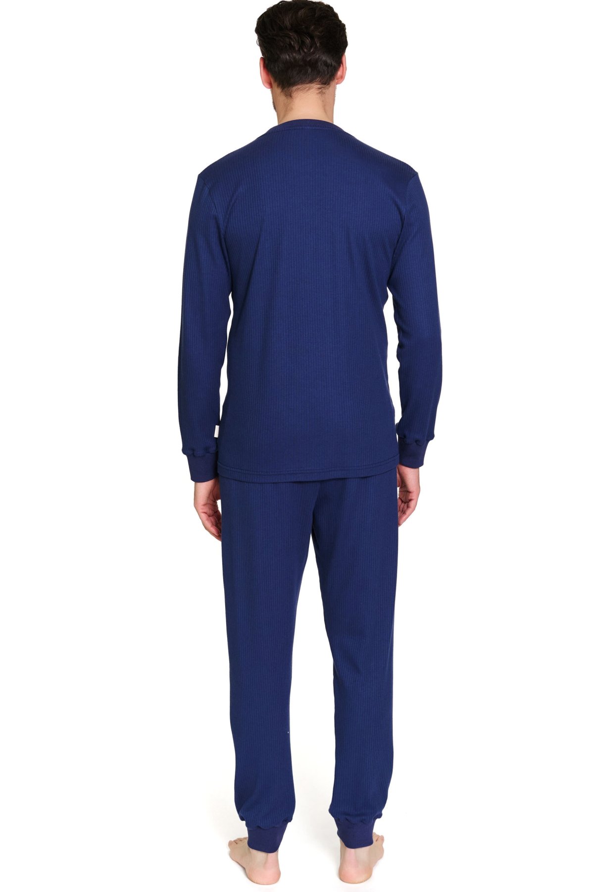 Top s dlhými rukávmi a okrúhlym výstrihom pôsobí jednoducho a moderne, zatiaľ čo nohavice s elastickými koncami a elastickým pásom poskytujú voľnosť pohybu bez nepríjemného tlačenia. Decentná aplikácia podčiarkuje kvalitu a dôkladné spracovanie. Tento model je ideálnou voľbou pre mužov, ktorí ocenia minimalistický dizajn, pohodlie a spoľahlivú kvalitu.
