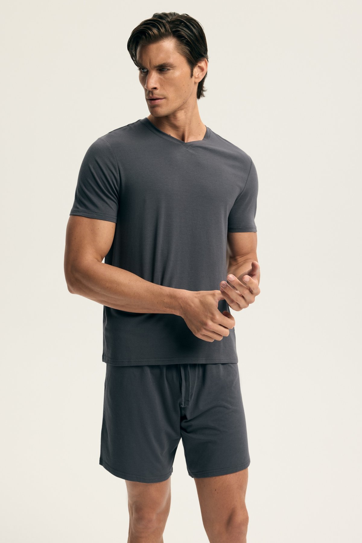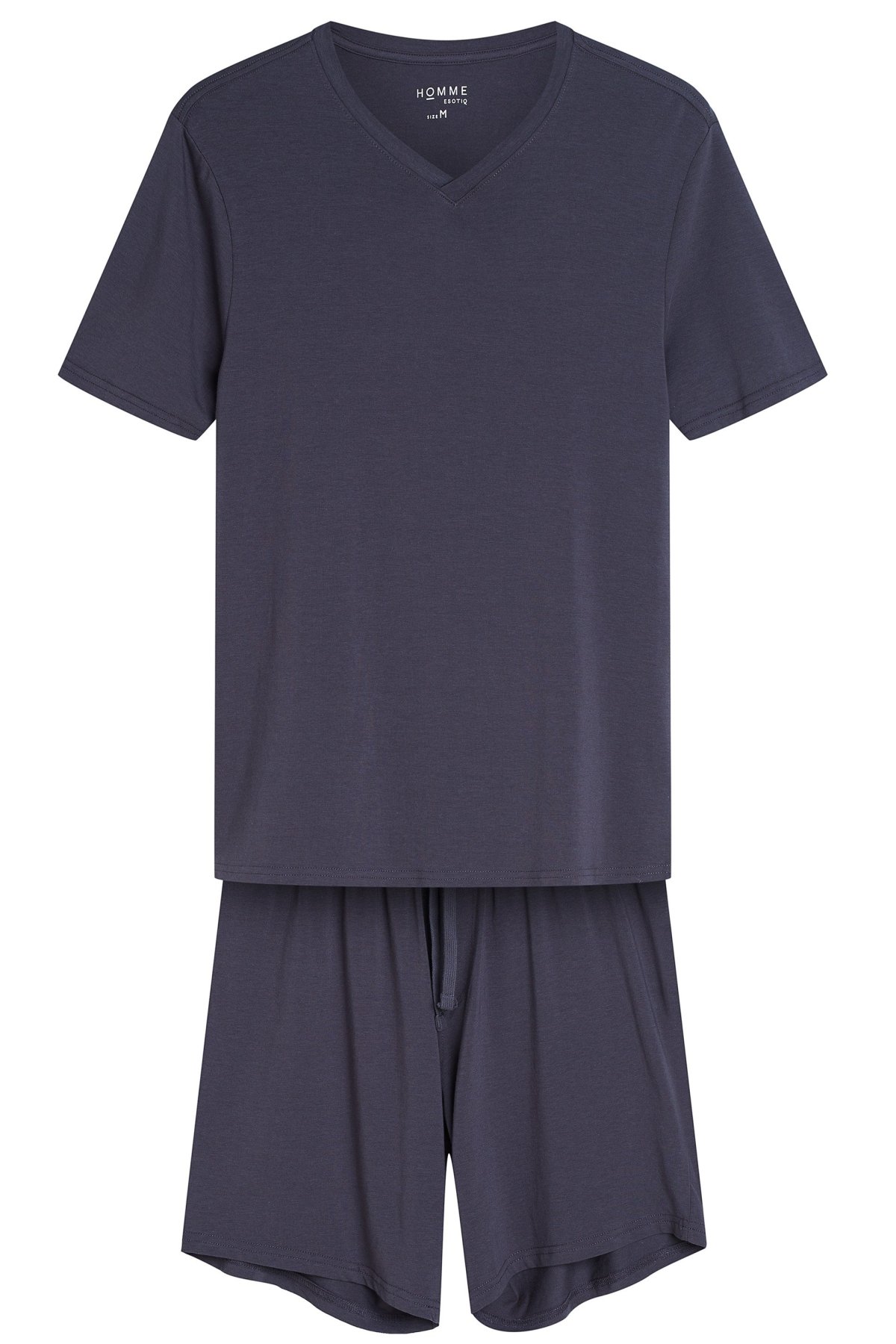 Tričko s krátkym rukávom má klasický strih, šortky sú voľné s pohodlnou gumou v páse a sťahovacími šnúrkami. Pyžamo je vhodné na spanie aj domáce nosenie.