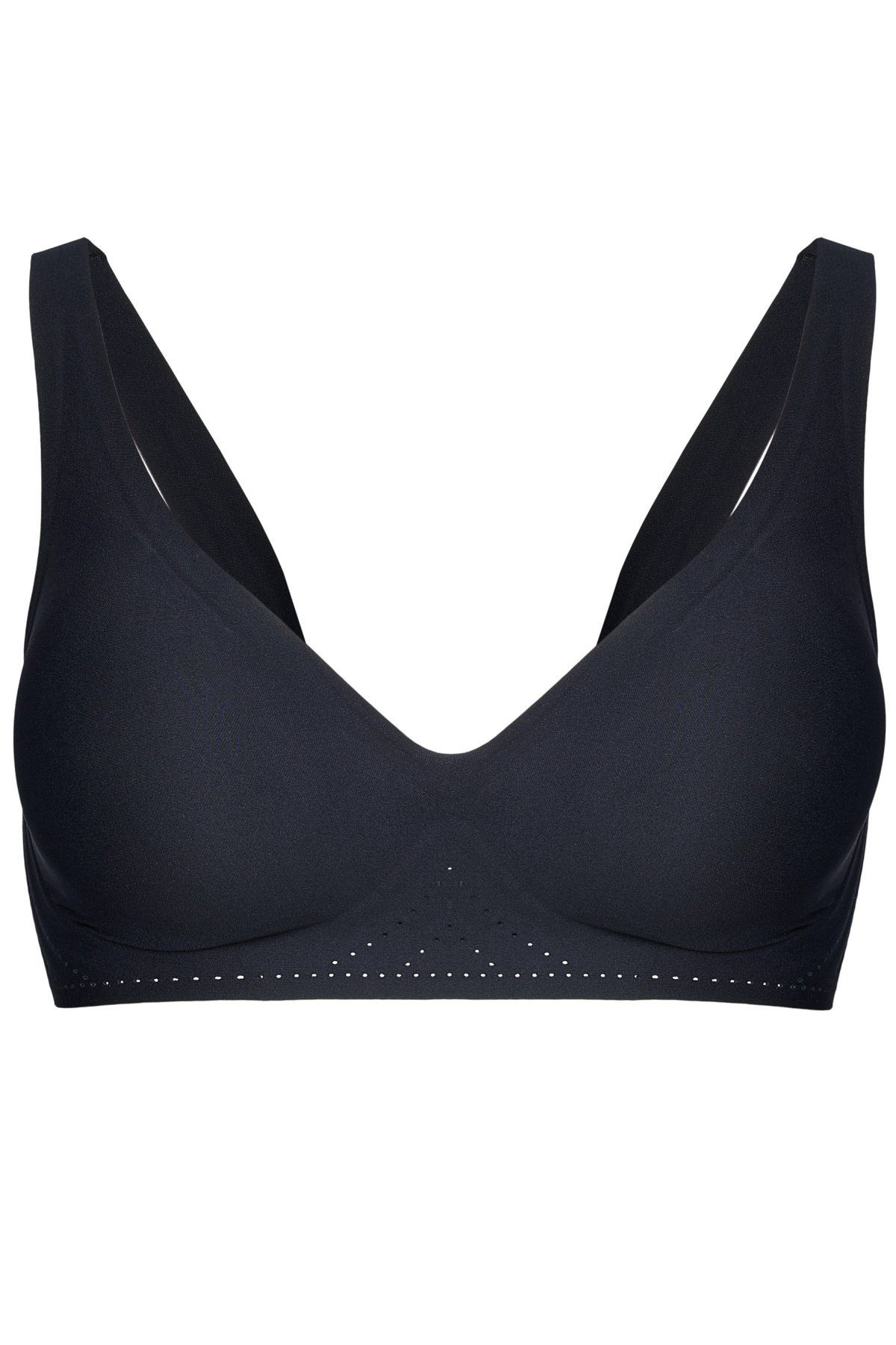 Bezšvová konštrukcia bez kostíc poskytuje maximálne pohodlie a voľnosť pohybu, zatiaľ čo vyberateľné vypchávky umožňujú prispôsobiť mieru zvýraznenia dekoltu podľa potreby. Hladký úplet s jemným leskom pôsobí čisto a moderne. Široký, elastický obvod s lepenými okrajmi pomáha vyhladiť líniu chrbta a zaisťuje stabilitu bez zarezávania. Diskrétne perforácie zvyšujú priedušnosť a komfort pri celodennom nosení.
