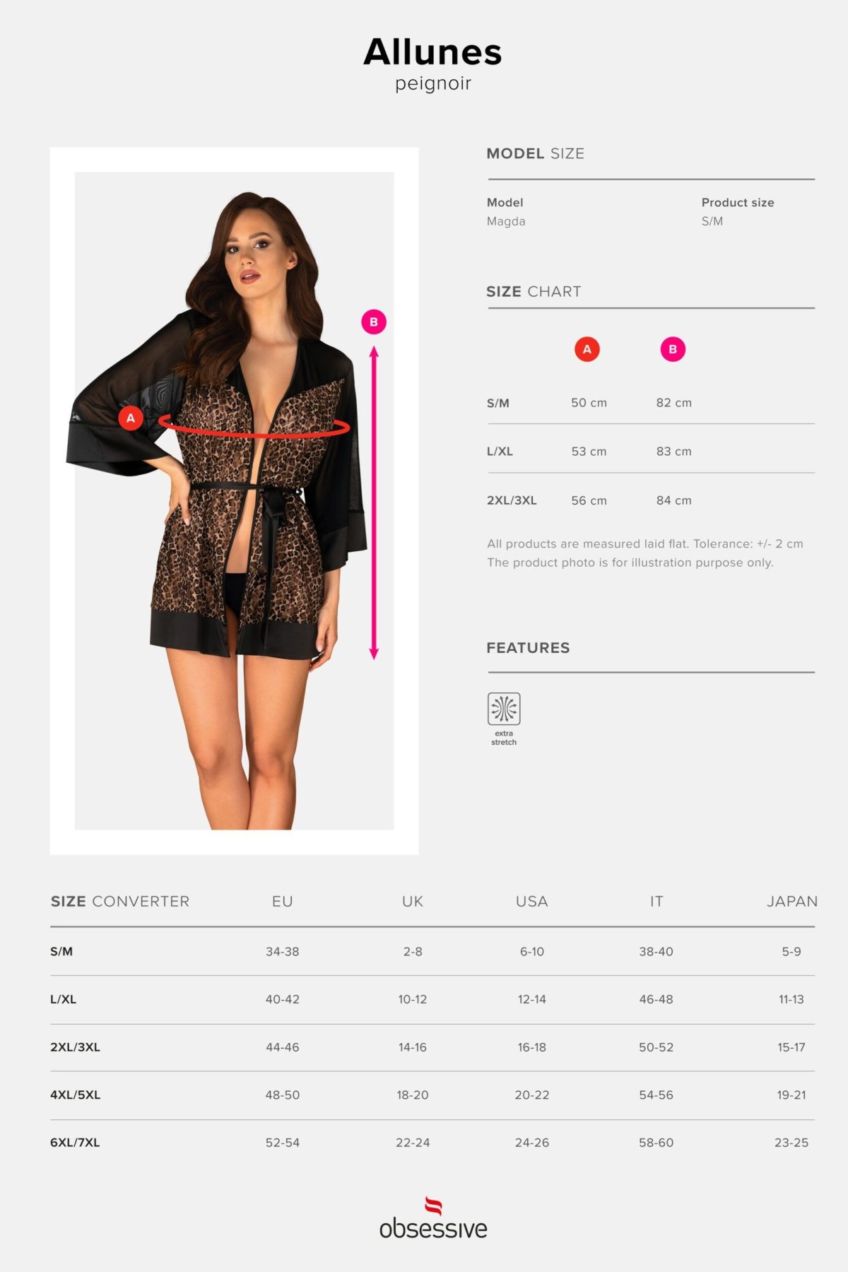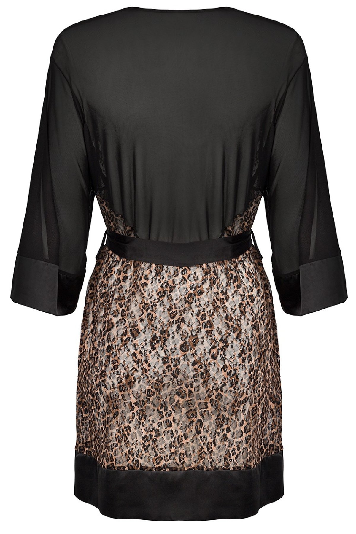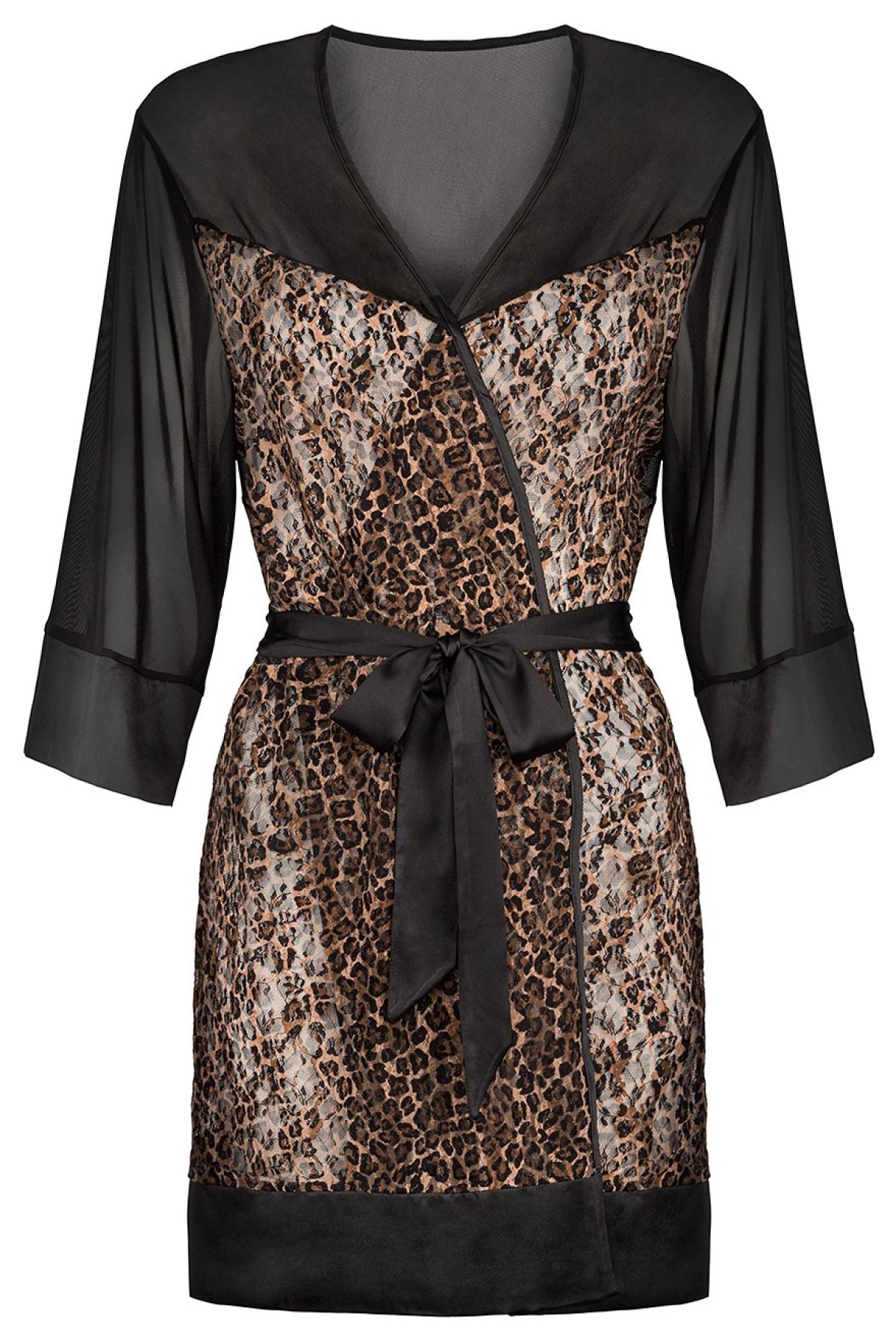 Tento krátky župan je dokonalou voľbou pre ženy, ktoré chcú spojiť eleganciu, zmyselnosť a pohodlie. Leopardí vzor dodáva modelu dravý nádych, zatiaľ čo priesvitný tyl na chrbte a rukávoch pôsobí nežne a zvodne. Široké rukávy a saténové lemy podčiarkujú luxusné vyhotovenie. Vďaka zaväzovaniu v páse sa župan ľahko prispôsobí vašej postave a zvýrazní ženské krivky. Je ideálny ako doplnok k nočnej bielizni, ale aj pre špeciálne večery, kedy chcete zažiariť. Tento model v sebe spája pohodlie jemného materiálu a vizuálny efekt, ktorý nenechá nikoho chladným.