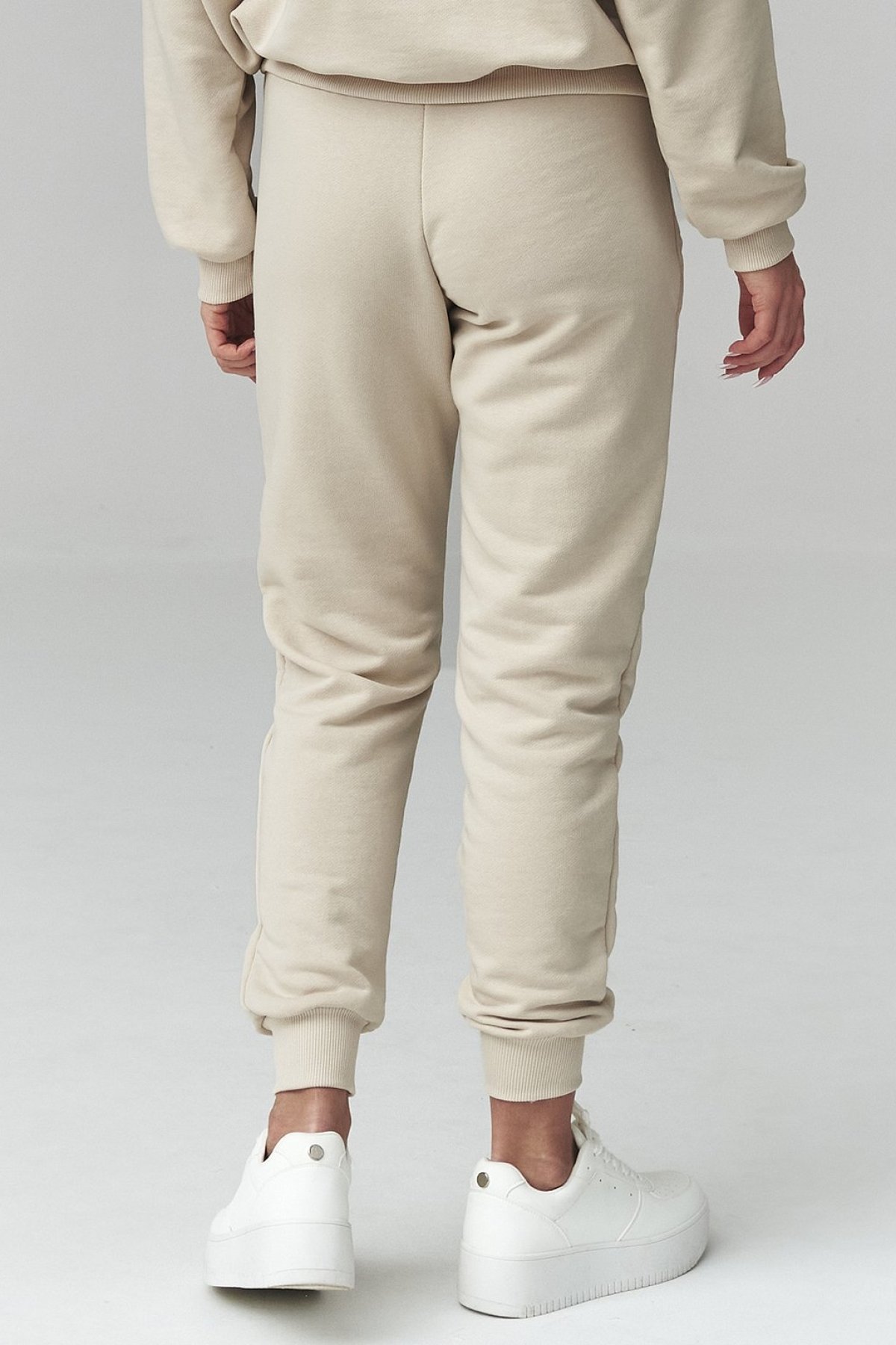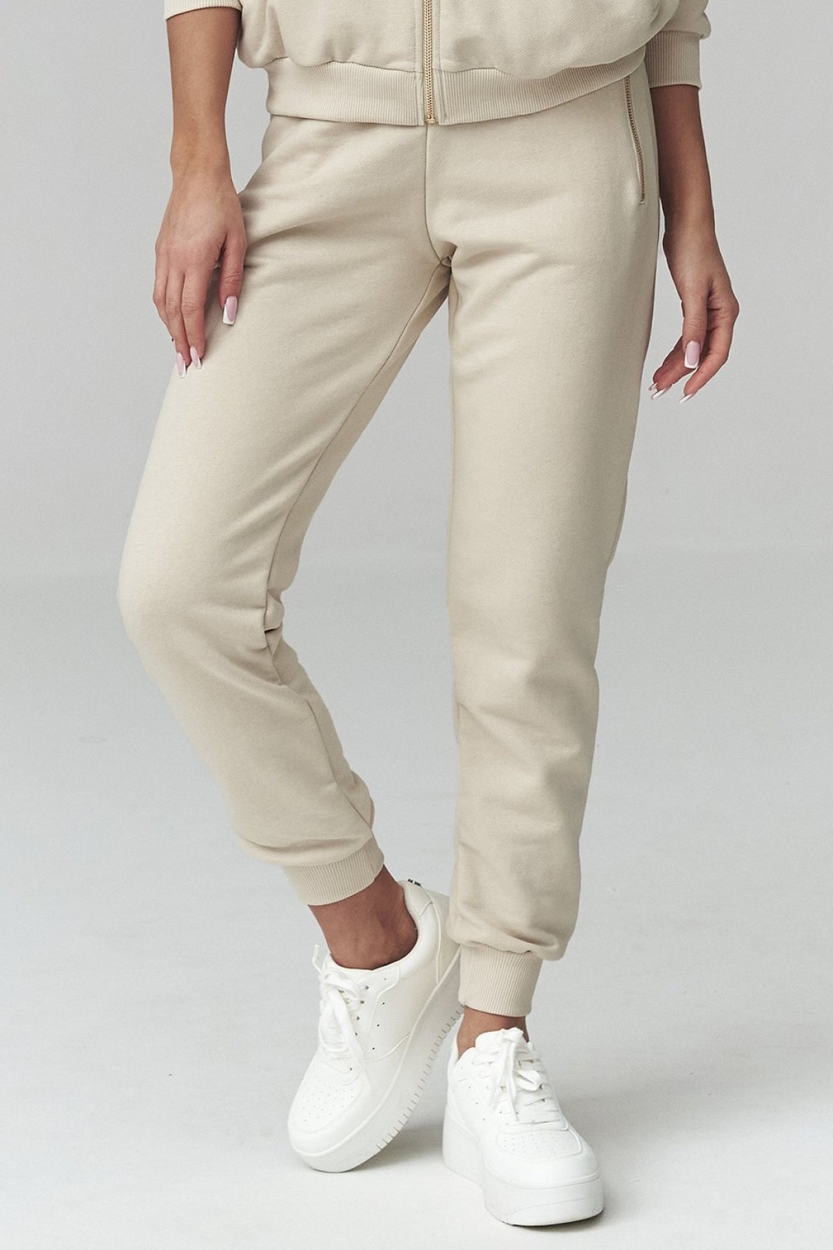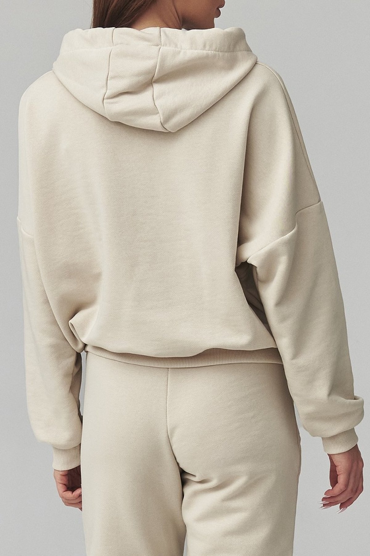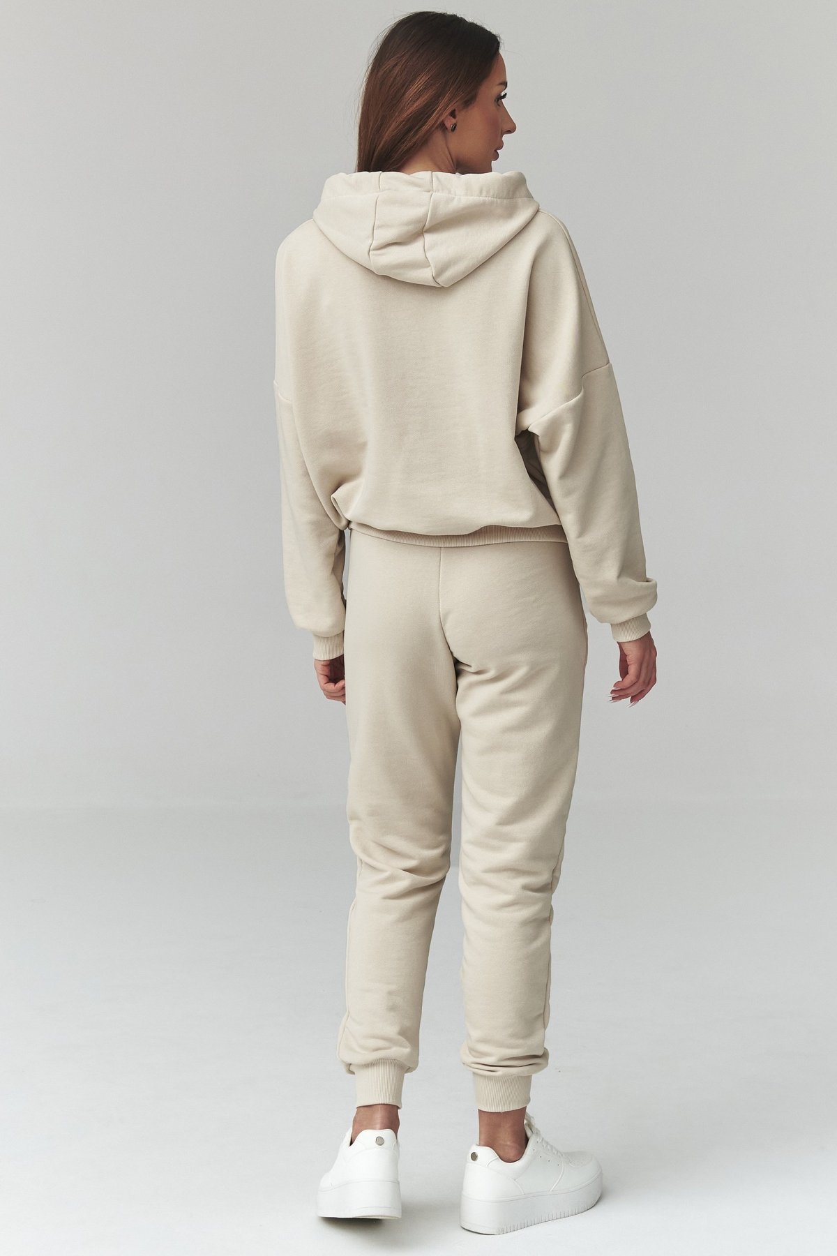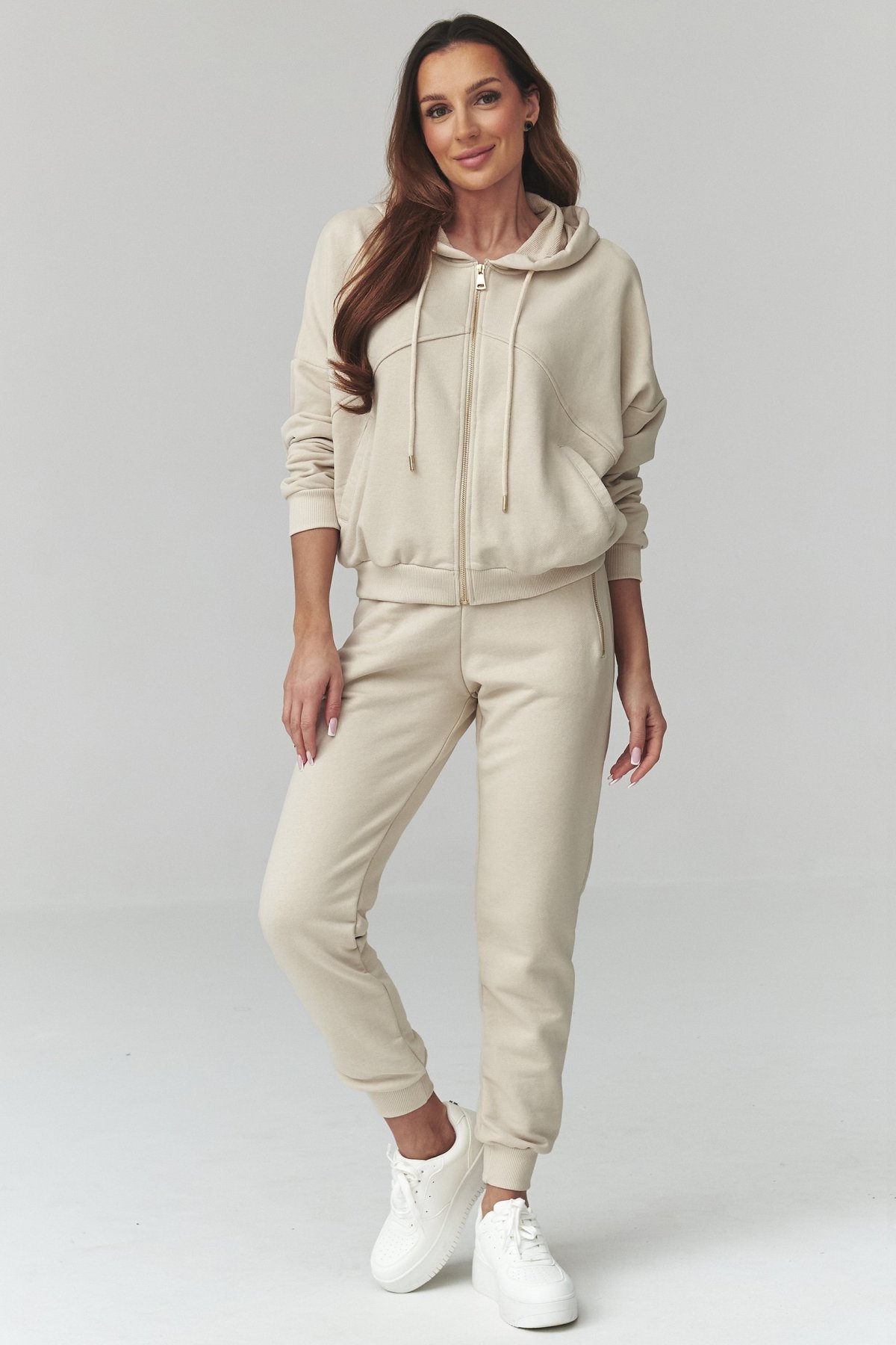 Dámská tepláková souprava ve světle béžovém odstínu. Je s kapucí, díky čemuž spojuje pohodlí, funkčnost a výrazný casual styl.