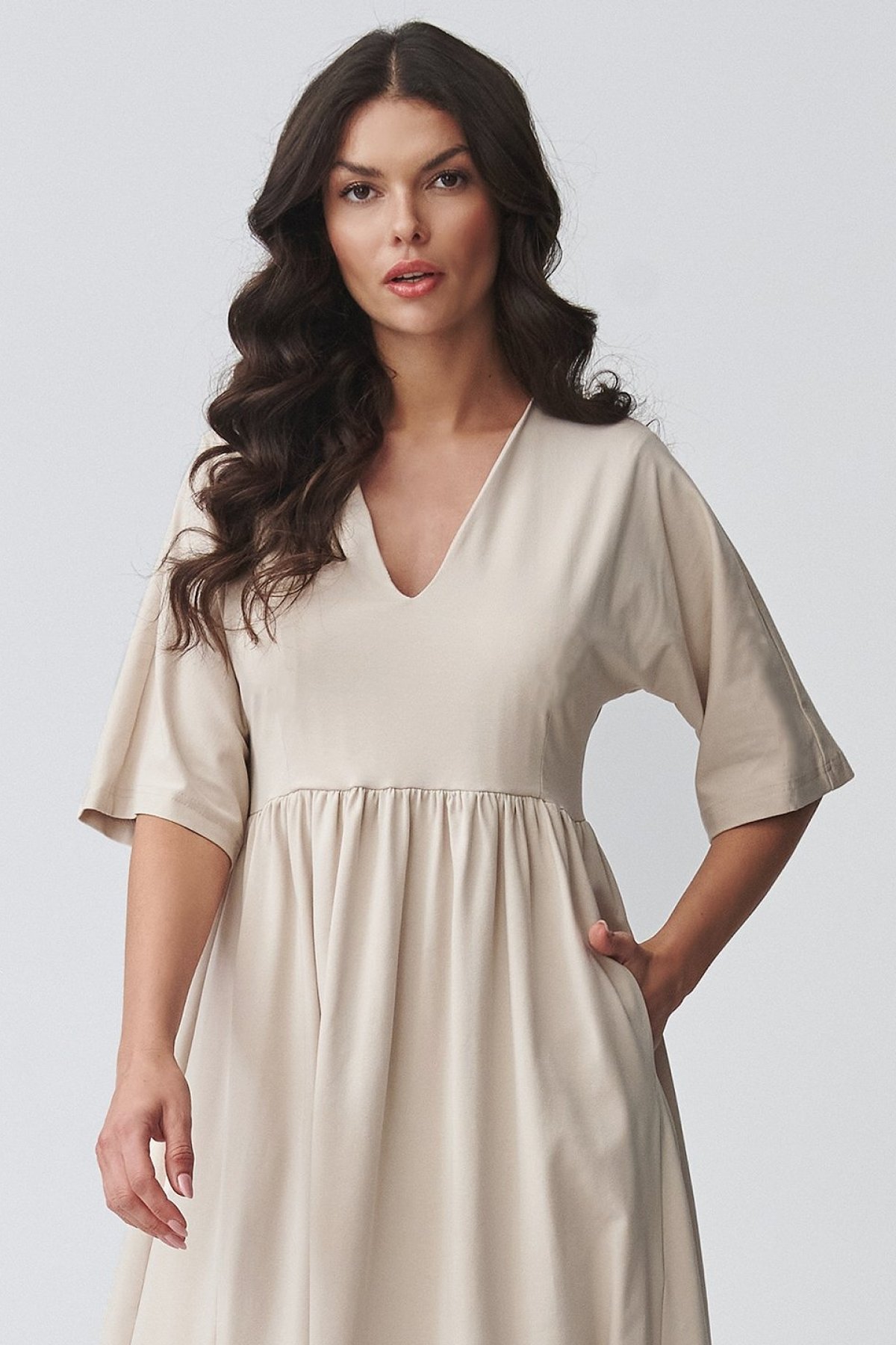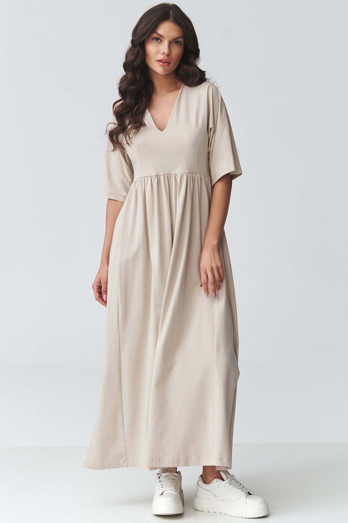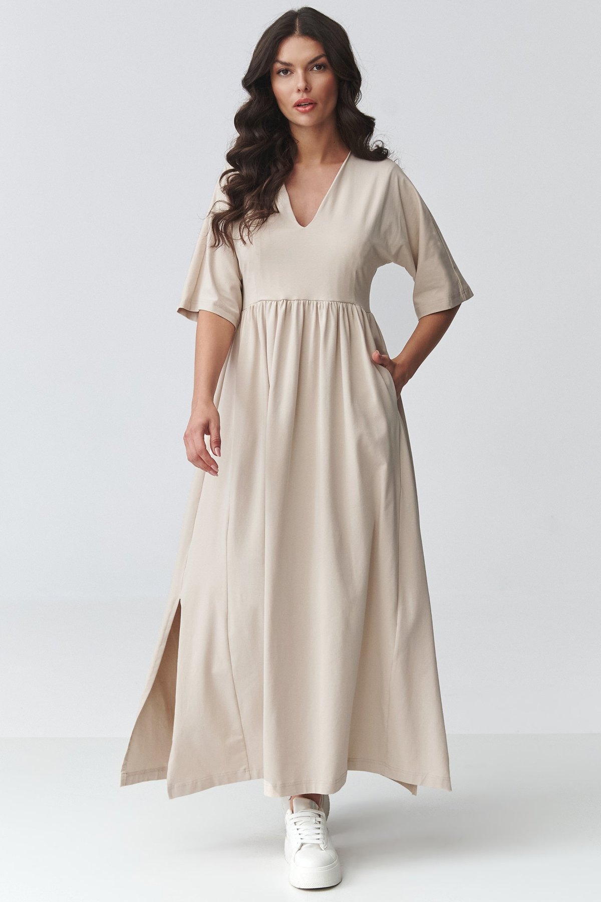 Dlouhé dámské šaty světle béžové barvy s výstřihem do V.