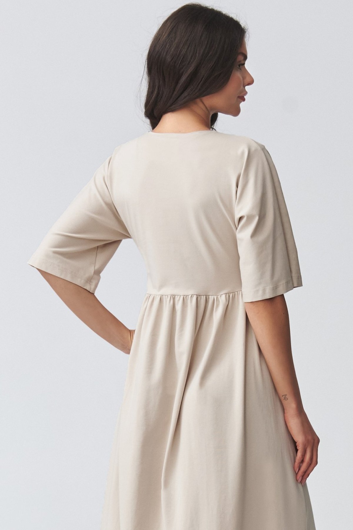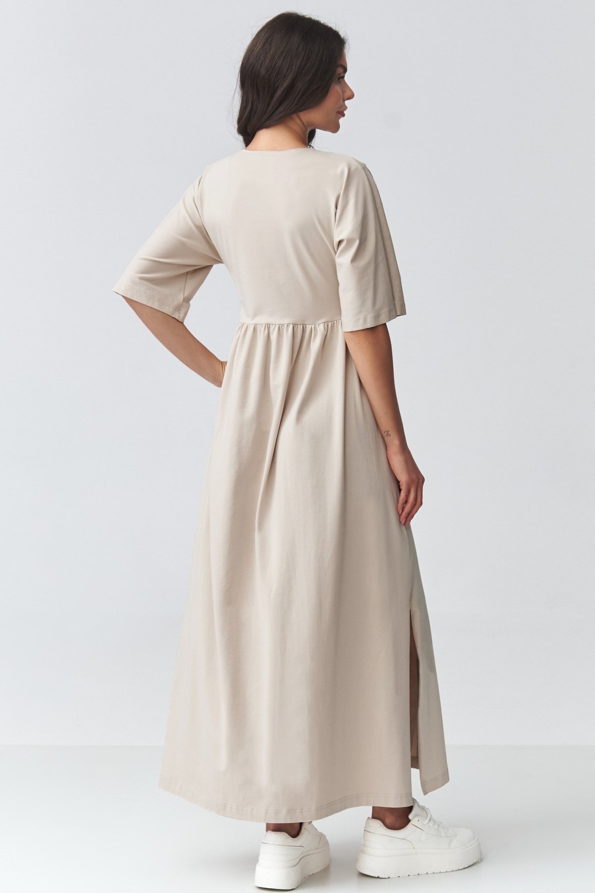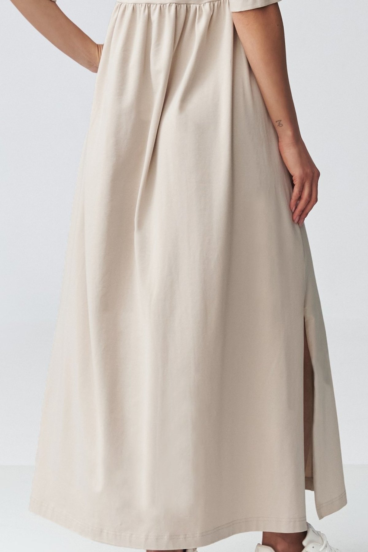 Působí lehce, čistě a velmi přirozeně. Volnější střih dopřává pohodlí při nošení, zatímco odstřižení pod prsy jemně zvýrazní horní linii postavy a dodá modelu ženský tvar. Krátké rukávy a rozparky po stranách přinášejí větší volnost pohybu a odlehčují celkový vzhled. Maxi délka dělá z tohoto kousku univerzální volbu na běžný den, do práce i na volnější společenské chvíle. Jednoduché provedení se snadno kombinuje se sneakersy, sandály i kotníkovými botami podle nálady a příležitosti.
