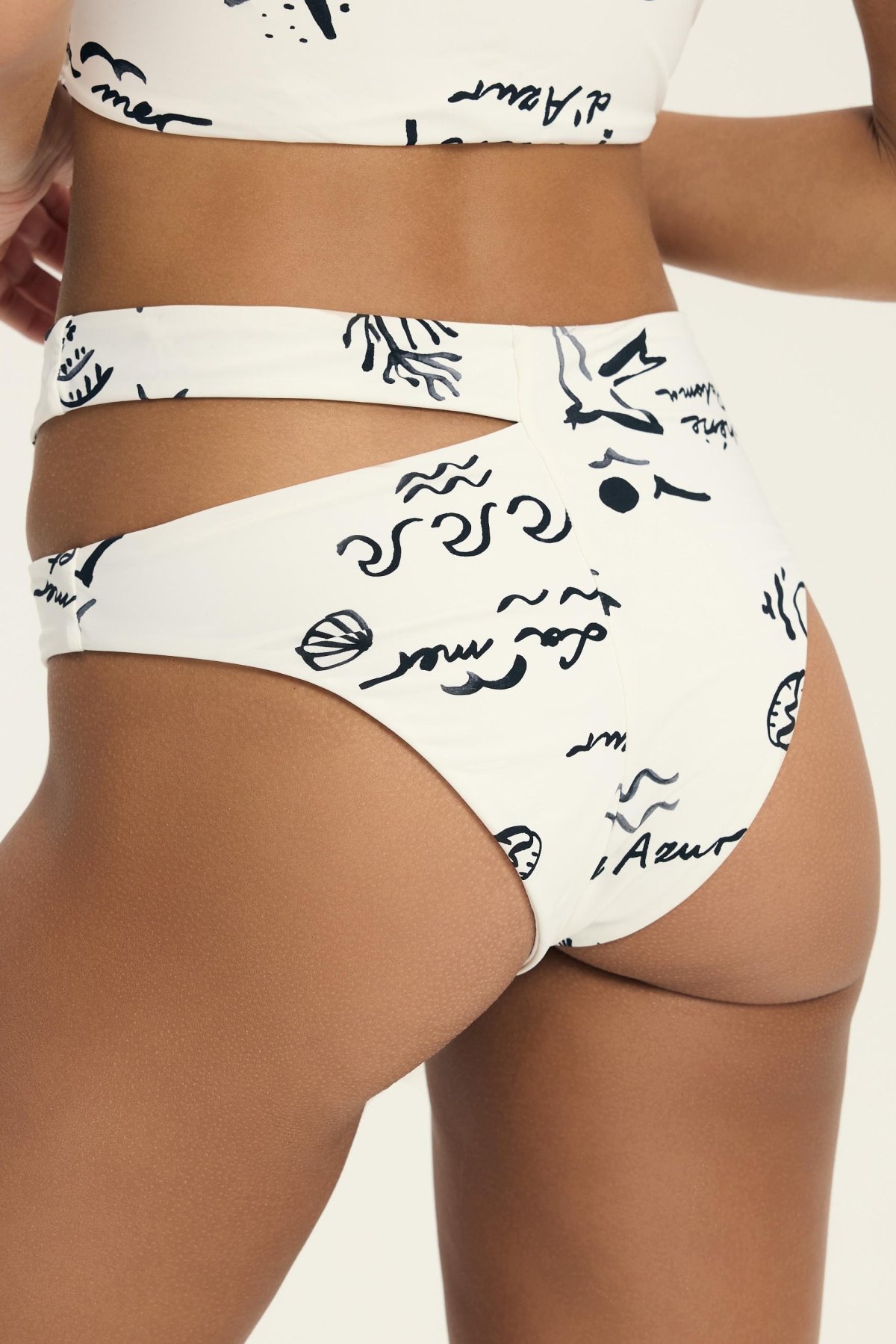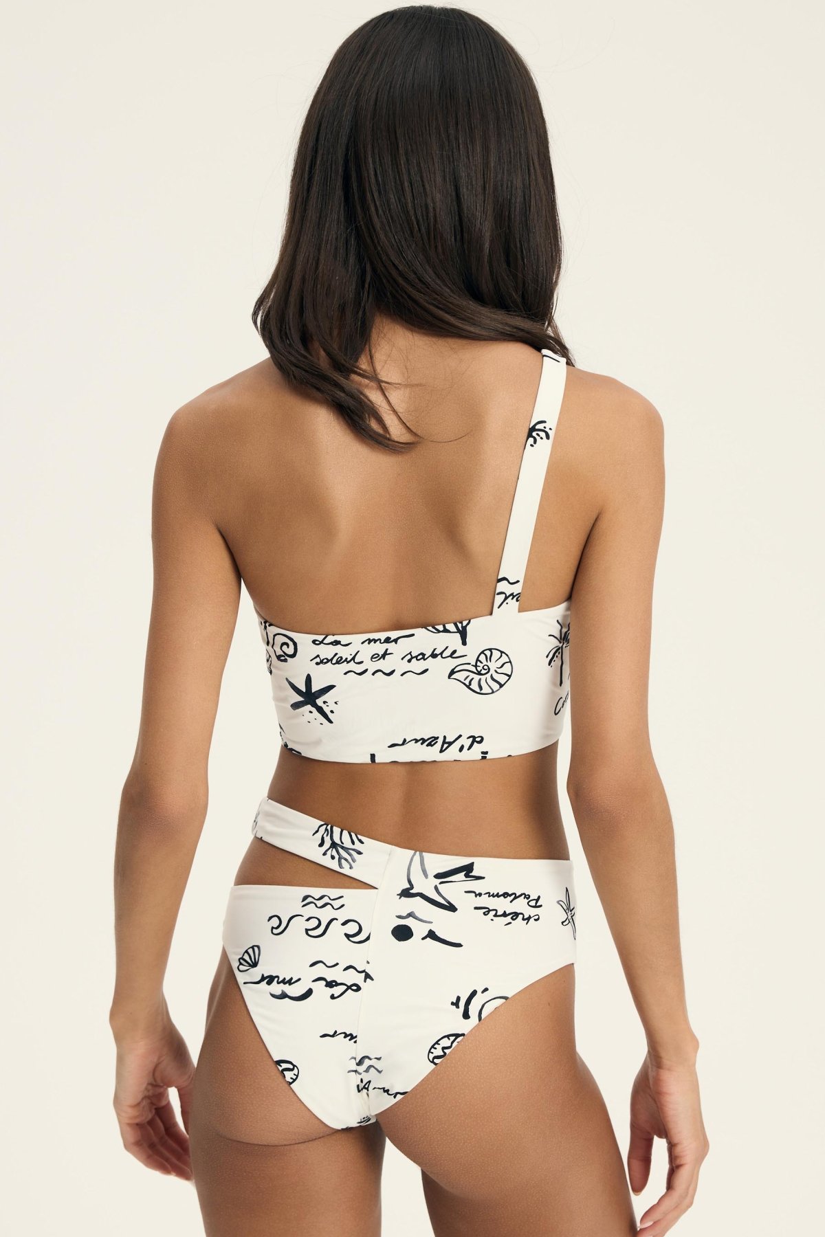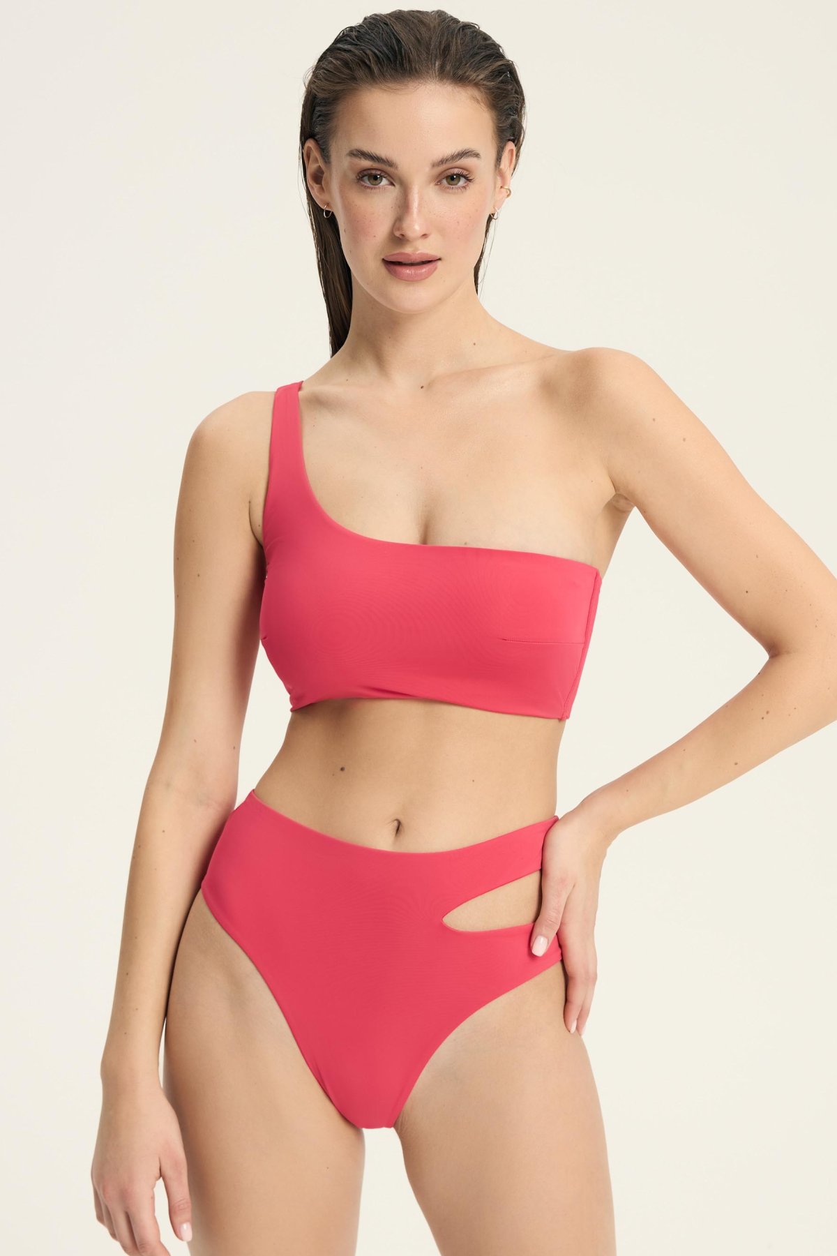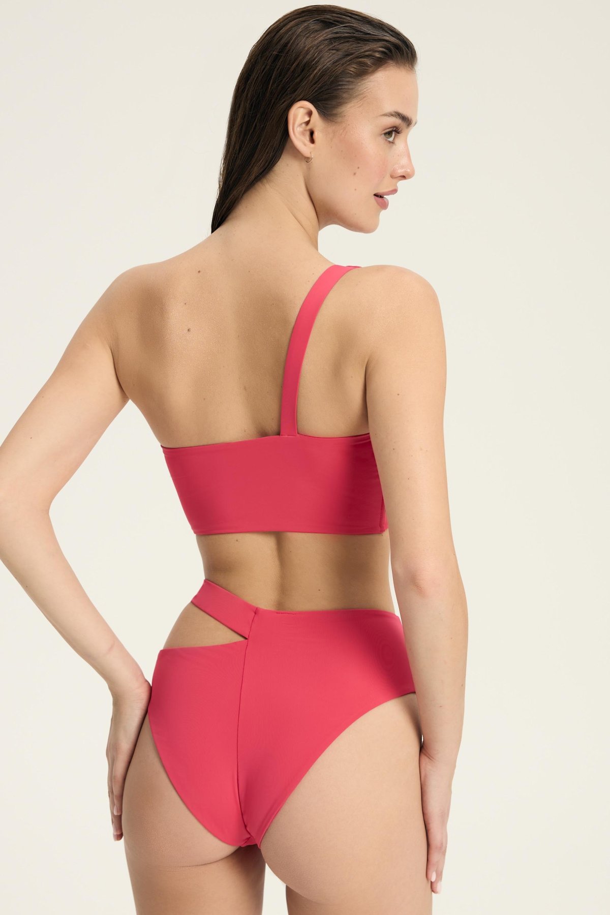 Spodní díl bikin Firenze zaujme čistým designem s výrazným detailem. Vysoký pas opticky prodlužuje nohy a zvýrazňuje linii pasu, zatímco asymetrický pás s průstřihem na pravé straně dodává modelu moderní, lehce odvážný akcent. Hladká, matná tkanina působí minimalisticky a nechává vyniknout střihu. Díky pružnému materiálu se kalhotky přizpůsobí postavě a drží na místě i při pohybu.