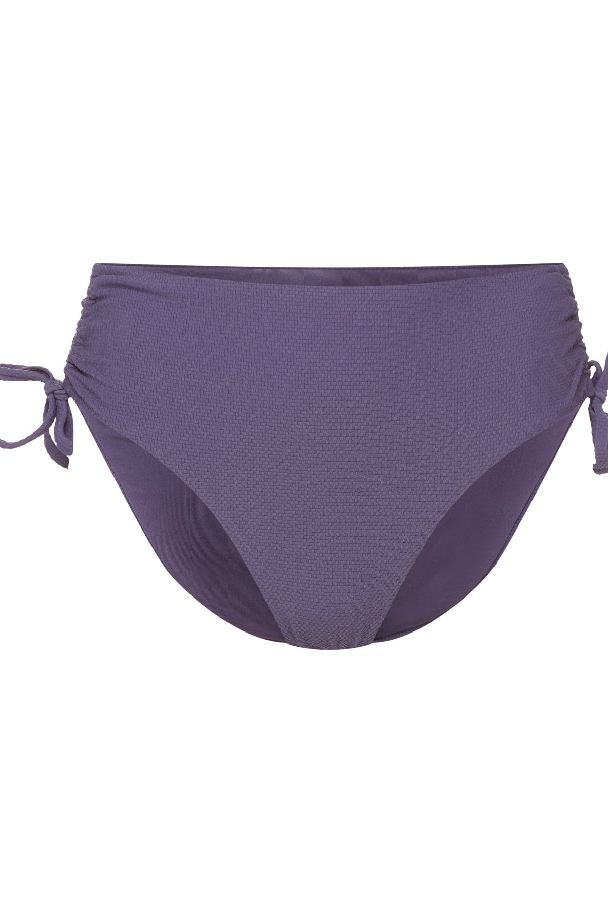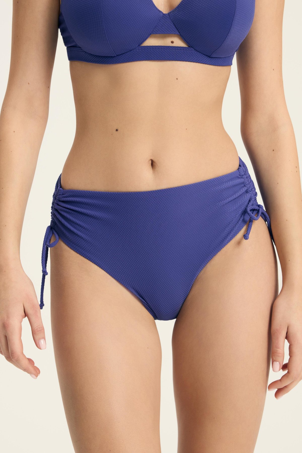 Spodní díl plavek zaujme čistým střihem a jemně strukturovaným materiálem. Vyšší linie pasu spolu s řasením na bocích působí lichotivě, zatímco boční šňůrky umožňují lehce upravit výšku vykrojení podle toho, jak vám vyhovuje. Sytě modrá barva dodává modelu výrazný, ale stále elegantní vzhled.