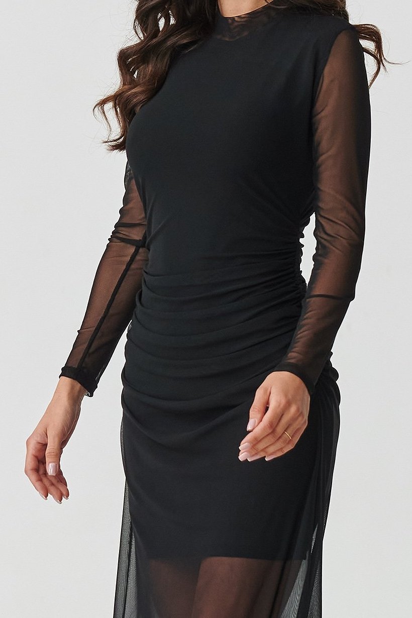 Přiléhavý střih půvabně zvýrazňuje siluetu, průsvitné rukávy a tylové zakončení sukně dodávají modelu lehkost a sofistikovaný šarm. Poloprůhledný spodní díl vytváří decentní, avšak výrazný efekt, který působí mimořádně žensky. Díky příjemnému, pružnému materiálu se šaty pohodlně nosí a krásně přizpůsobí postavě.