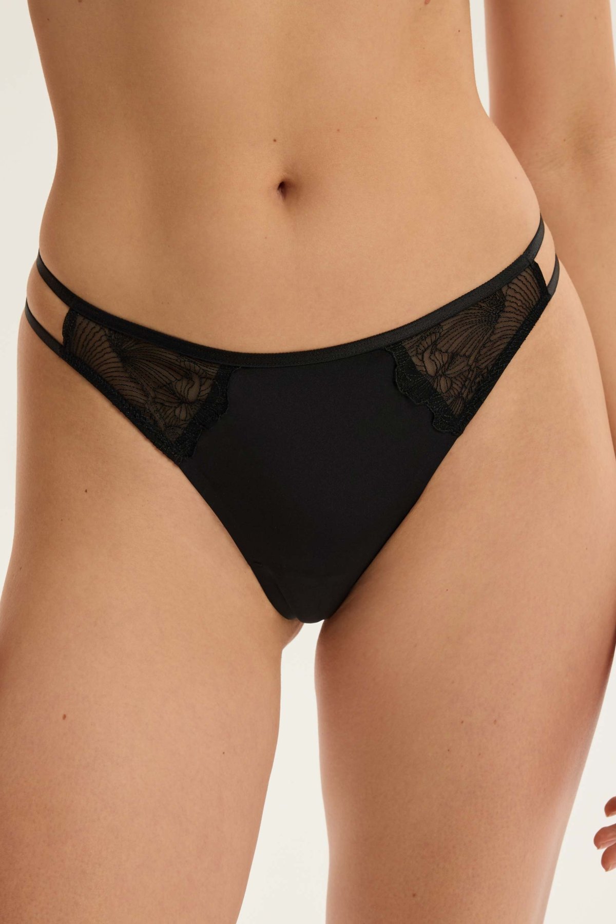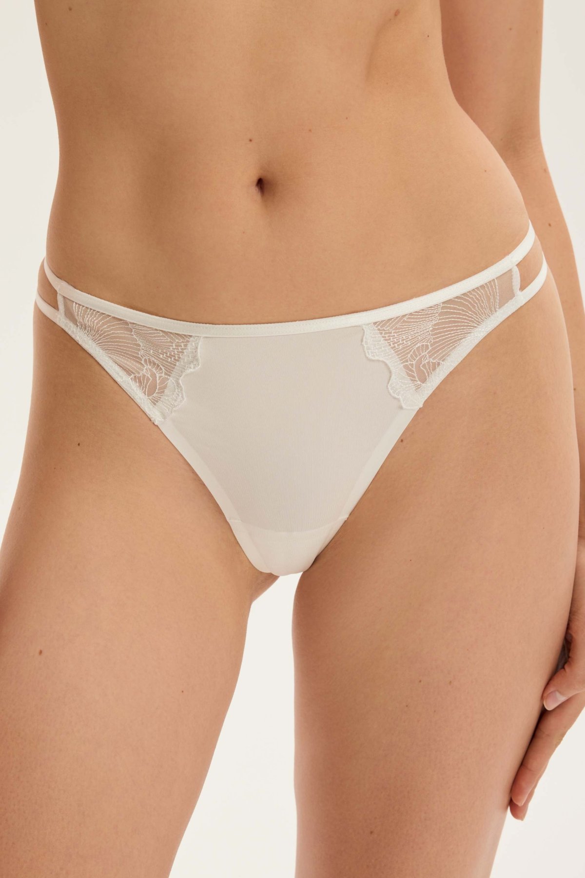 Dámská tanga Bluey působí jemně a čistě, přitom zaujmou propracovanými detaily. Přední část doplňují vsadky z transparentní síťoviny s výšivkou, která modelu dodává lehkost. Zadní díl je výrazně vykrojený a díky chybějícímu středovému švu působí hladčeji. Pas tvoří tenké pružné pásky, které podtrhují vzdušný vzhled modelu. Pro pohodlné nošení je v rozkroku bavlněná podšívka.