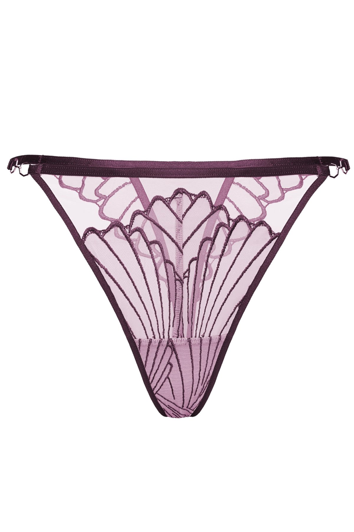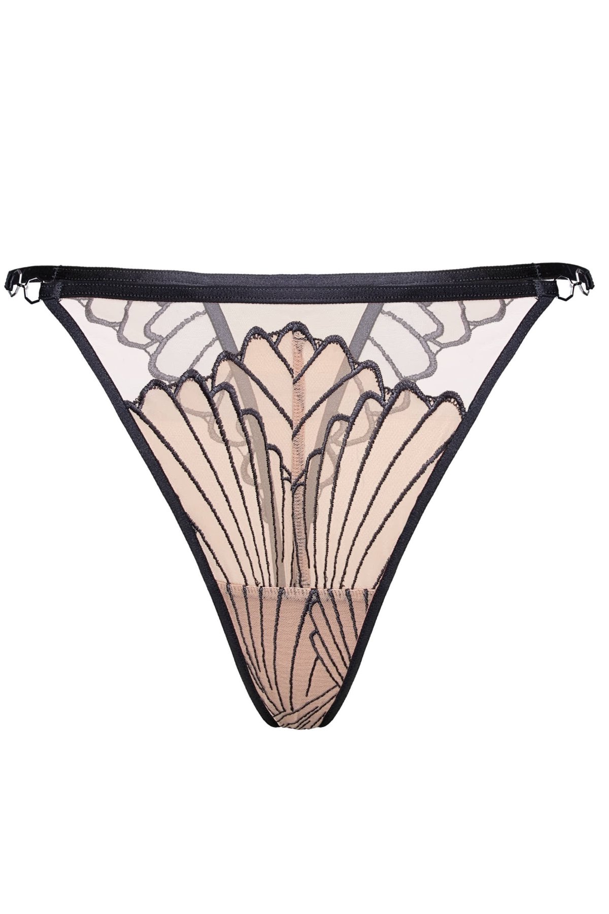 Tanga Nugat zaujmou výrazným kontrastem síťoviny a výšivky, kde tmavá výšivka kreslí na světlé síťovině jemně grafický vzor. Lehký, průsvitný materiál nechává vyniknout siluetu a působí vzdušně na těle. Úzké boční pásky odlehčují celkový vzhled a nechávají vyniknout liniím boků. Kompozice vzoru opticky směřuje k pasu a vytváří moderní, čistý efekt. Bavlněný klínek zajišťuje příjemné nošení i při celodenním kontaktu s pokožkou.