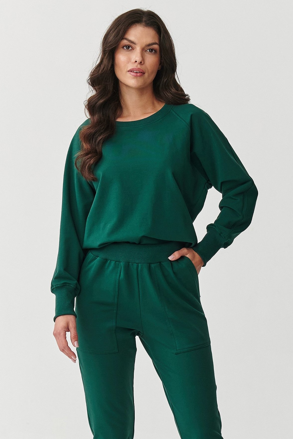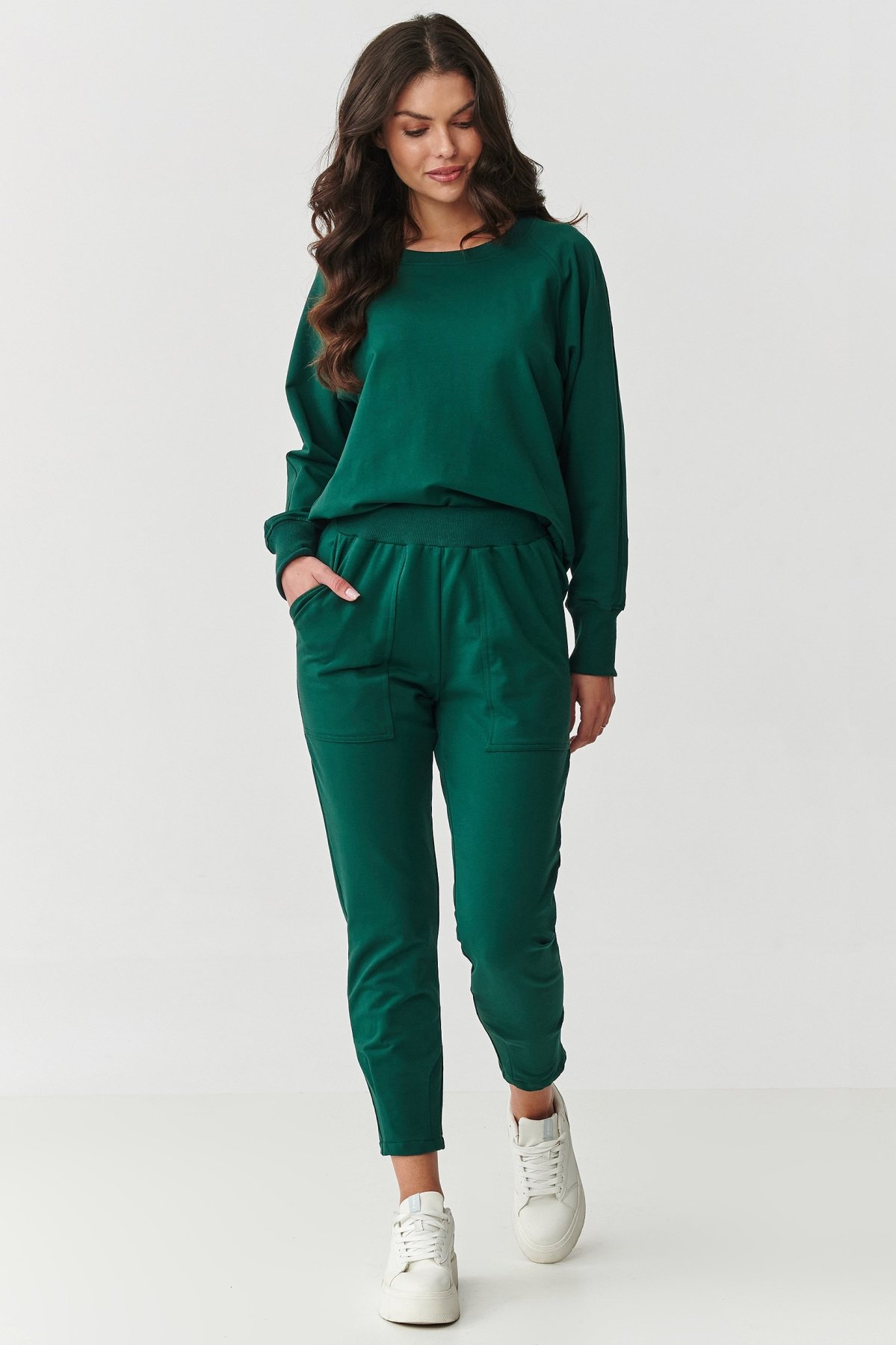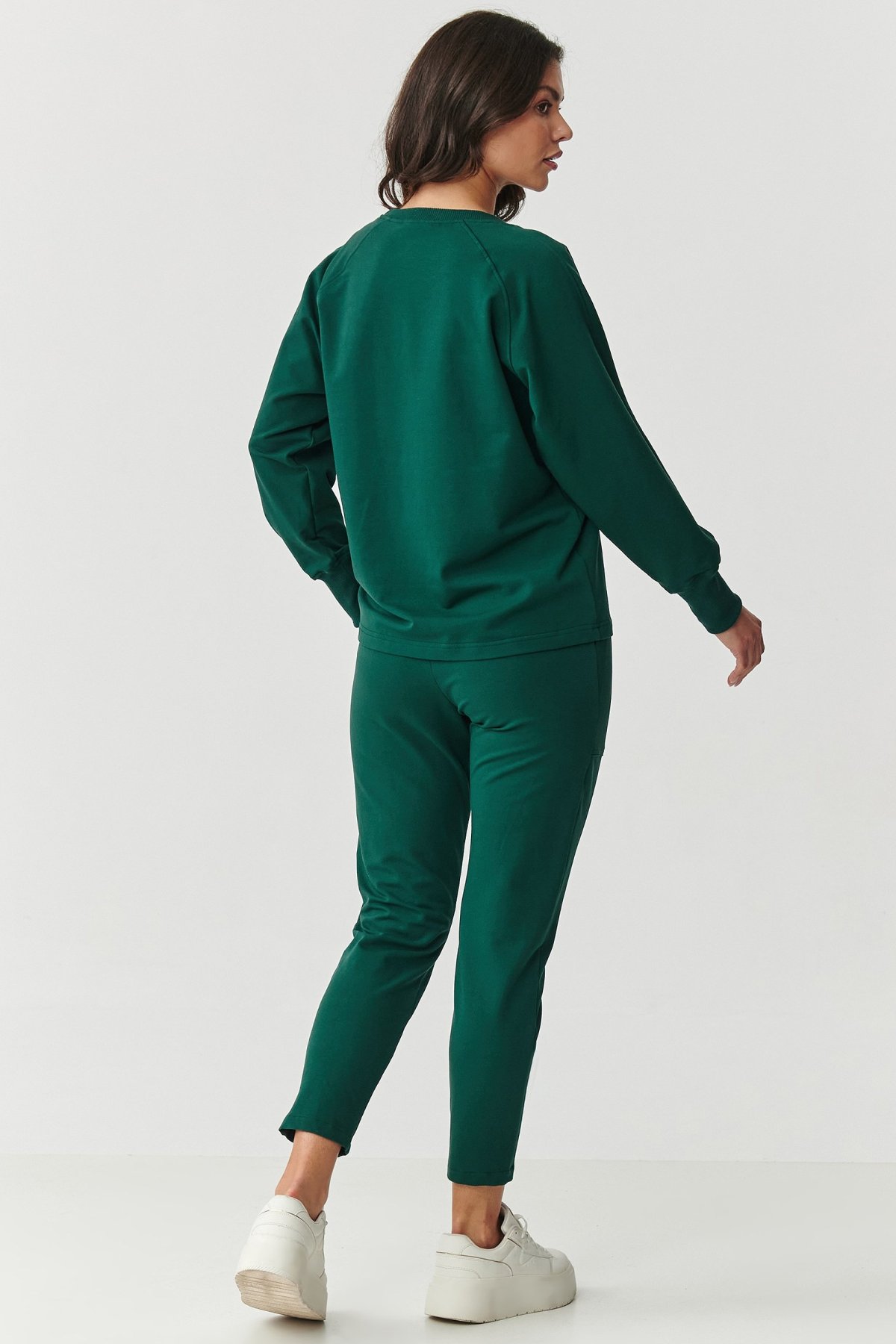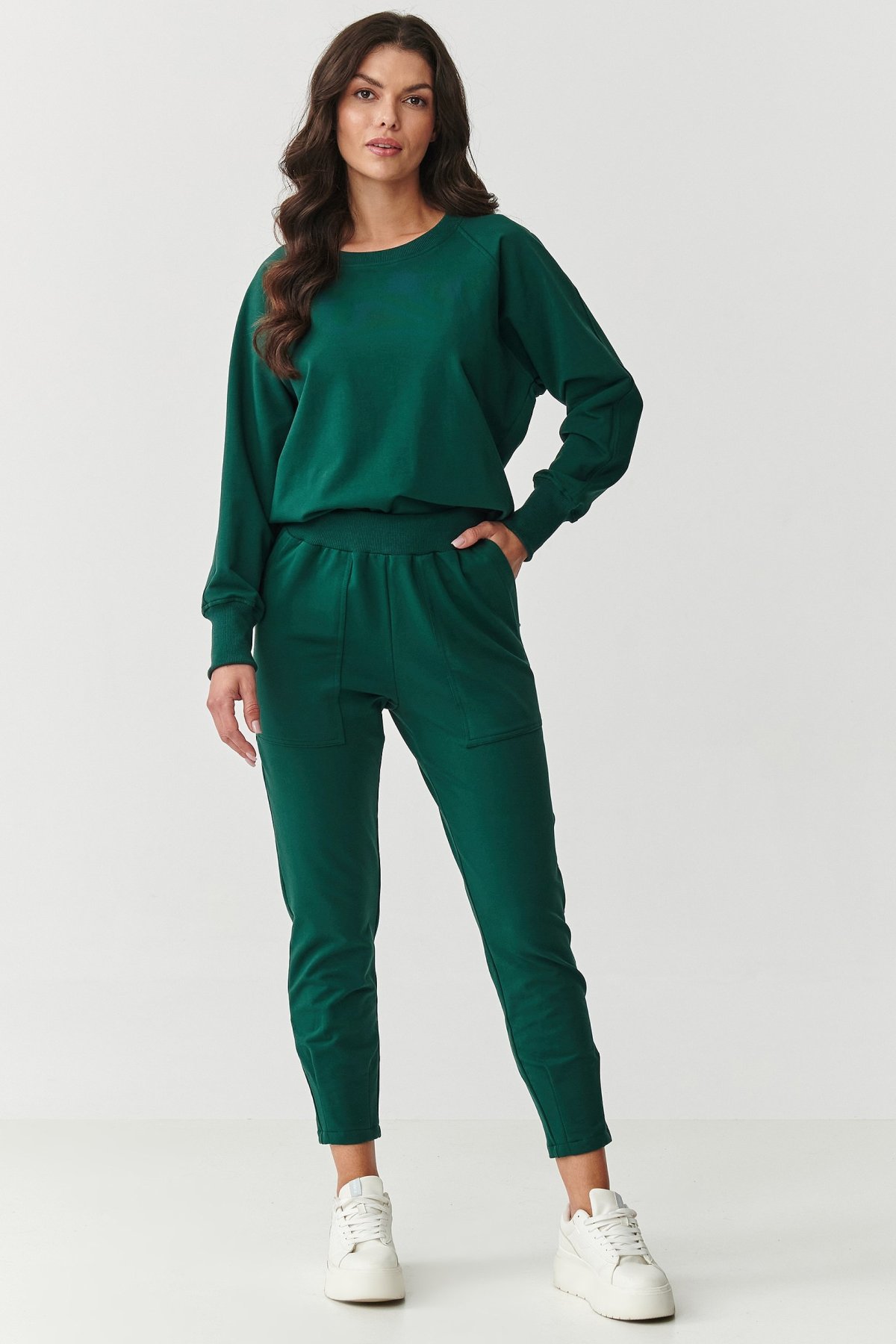 Pohodlná a stylová teplákovka! Perfektní pro ženy milující pohodlí, které však nechtějí rezignovat na moderní look. Je vyrobena z velmi kvalitní tkaniny, spojení bavlny a elastanu zaručuje jemnost, elasticitu a trvanlivost, díky tomu je komplet perfektní pro využití na doma, ale také na procházku, nákupy nebo do práce. Mikina má klasický střih s dlouhými rukávy, na jejichž koncích jsou elastické manžety. Ty tvoří sportovní prvek. Zato kulatý dekolt zvýrazňuje univerzálnost teplákovky. Klasické tepláky jsou pohodlné, díky svému střihu a prostorným kapsám nejen, že dobře vypadají, ale jsou také velice praktické. Na nohavicích jsou navíc záševky, které dodávají elegantní nádech, navíc se směrem dolů zužují. Komplet nežmolkatí, dobře snáší praní v pračce, uchovává si svůj tvar. Proto vám bude dobře sloužit, více než několik sezón. Vybírat můžete z mnoha sympatických barevných variant. Oblékněte stylový šmrnc, nebojte se tepláků a mikiny! Zamilujete si je.