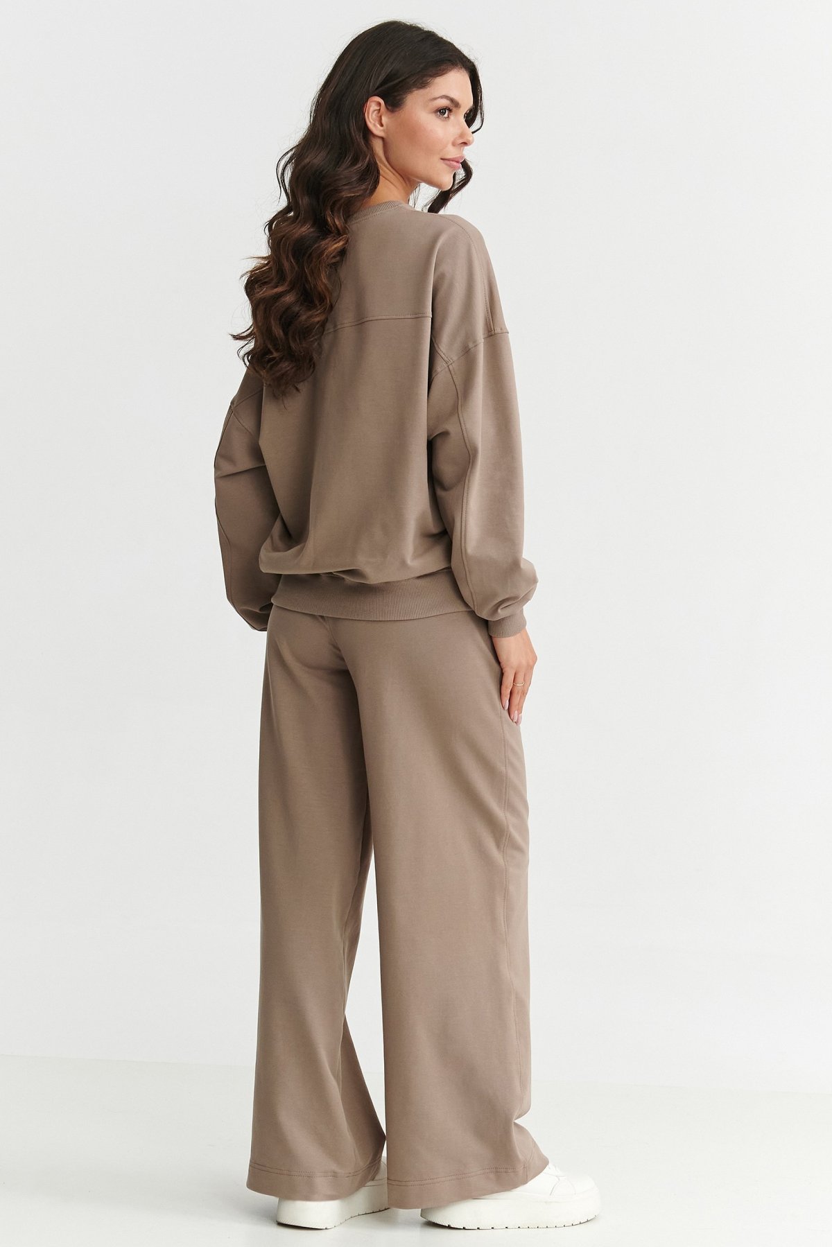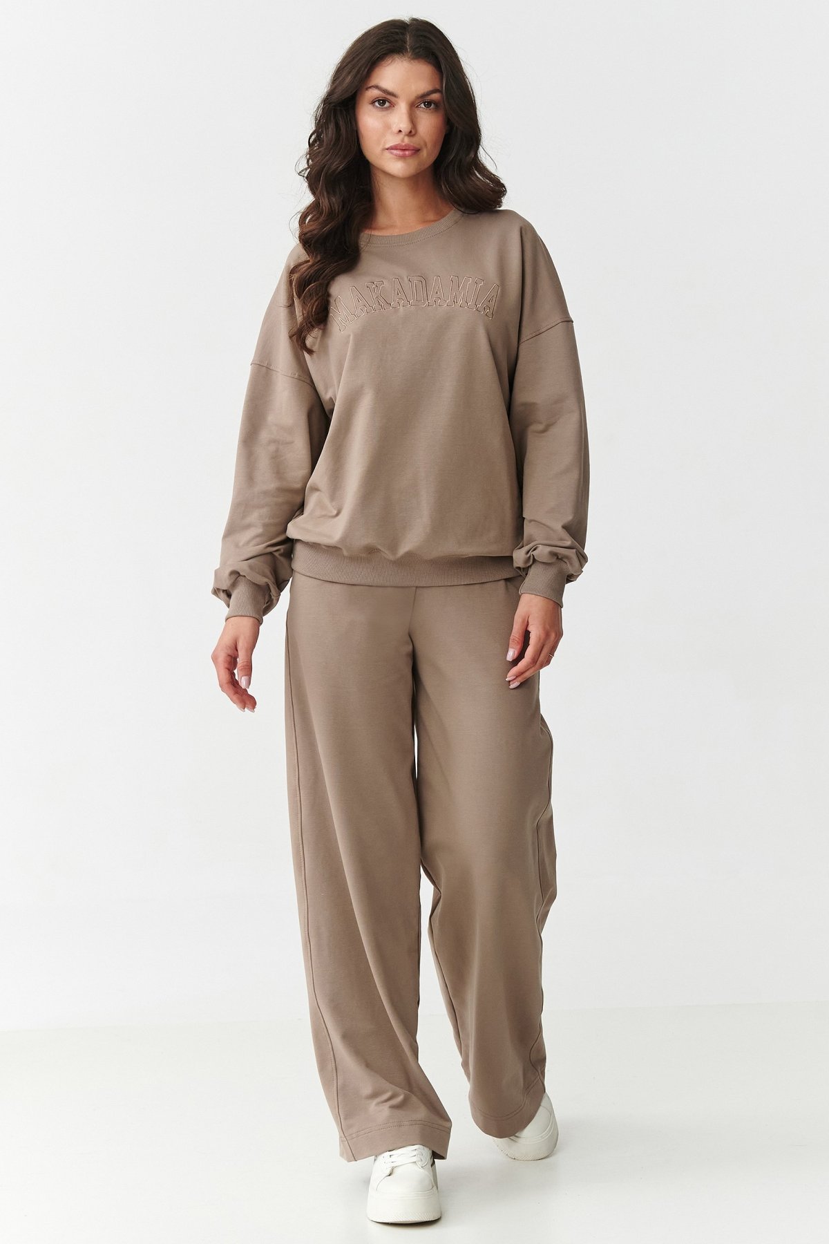 Vsaďte na perfektní spojení pohodlí a moderního vzhledu! Dámská tepláková souprava, která se hodí pro každodenní nošení, ale využijete ji i na neformální schůzky nebo jen tak pro domácí relax. Souprava je vyrobena z kombinace bavlny a elastanu. Díky tomu je zaručeno pohodlí a perfektní přizpůsobení křivkám. Mikina má klasický střih s kulatým dekoltem. Lehce snížená linie ramen vypadá žensky a stylově. Mírně oversize styl působí svěže a moderně. Výšivka na přední straně dodává ten správný šmrnc. Kalhoty jsou výjimečné samy o sobě. Mají totiž poměrně široký střih nohavic. Hezky se prezentují na křivkách v pohybu. Dodávají postavě lehkost a souměrnost. Pružný pas a praktické kapsy zvyšují jedinečnost modelu. Teplákovku si můžete vybrat ve vhodné barvě, která podtrhne vaši individualitu. Každá si najde tu pravou. Ideální komplet pro každé roční období.