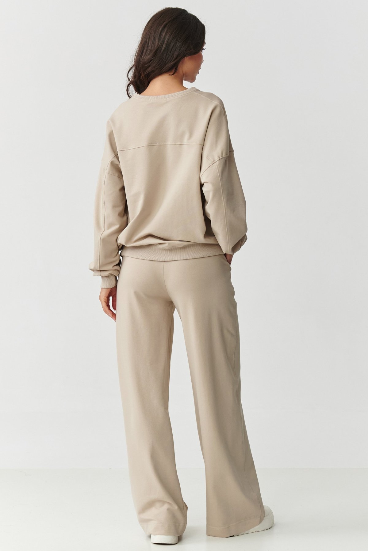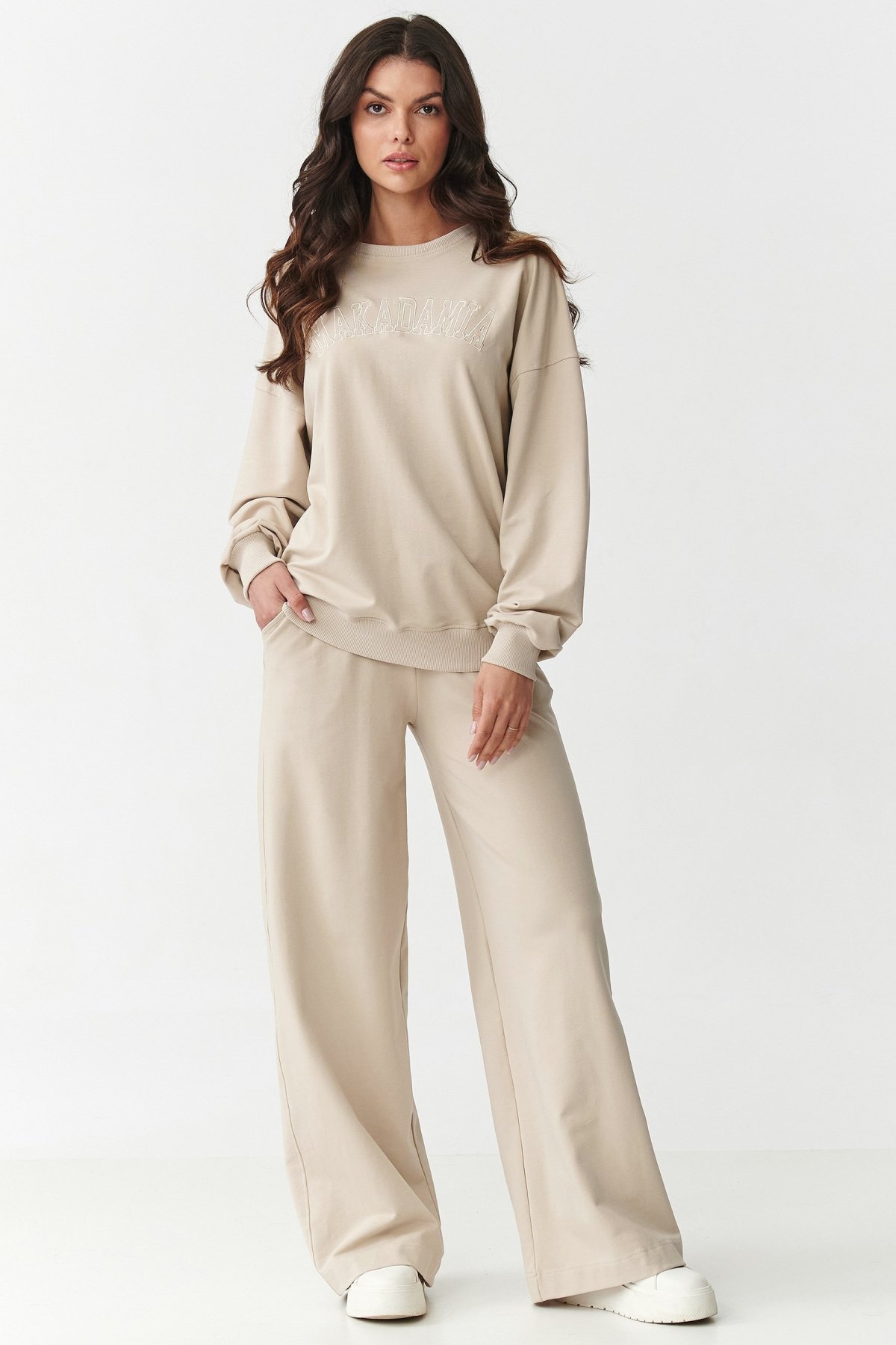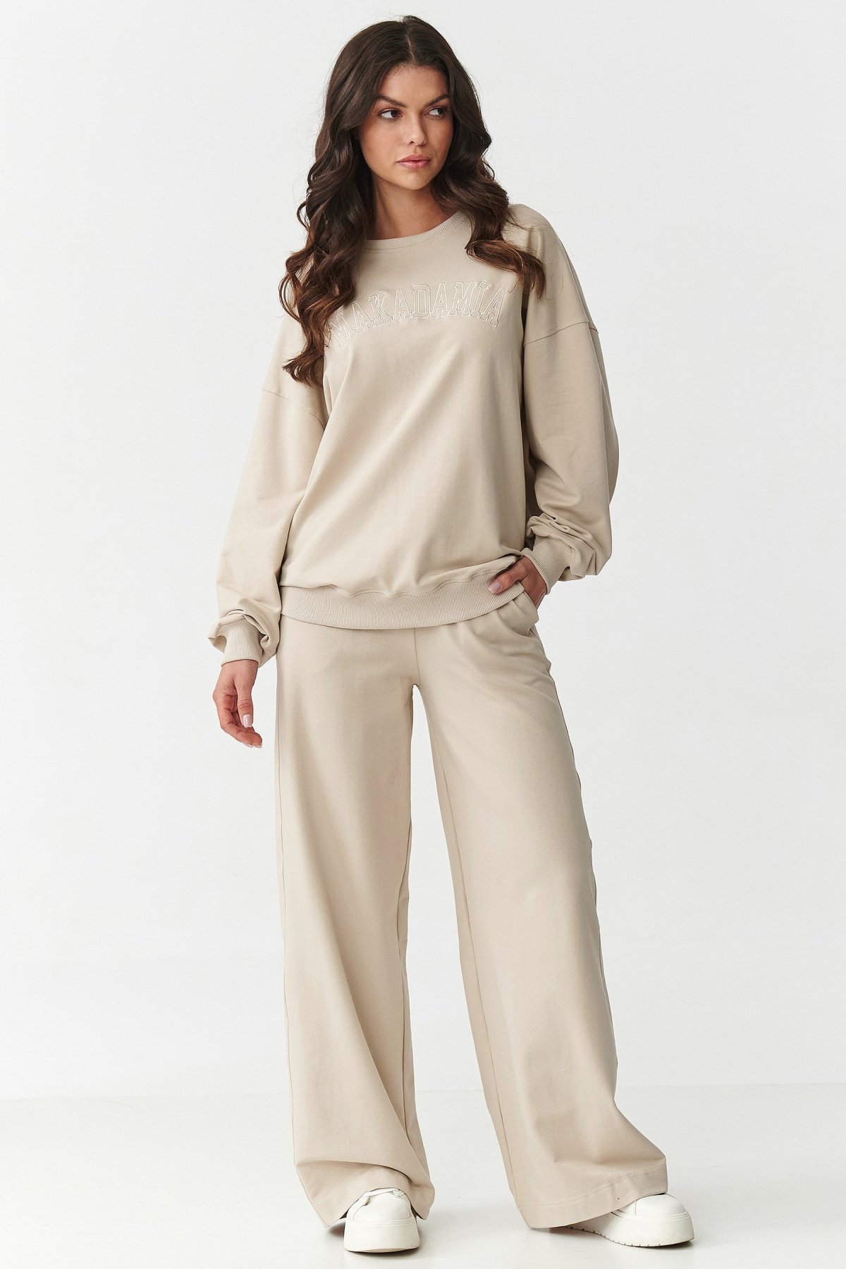 Vsaďte na perfektní spojení pohodlí a moderního vzhledu! Dámská tepláková souprava, která se hodí pro každodenní nošení, ale využijete ji i na neformální schůzky nebo jen tak pro domácí relax. Souprava je vyrobena z kombinace bavlny a elastanu. Díky tomu je zaručeno pohodlí a perfektní přizpůsobení křivkám. Mikina má klasický střih s kulatým dekoltem. Lehce snížená linie ramen vypadá žensky a stylově. Mírně oversize styl působí svěže a moderně. Výšivka na přední straně dodává ten správný šmrnc. Kalhoty jsou výjimečné samy o sobě. Mají totiž poměrně široký střih nohavic. Hezky se prezentují na křivkách v pohybu. Dodávají postavě lehkost a souměrnost. Pružný pas a praktické kapsy zvyšují jedinečnost modelu. Teplákovku si můžete vybrat ve vhodné barvě, která podtrhne vaši individualitu. Každá si najde tu pravou. Ideální komplet pro každé roční období.