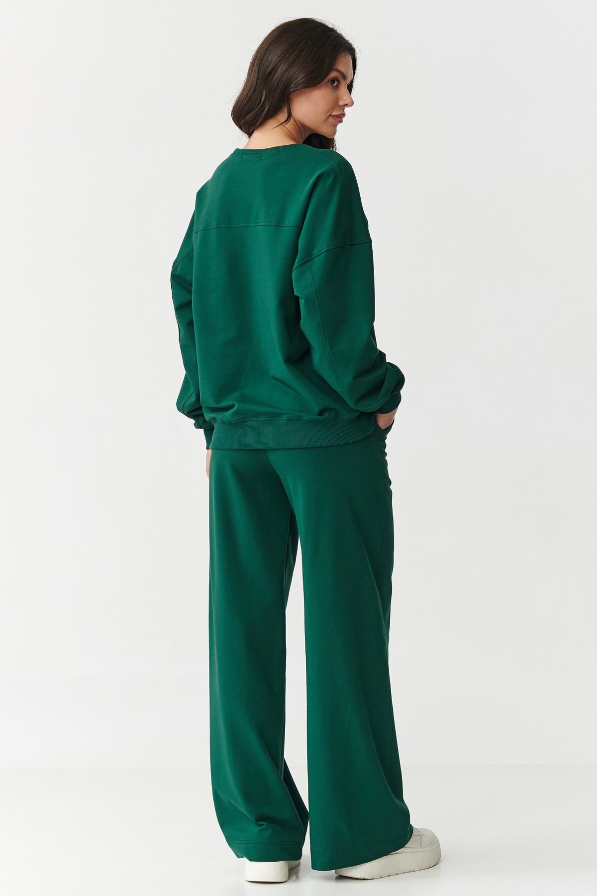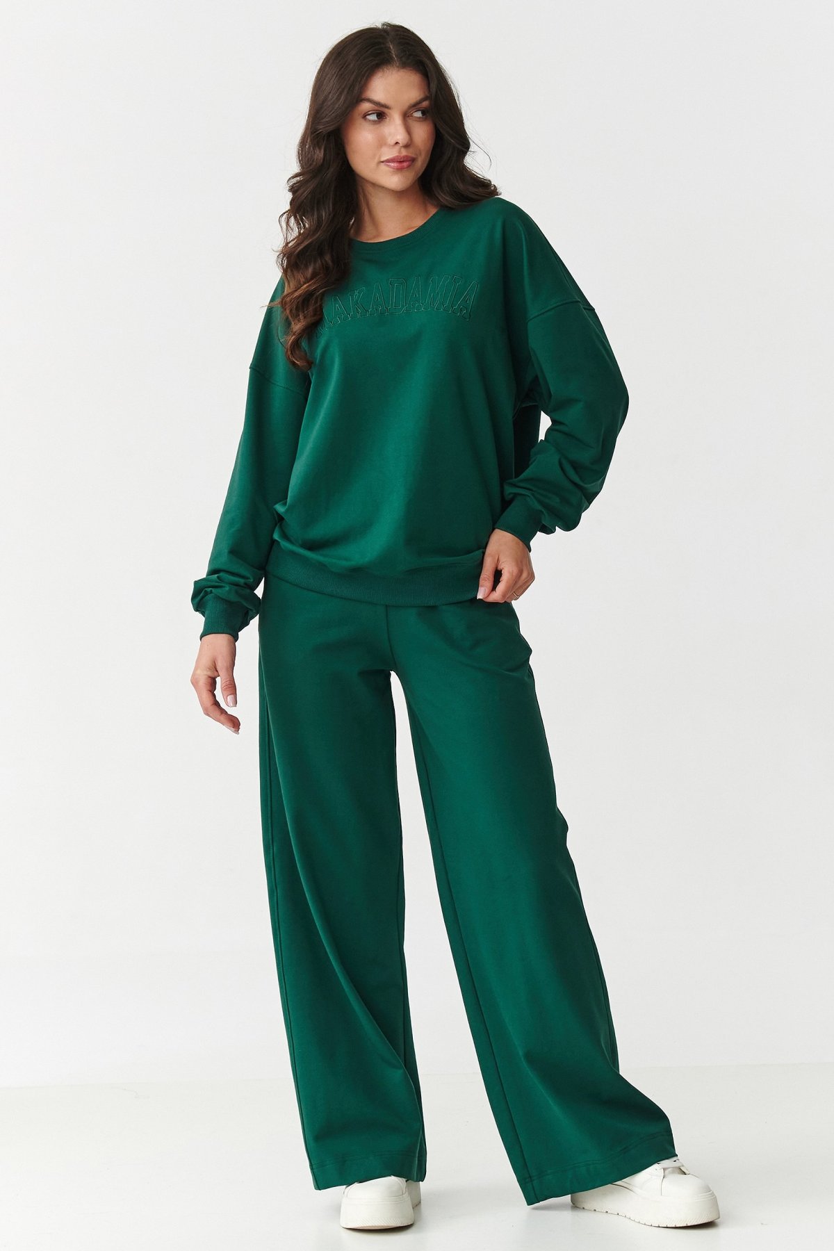 Vsaďte na perfektní spojení pohodlí a moderního vzhledu! Dámská tepláková souprava, která se hodí pro každodenní nošení, ale využijete ji i na neformální schůzky nebo jen tak pro domácí relax. Souprava je vyrobena z kombinace bavlny a elastanu. Díky tomu je zaručeno pohodlí a perfektní přizpůsobení křivkám. Mikina má klasický střih s kulatým dekoltem. Lehce snížená linie ramen vypadá žensky a stylově. Mírně oversize styl působí svěže a moderně. Výšivka na přední straně dodává ten správný šmrnc. Kalhoty jsou výjimečné samy o sobě. Mají totiž poměrně široký střih nohavic. Hezky se prezentují na křivkách v pohybu. Dodávají postavě lehkost a souměrnost. Pružný pas a praktické kapsy zvyšují jedinečnost modelu. Teplákovku si můžete vybrat ve vhodné barvě, která podtrhne vaši individualitu. Každá si najde tu pravou. Ideální komplet pro každé roční období.