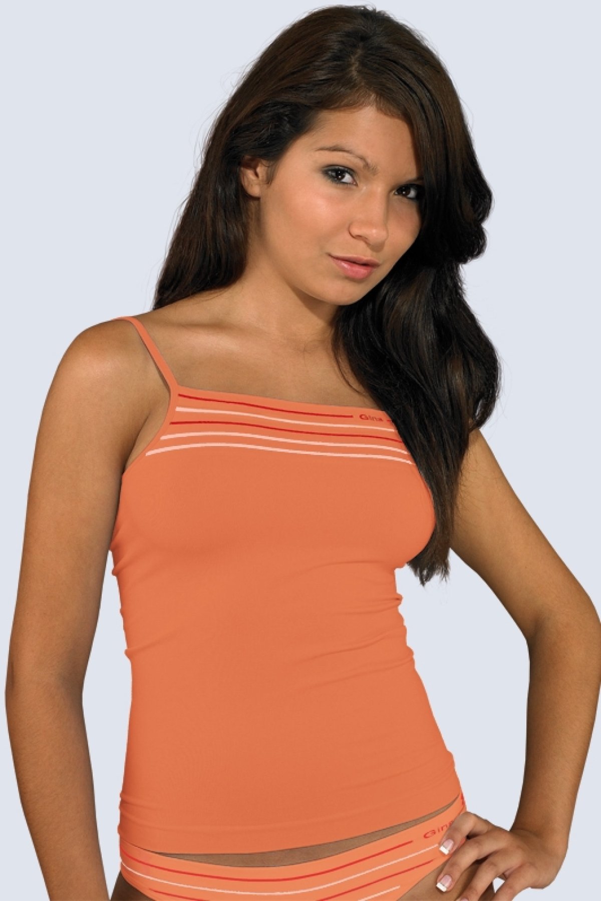 Košilka s úzkými ramínky. Dolní kraj je zapravený bezešvým způsobem. Horní kraj je zapravený bezešvým způsobem. Průramky jsou zapravené lemovacími proužky, které přechází do úzkých ramínek. Košilka má v horním kraji na širokém lemu vypleteno několik proužkou a logo. Materiál je vyroben z polyamidového vlákna, které je doplněno elastanem. Elastan přidává materiálu pružnost a zlepšuje jeho tvarovou stálost.