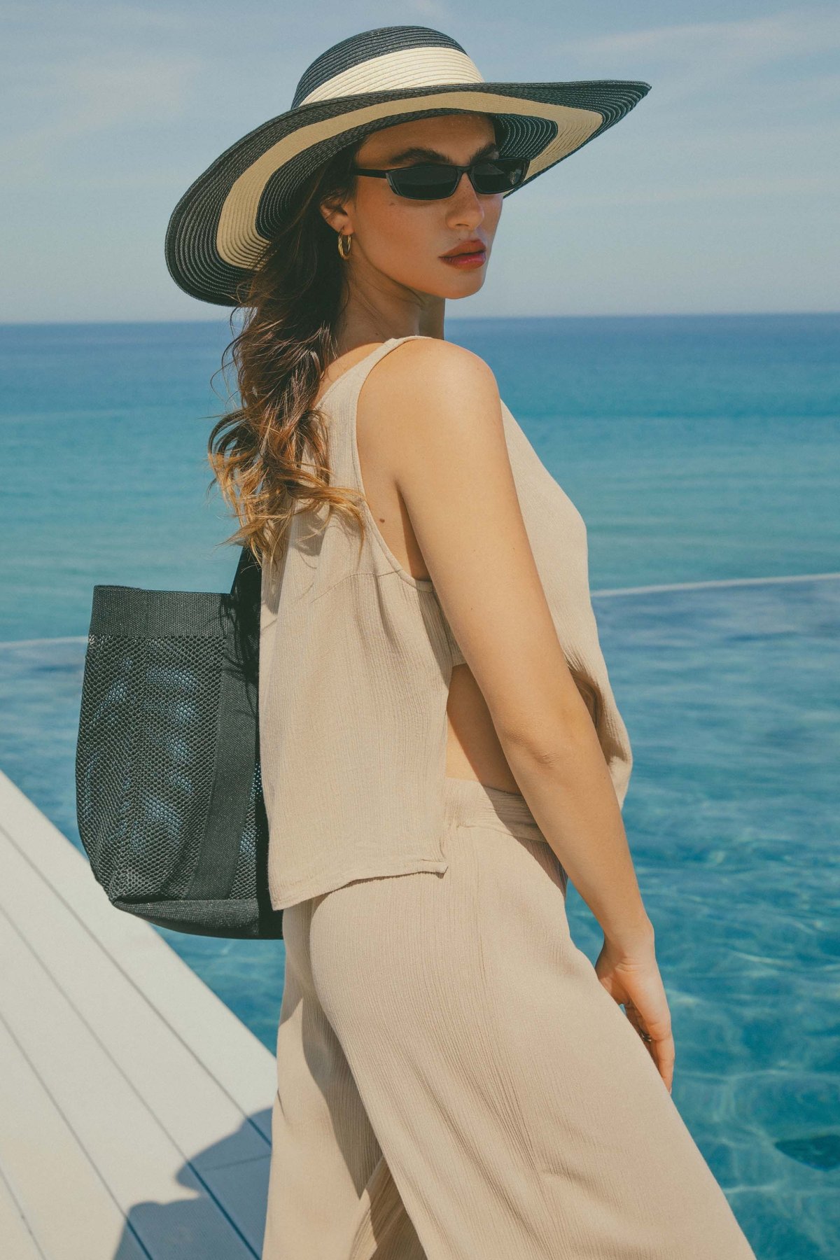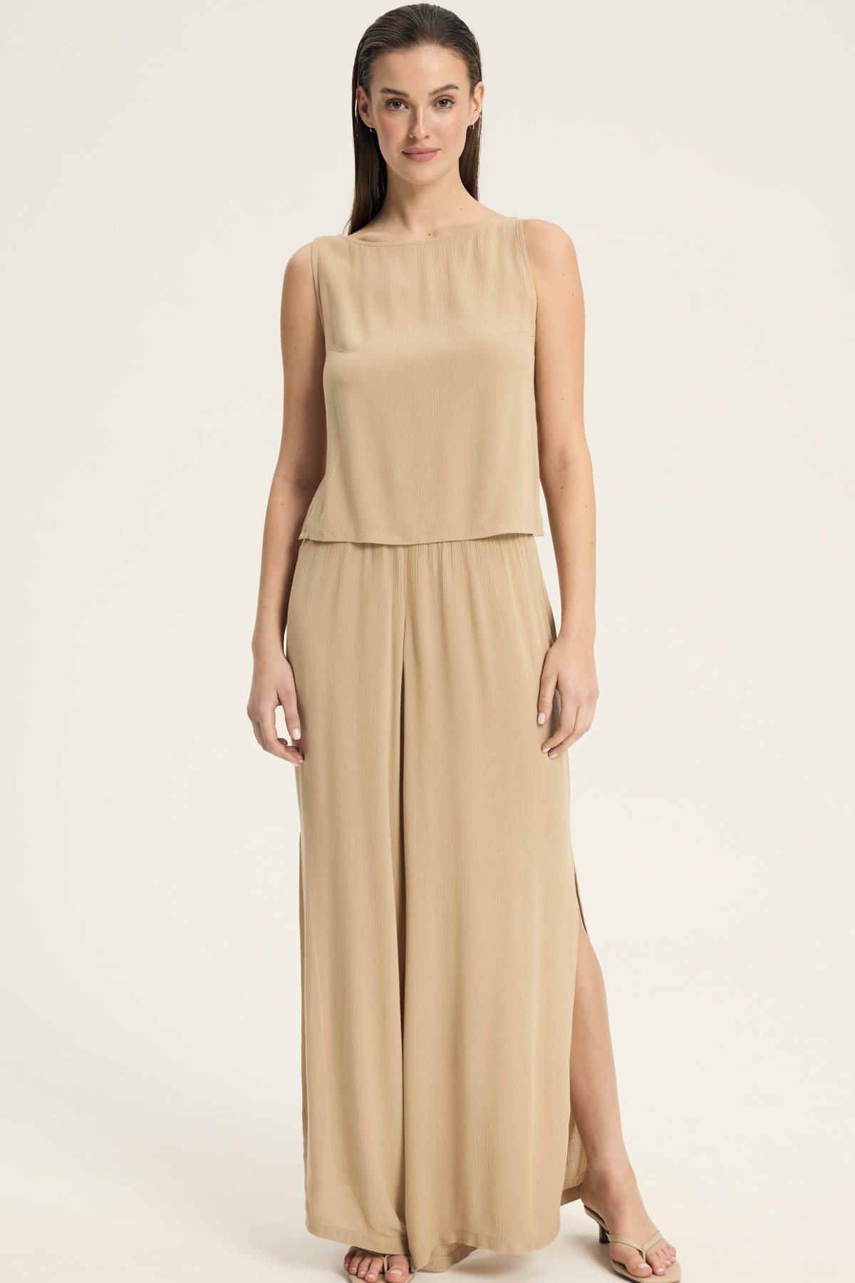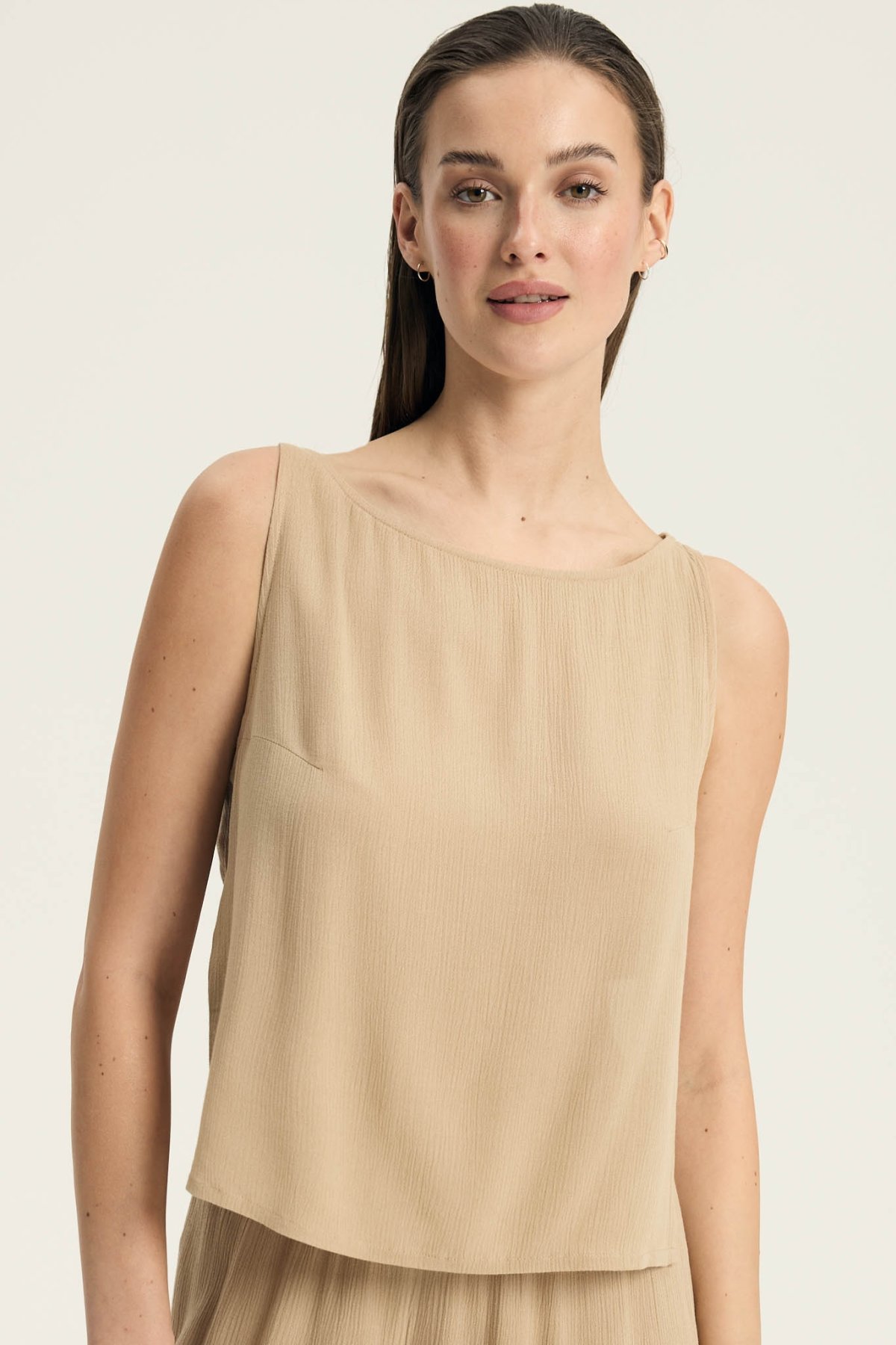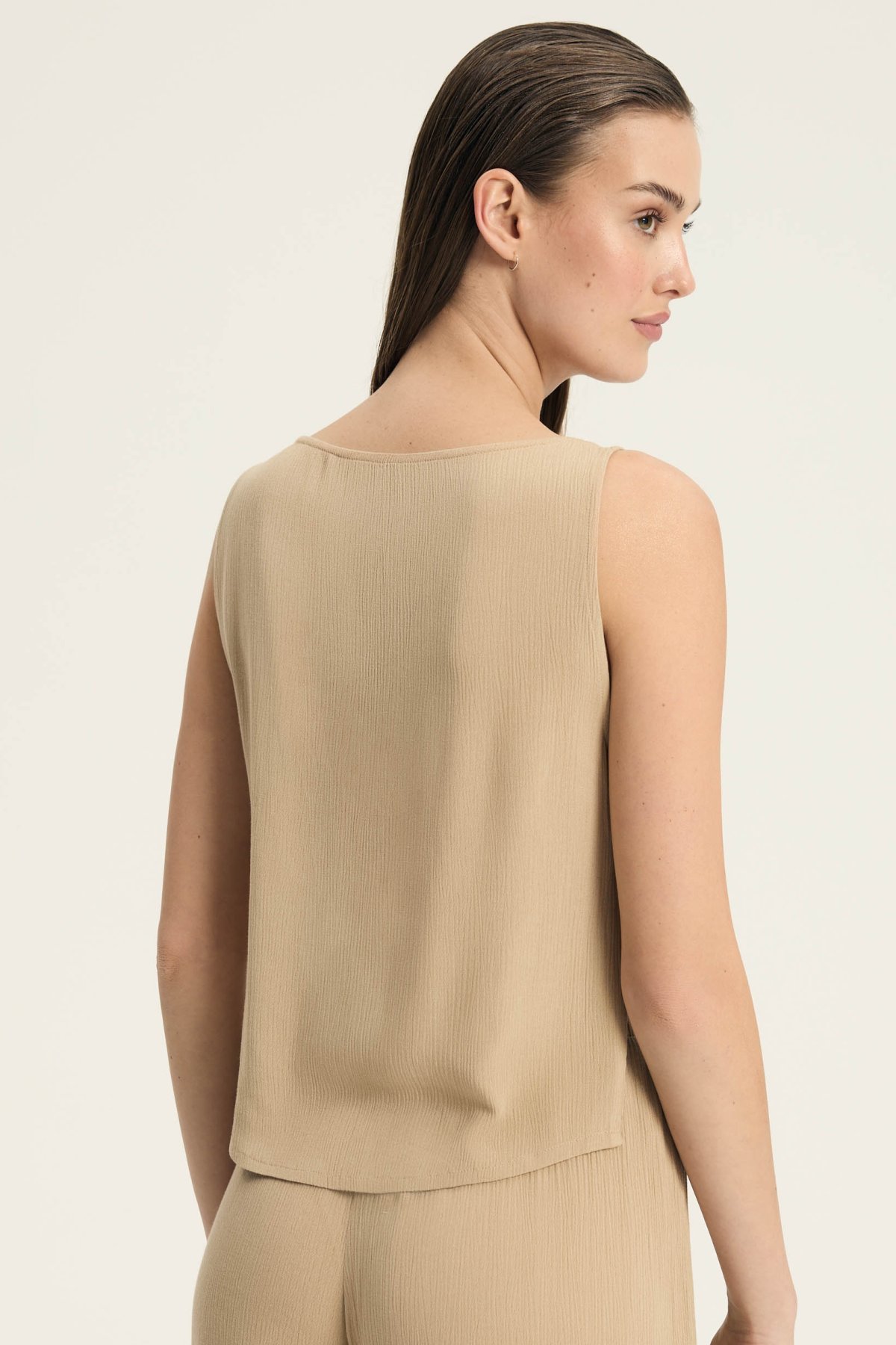 Rovný střih bez rukávů nechává vyniknout čisté linie a díky lehce sníženým průramkům působí model uvolněněji. Jemně strukturovaný materiál s pruhovaným efektem dodává topu zajímavější povrch a zachovává vzdušný dojem. Díky minimalistickému provedení se snadno kombinuje s dalšími kousky a dobře funguje samostatně i jako součást sladěného kompletu. Je to model pro ženy, které mají rády jednoduchost s lehkým, moderním akcentem.