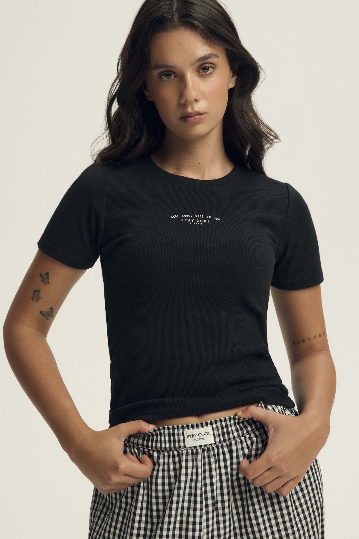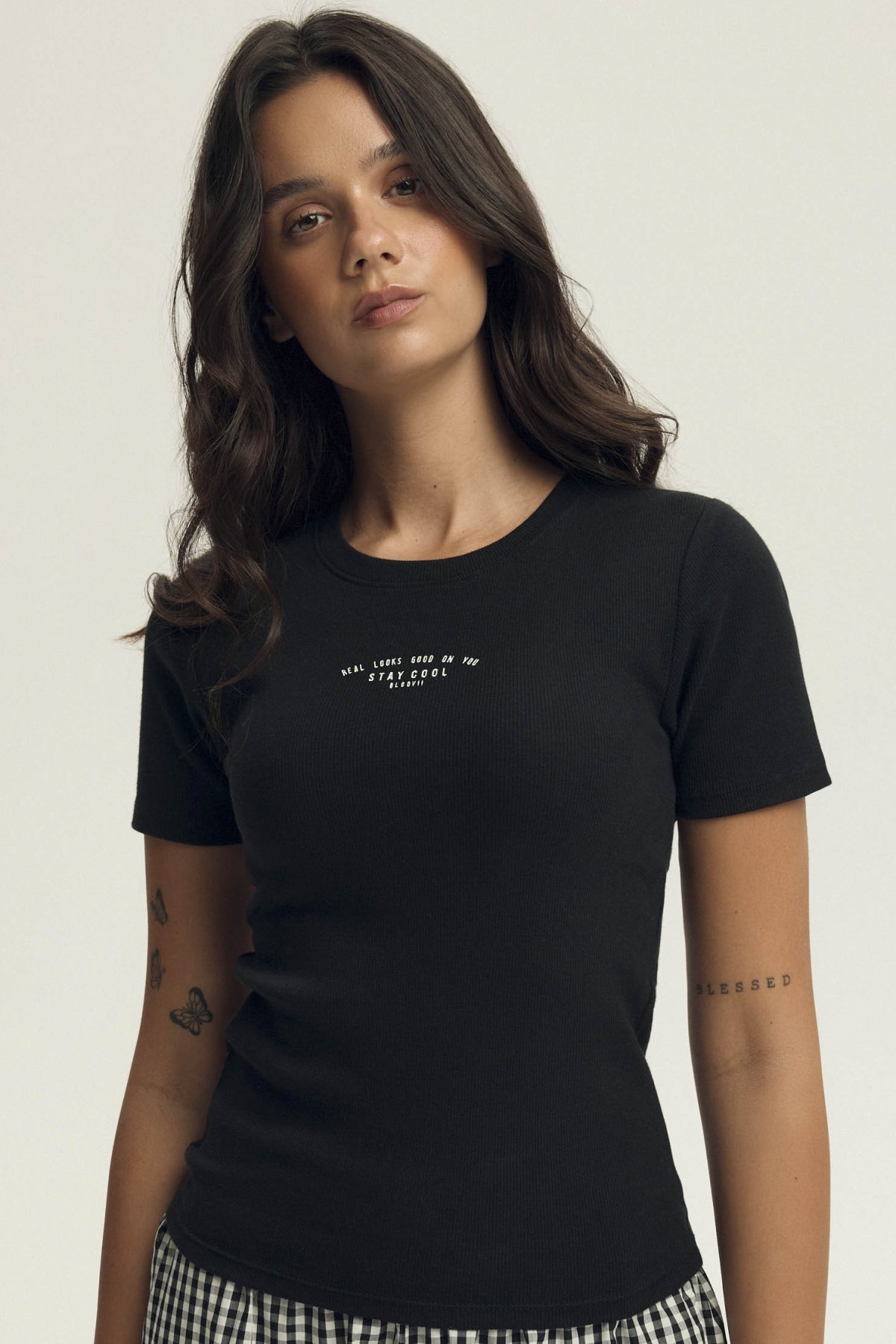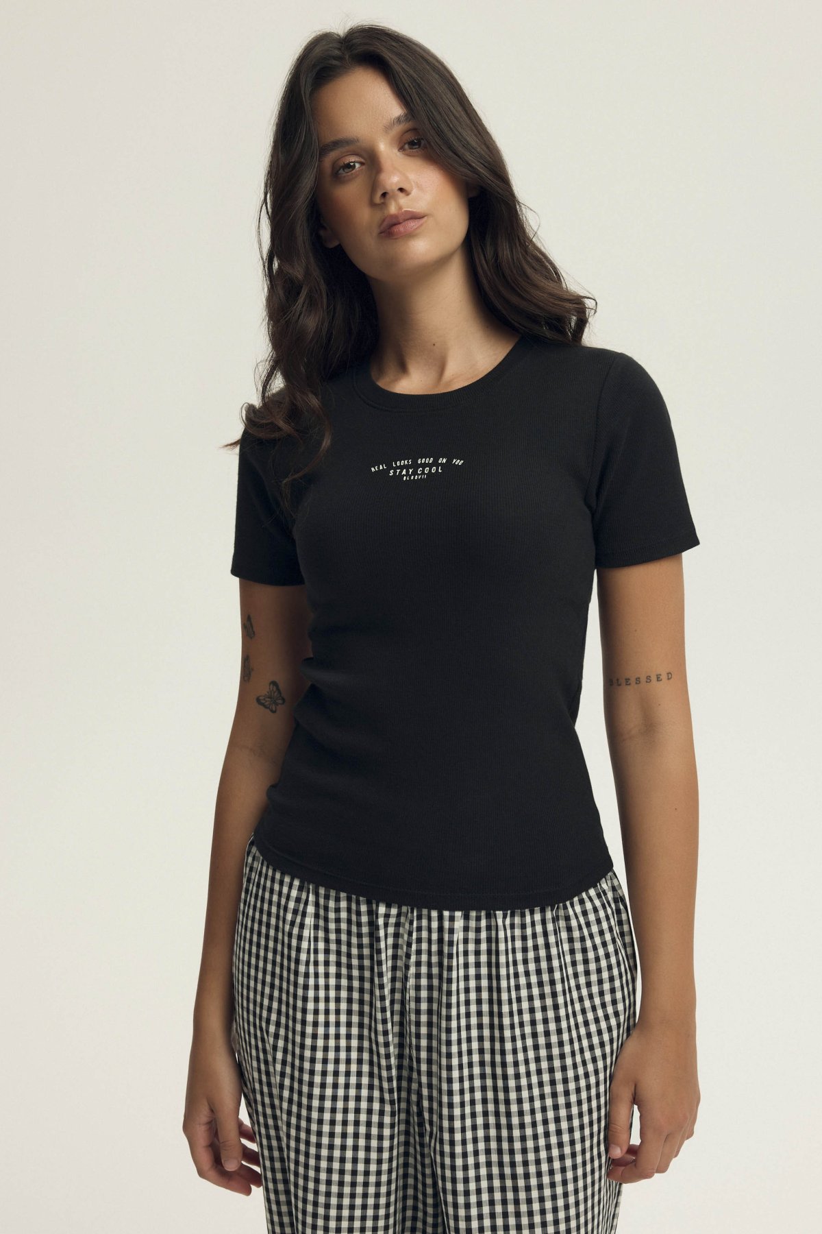 Tričko Lann v černé barvě spojuje jednoduchý moderní vzhled s jemným potiskem na přední straně. Žebrovaný úplet vytváří čistý základ, který se hodí ke sportovním i volnočasovým outfitům. Krátký rukáv působí lehce, přiléhavý střih zvýrazní siluetu a kulatý výstřih udržuje celkový vzhled čistý. Model je vhodný na samostatné nošení i jako součást vrstveného outfitu.