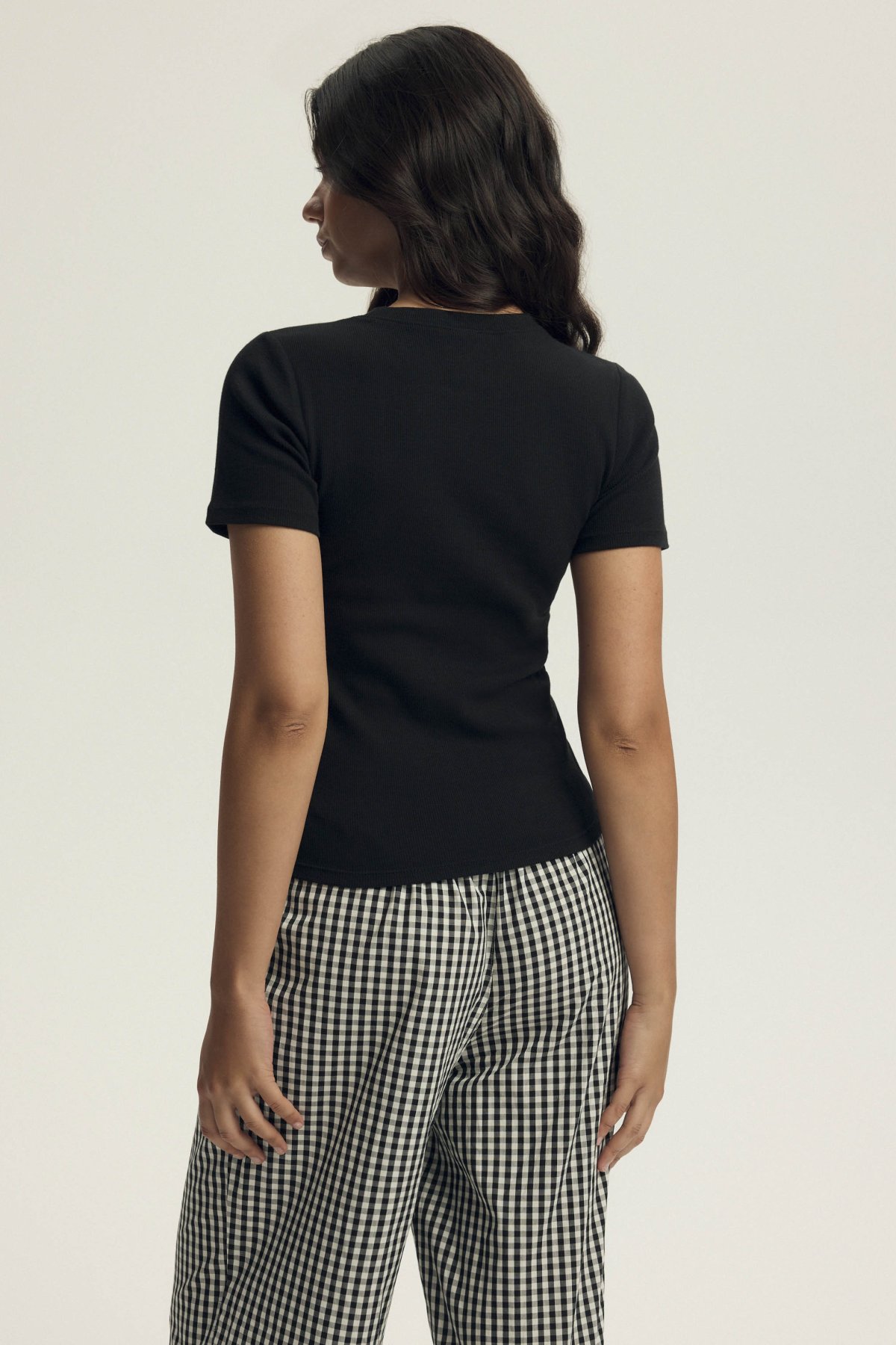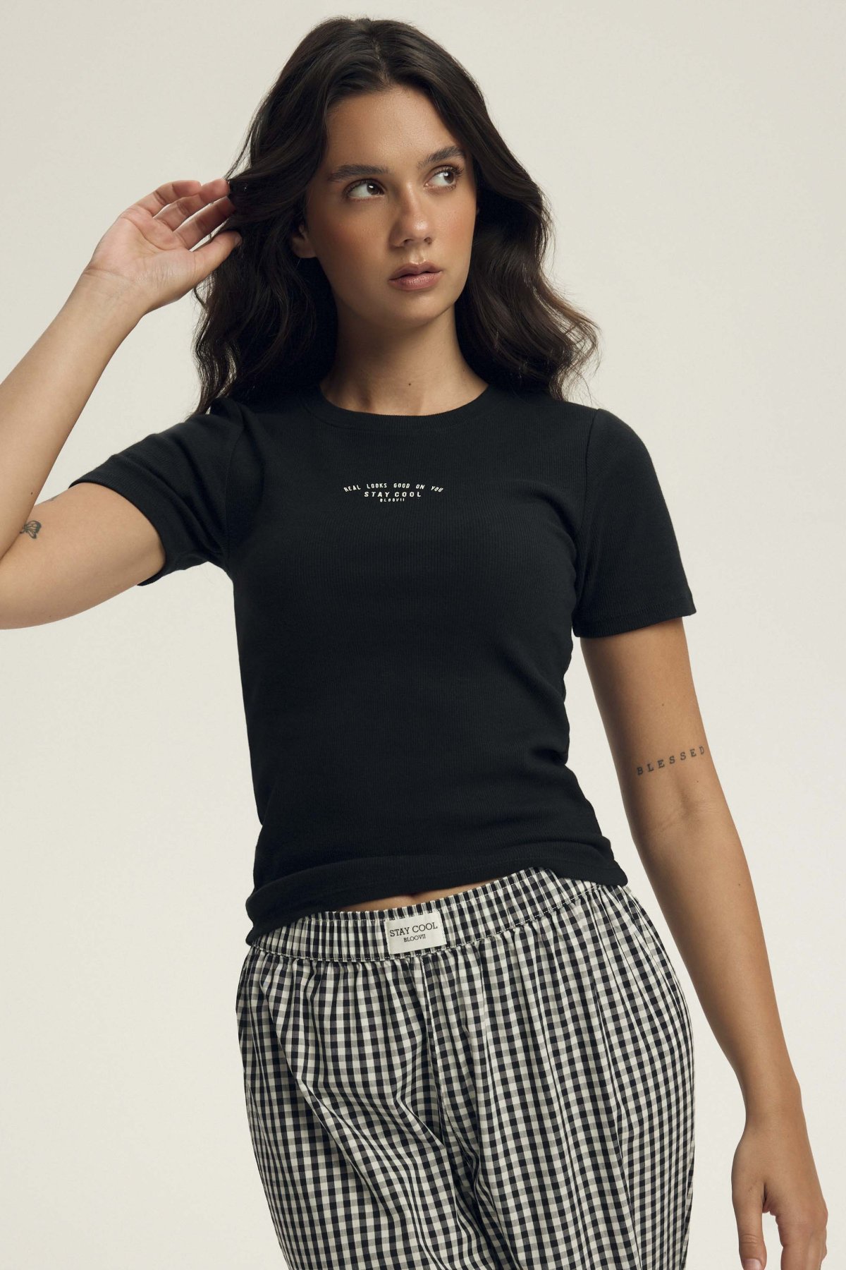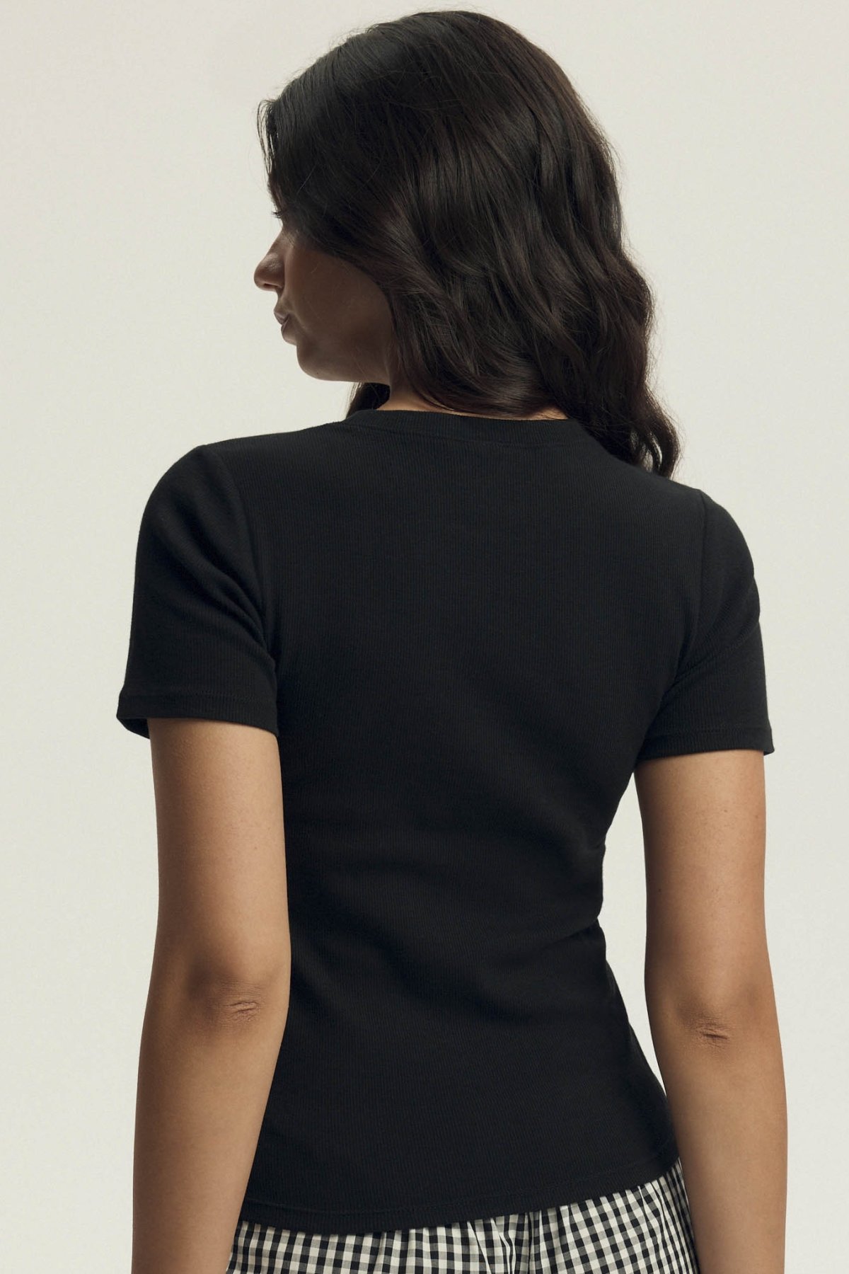 Tričko Lann v černé barvě spojuje jednoduchý moderní vzhled s jemným potiskem na přední straně. Žebrovaný úplet vytváří čistý základ, který se hodí ke sportovním i volnočasovým outfitům. Krátký rukáv působí lehce, přiléhavý střih zvýrazní siluetu a kulatý výstřih udržuje celkový vzhled čistý. Model je vhodný na samostatné nošení i jako součást vrstveného outfitu.
