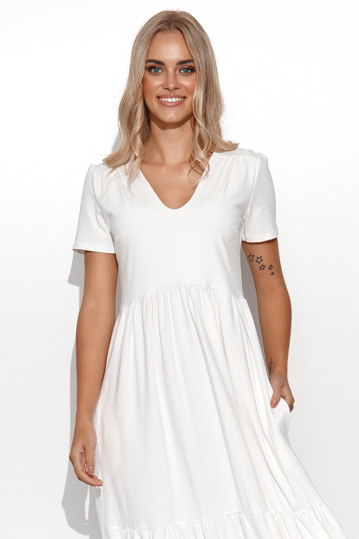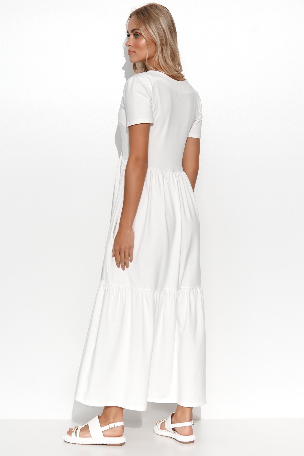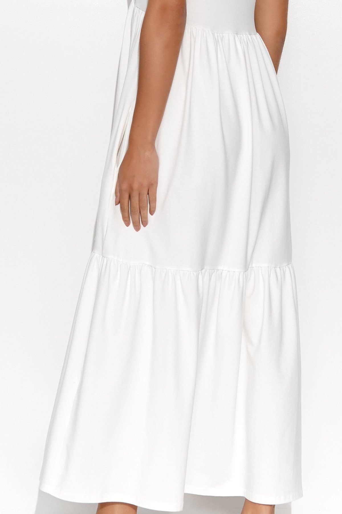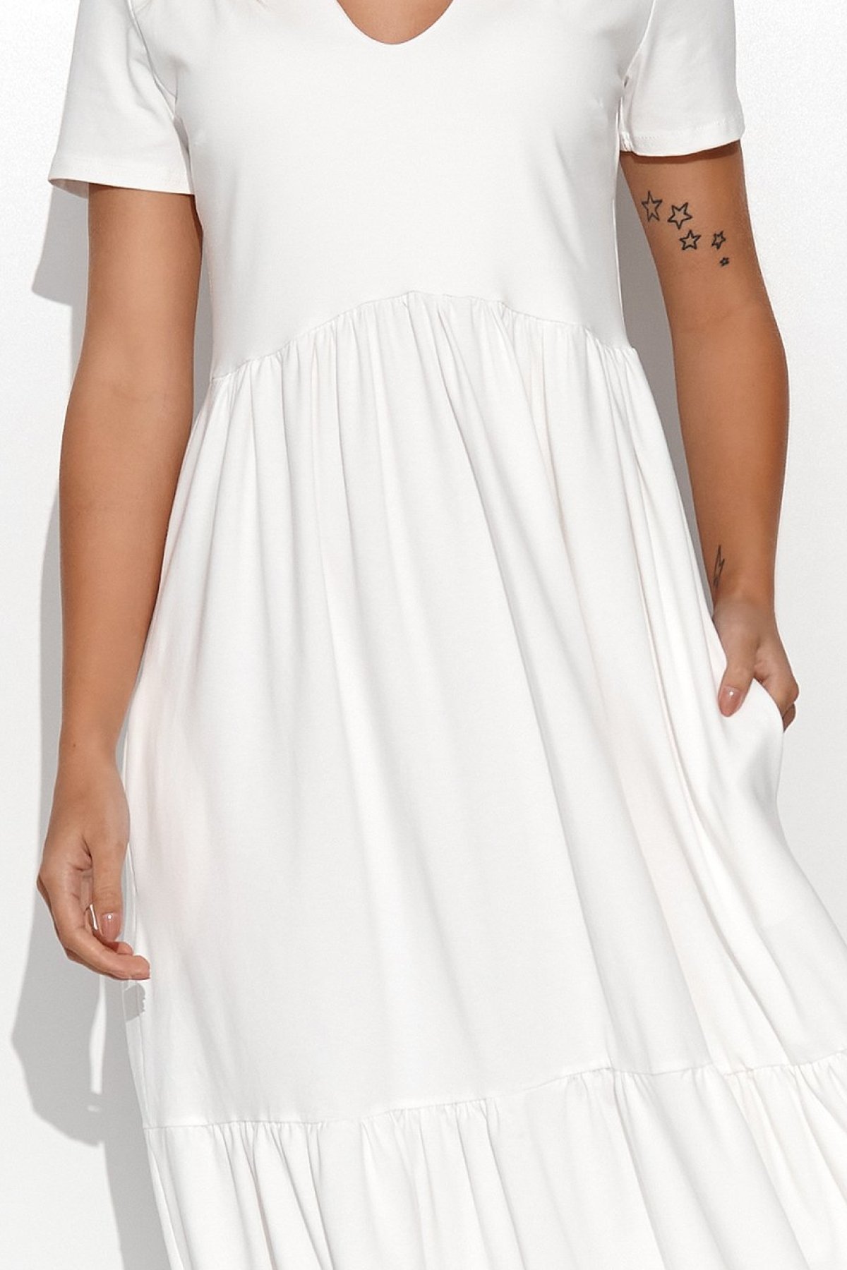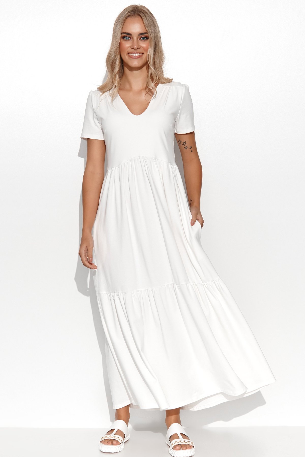 Dlouhé šaty v ecru odstínu z bavlněného úpletu působí žensky a přitom zůstávají příjemné na běžné nošení. Prošití v pase zvýrazní siluetu a lehce rozšířená sukně dodá modelu vyvážený tvar. Výstřih do V opticky prodlužuje krk, zatímco krátké rukávy decentně kryjí ramena. Volánky po celé délce vnášejí do šatů pohyb a lehkost, takže celek nepůsobí těžce. Ecru odstín usnadňuje kombinování s jednoduššími i výraznějšími doplňky.