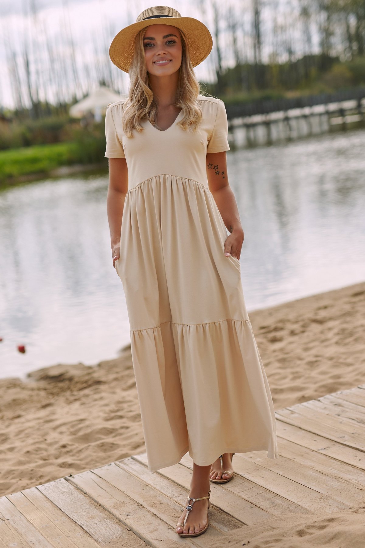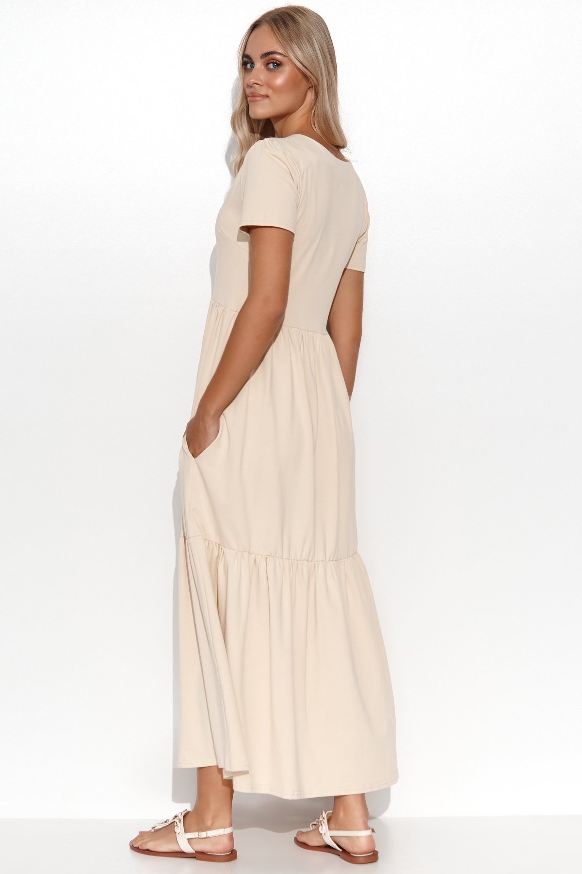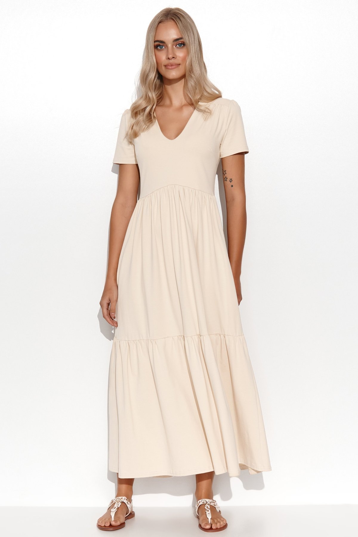 Dlouhé šaty světle béžové barvy z bavlněného úpletu působí žensky a přitom zůstávají příjemné na běžné nošení. Prošití v pase zvýrazní siluetu a lehce rozšířená sukně dodá modelu vyvážený tvar. Výstřih do V opticky prodlužuje krk, zatímco krátké rukávy decentně kryjí ramena. Volánky po celé délce vnášejí do šatů pohyb a lehkost, takže celek nepůsobí těžce. Béžový odstín usnadňuje kombinování s jednoduššími i výraznějšími doplňky.