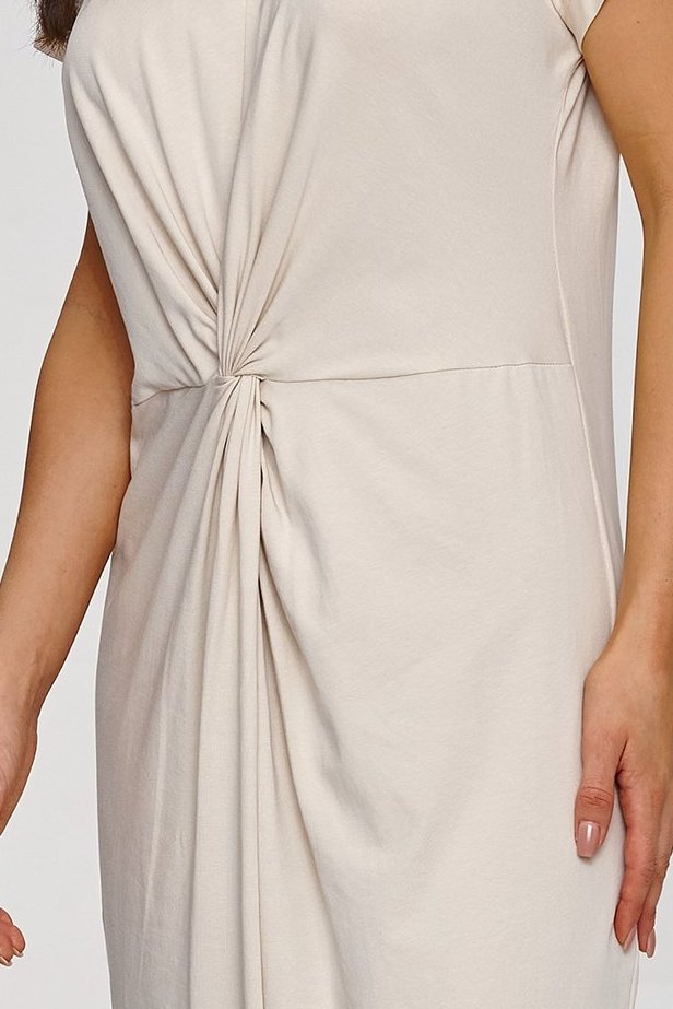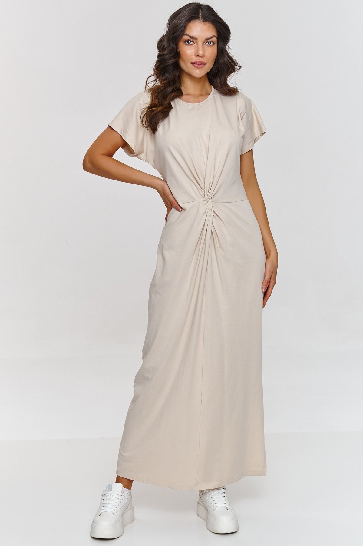 Dlouhé šaty světle béžové barvy jsou symbolem letní elegance a pohodlí. Lehká bavlněná látka krásně splývá na postavě, překlad v pase opticky zvýrazňuje ženské křivky. Boční rozparek dodává modelu vzdušnost a jemně odhaluje nohy, čímž vnáší do outfitu smyslný prvek. Díky jednoduchému střihu a univerzálnímu designu se šaty hodí jak na běžné nošení, tak i na společenské události. Perfektně se kombinují s teniskami pro neformální denní look i s podpatky pro elegantní večerní styl.
