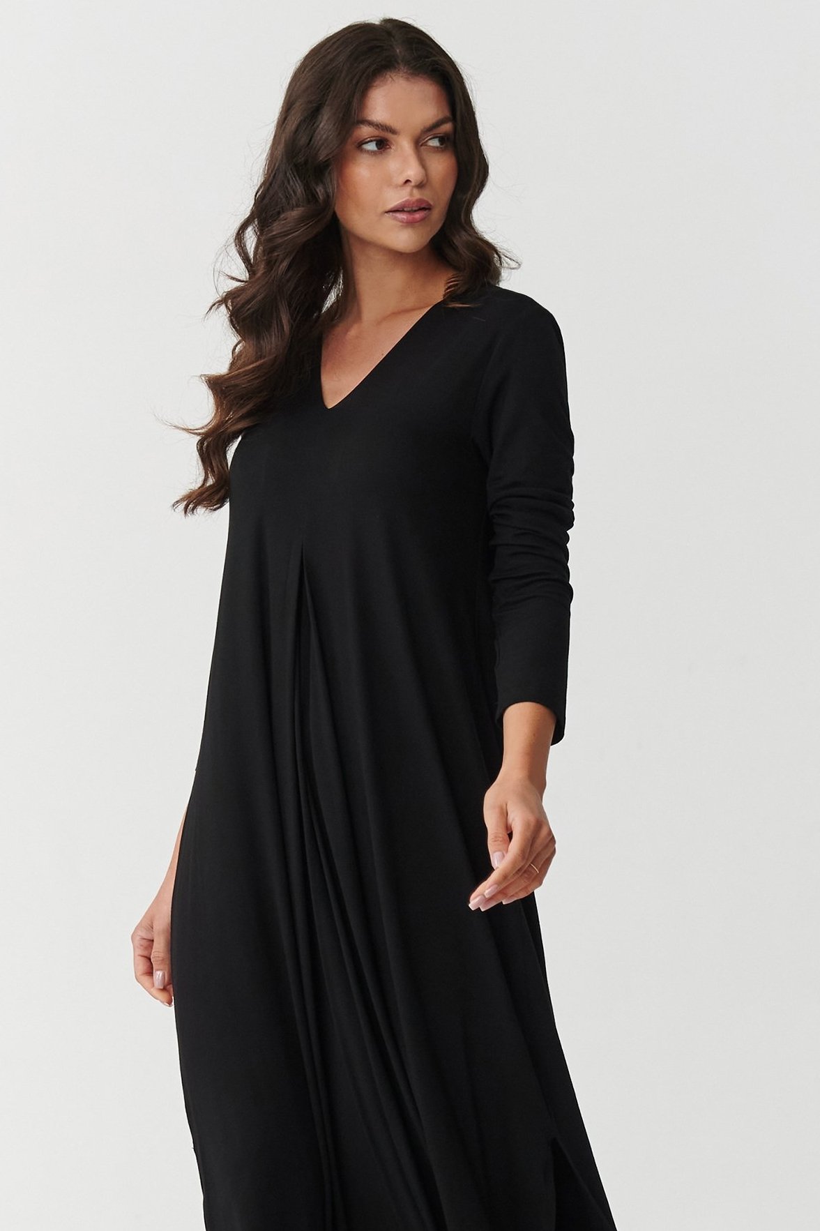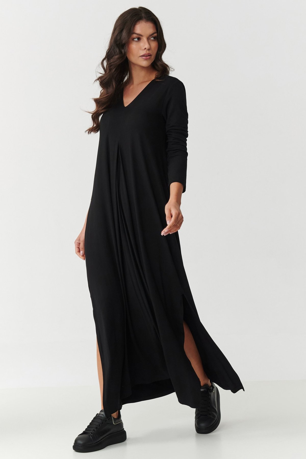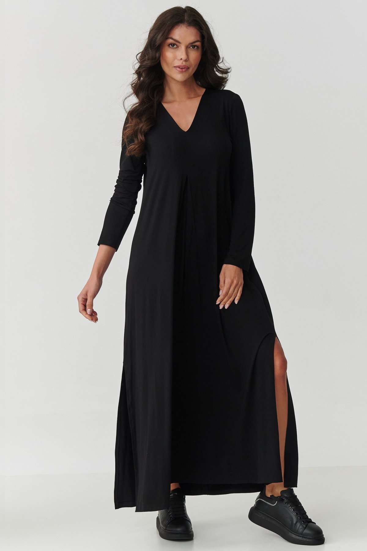 Vsaďte na nadčasovou klasiku a maximální komfort. Tyto maxi šaty jsou vyrobeny z velmi kvalitní viskózy s příměsí elastanu. Ideální kombinace pro každý den i pro výjimečné situace. Díky přirozeně vzdušné struktuře a elasticitě tkaniny se šaty perfektně prezentují na postavě. Neomezují v pohybu. Dekolt ve tvaru V smyslně zdůrazní ženské tvary, lehce rozšířená spodní část s rozparky po stranách zase dodá lehkost a moderní šmrnc. Dlouhé rukávy dělají z šatů univerzální kousek pro každé roční období. Můžete vybírat z více vkusných barev, které snadno dopasujete ke zbytku outfitu. V této variantě jsou šaty černé . Tmavá klasika, která nesmí chybět v žádném šatníku. Pokud tedy sázíte na jasnou univerzálnost, minimalismus a eleganci v jednom, tyto šaty budou skvělou volbou.