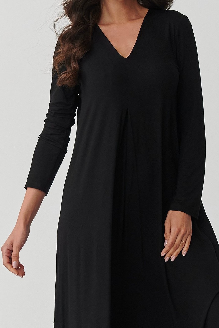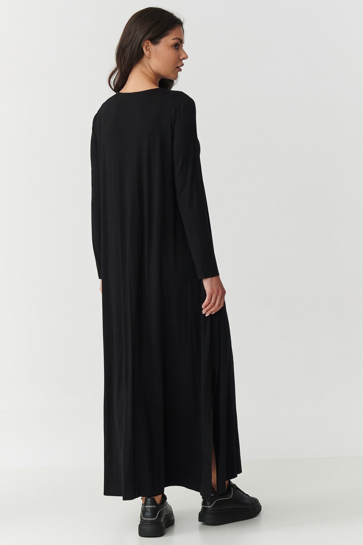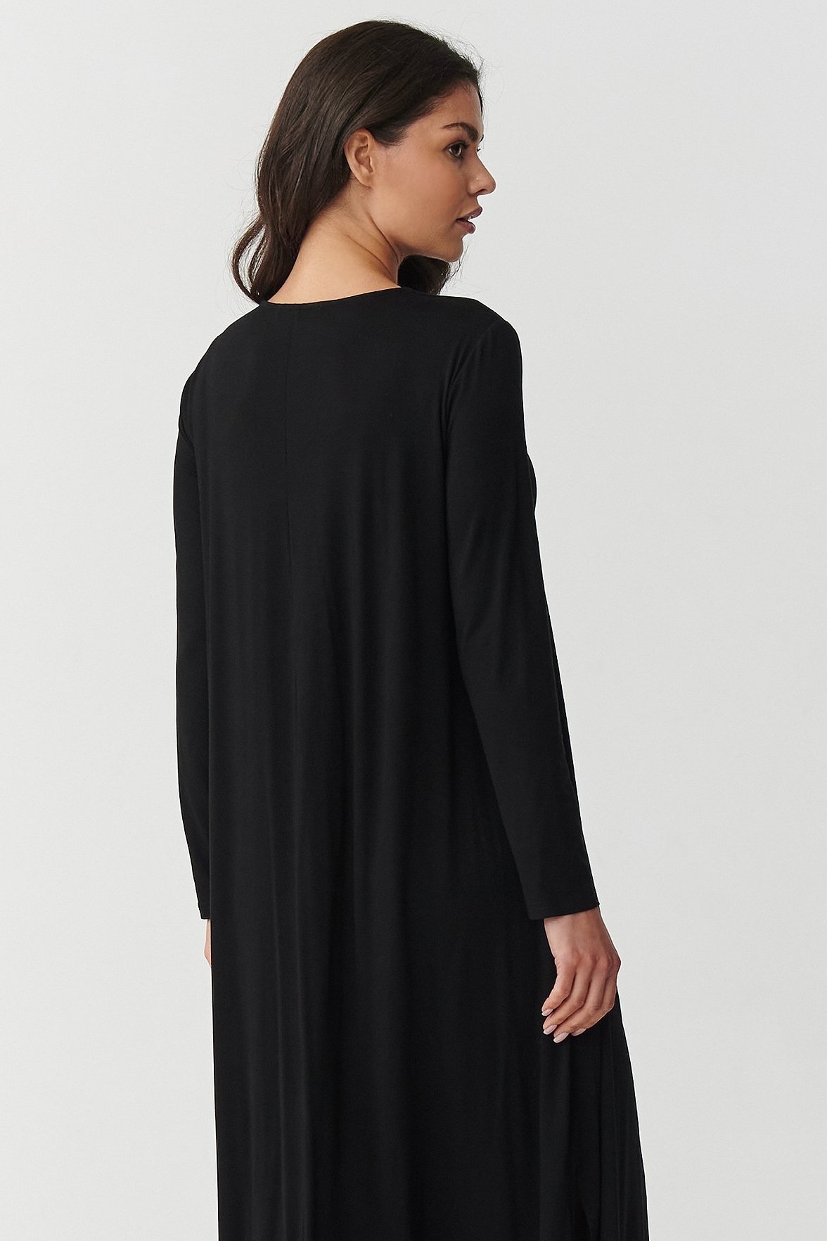 Vsaďte na nadčasovou klasiku a maximální komfort. Tyto maxi šaty jsou vyrobeny z velmi kvalitní viskózy s příměsí elastanu. Ideální kombinace pro každý den i pro výjimečné situace. Díky přirozeně vzdušné struktuře a elasticitě tkaniny se šaty perfektně prezentují na postavě. Neomezují v pohybu. Dekolt ve tvaru V smyslně zdůrazní ženské tvary, lehce rozšířená spodní část s rozparky po stranách zase dodá lehkost a moderní šmrnc. Dlouhé rukávy dělají z šatů univerzální kousek pro každé roční období. Můžete vybírat z více vkusných barev, které snadno dopasujete ke zbytku outfitu. V této variantě jsou šaty černé . Tmavá klasika, která nesmí chybět v žádném šatníku. Pokud tedy sázíte na jasnou univerzálnost, minimalismus a eleganci v jednom, tyto šaty budou skvělou volbou.