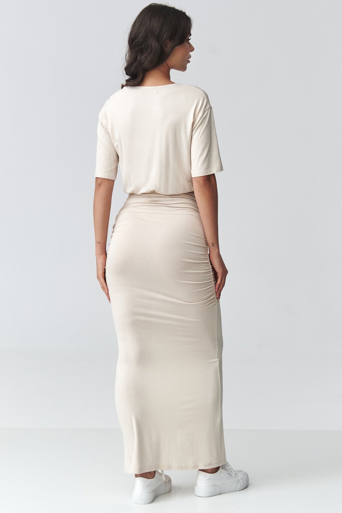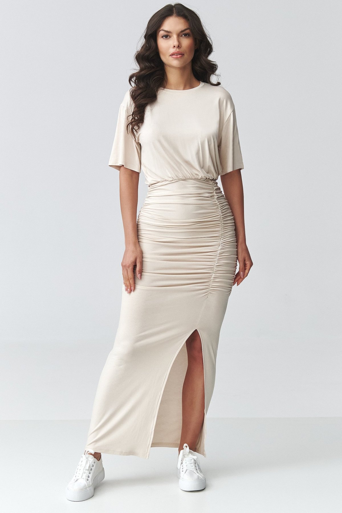 Dlouhé béžové šaty navržené tak, aby zvýraznily siluetu a zároveň zůstaly pohodlné při nošení.
