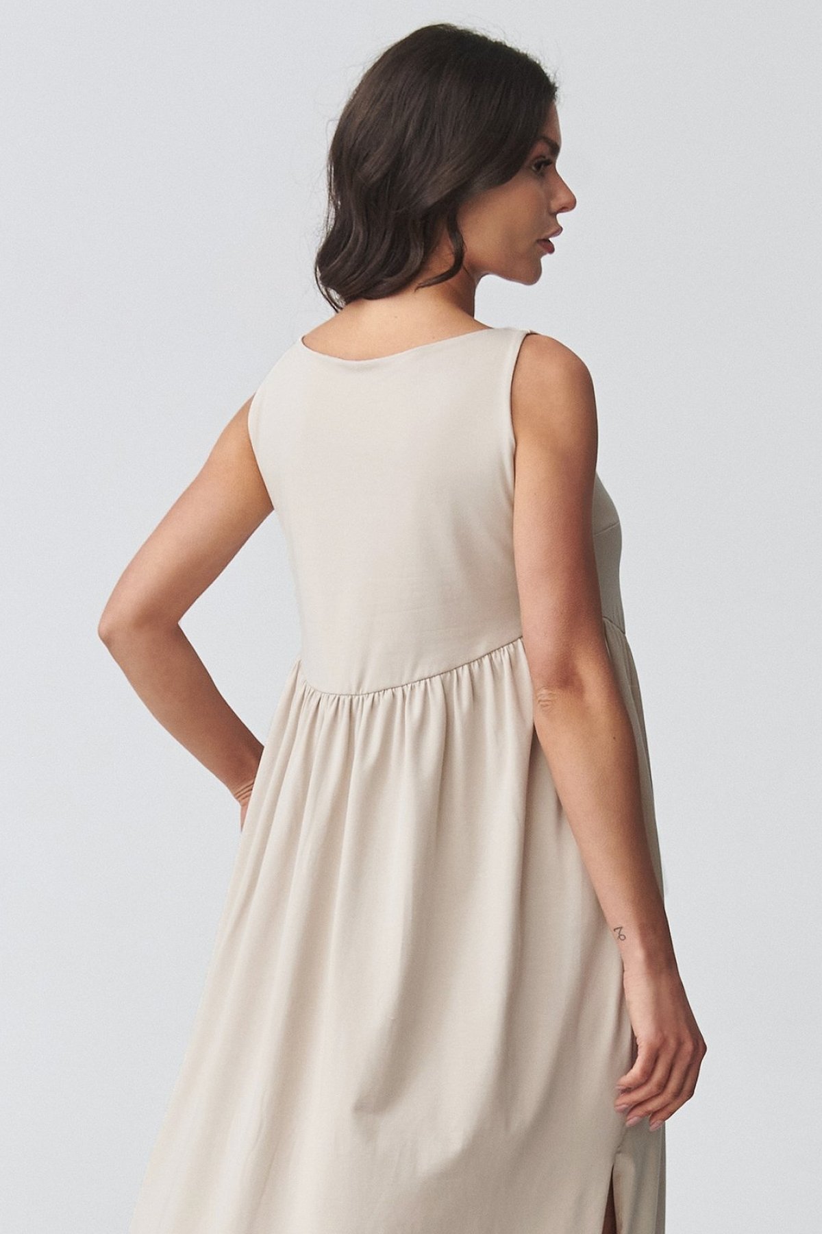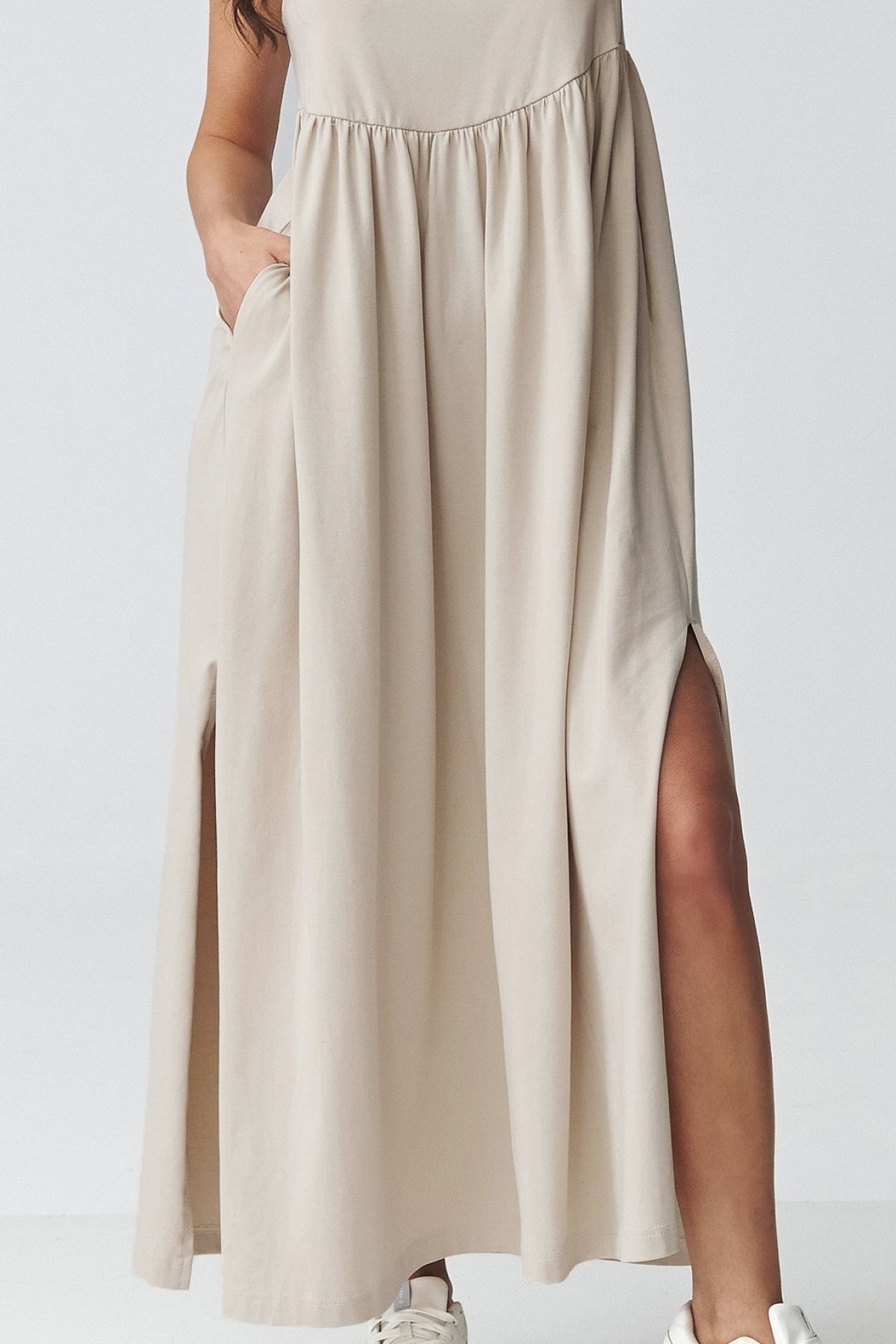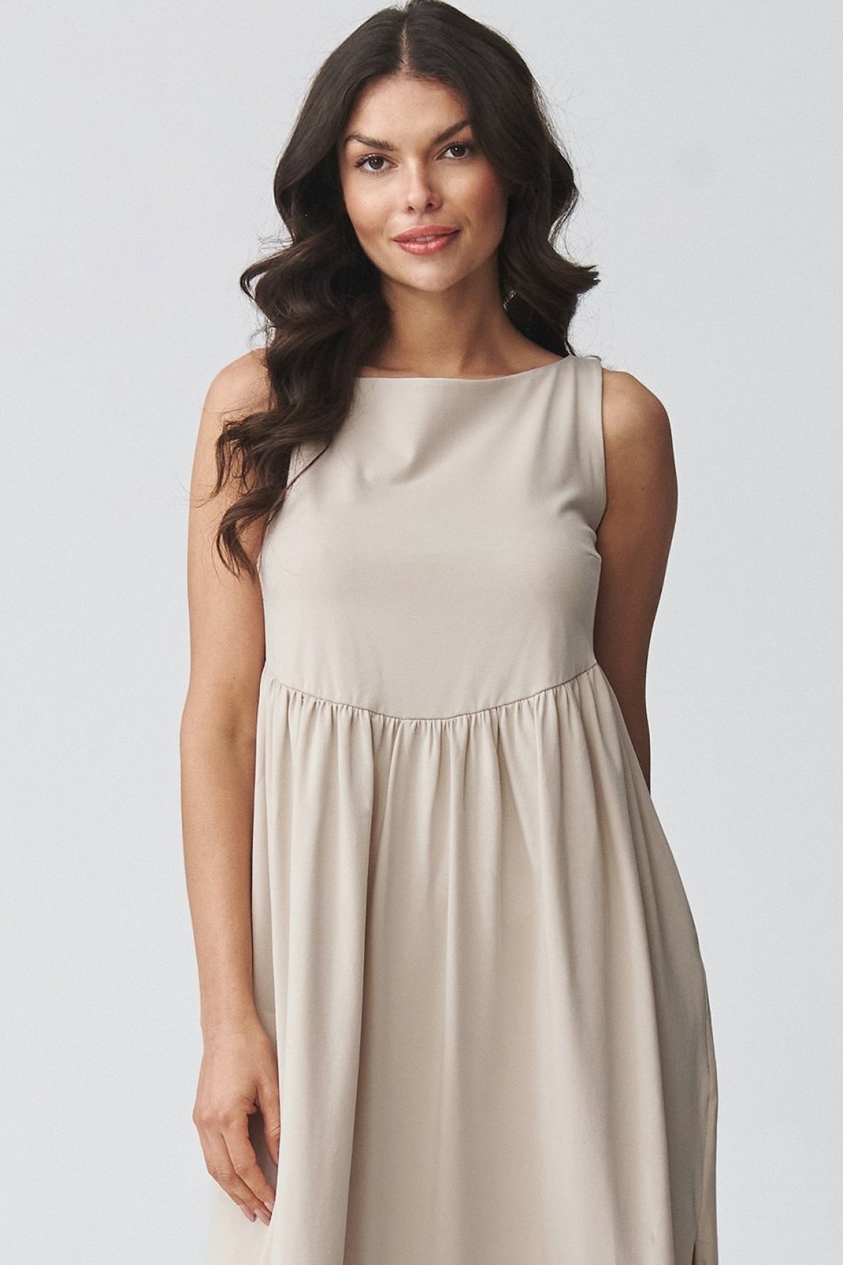 Světle béžové šaty přinášející pohodlný střih, který na těle působí lehce a upraveně zároveň.