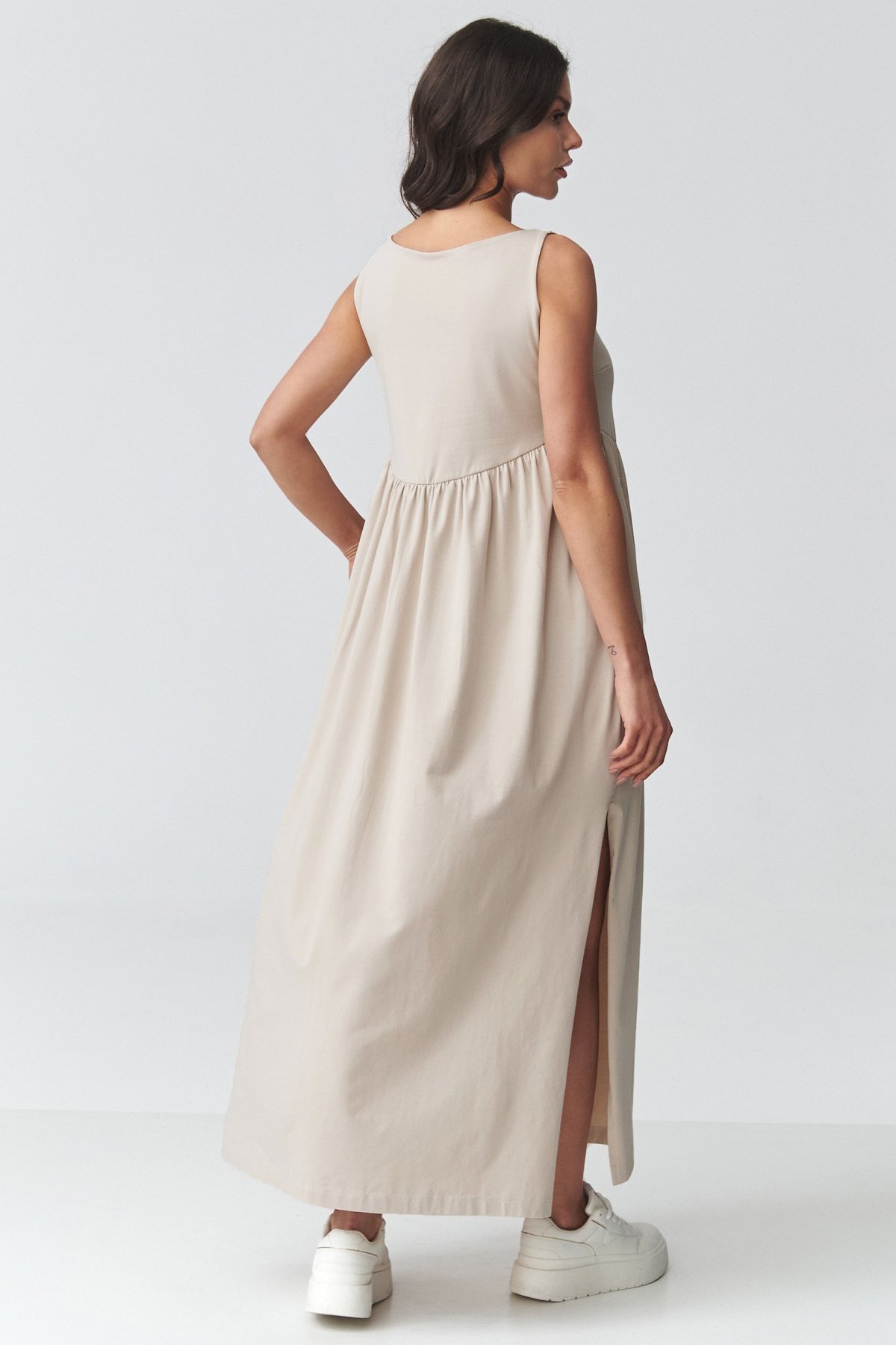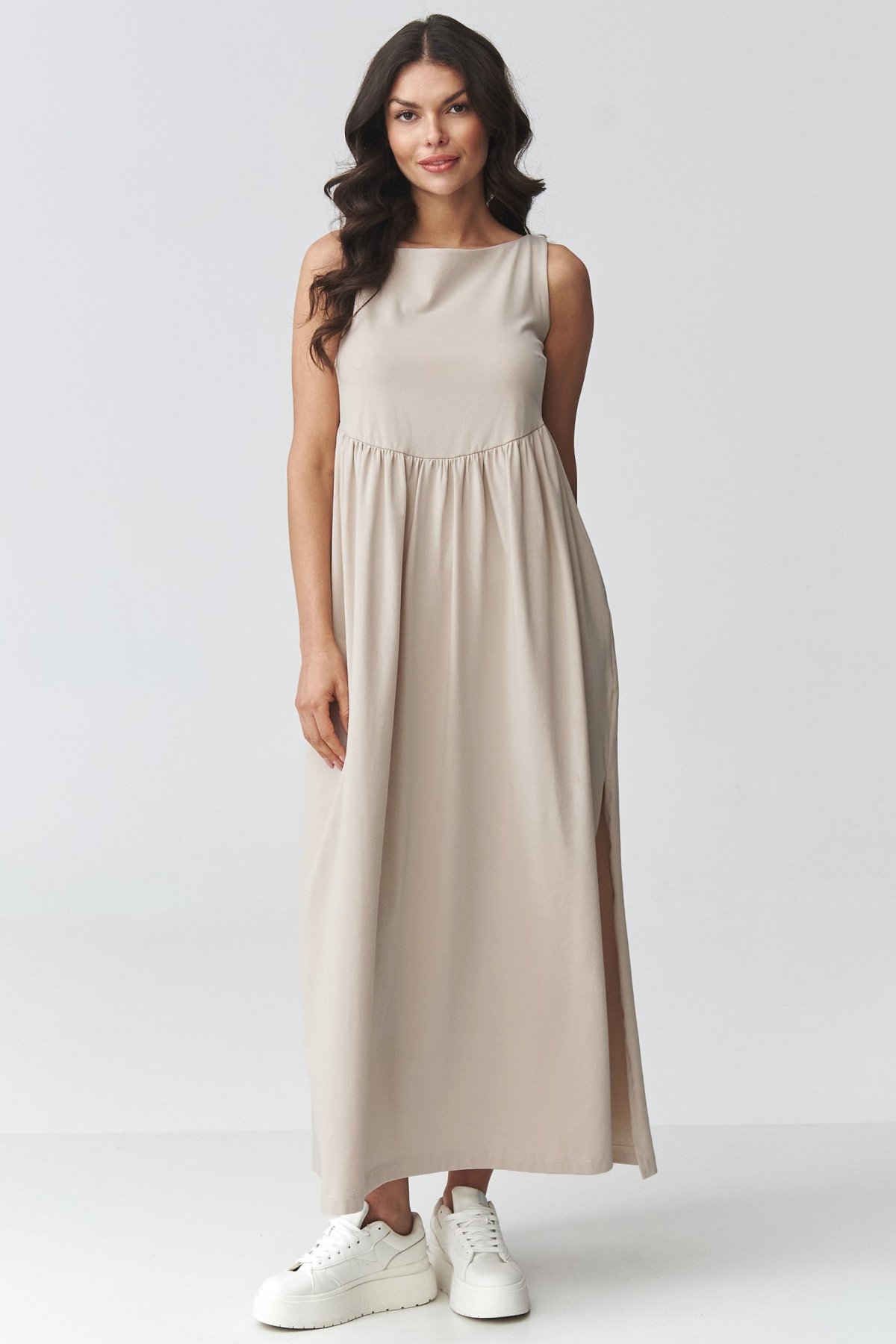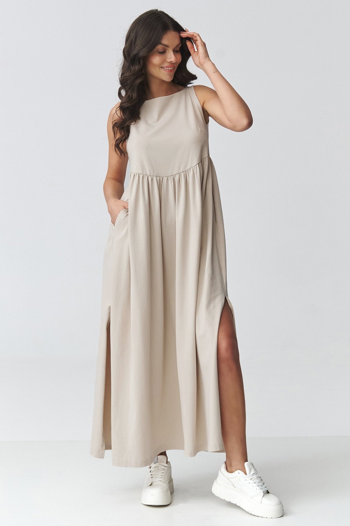Světle béžové šaty přinášející pohodlný střih, který na těle působí lehce a upraveně zároveň.