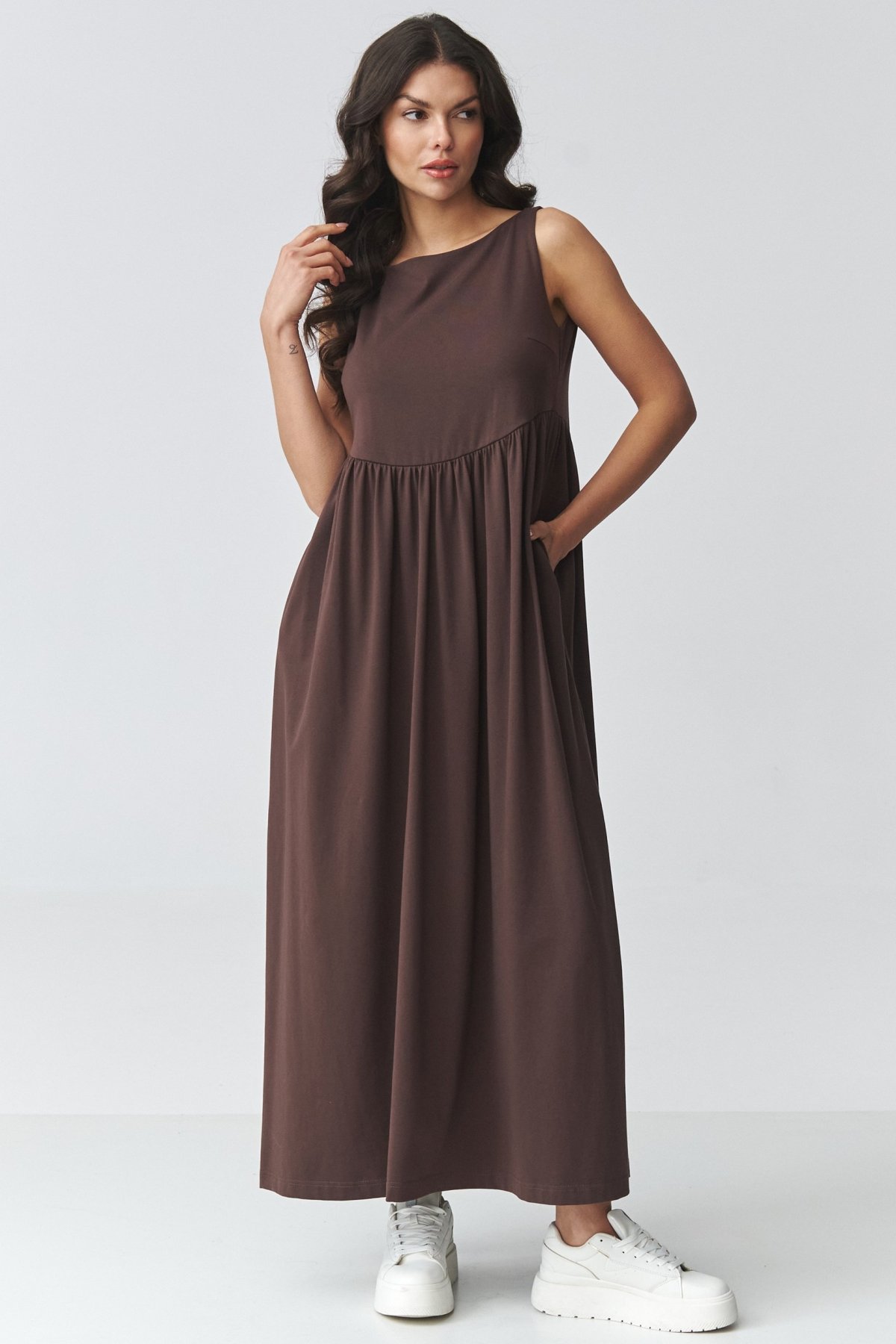 Volnější linie neomezuje v pohybu, jemné řasení v pase pomáhá lépe vyvážit proporce postavy. Rozšířený spodní díl dodává modelu vzdušnost a boční rozparky nechávají sukni lépe pracovat při chůzi. Praktické kapsy zvyšují pohodlí při běžném nošení a hladké provedení usnadňuje kombinování se sportovní i elegantnější obuví. Maxi délka podtrhuje klidný. Díky bavlně s příměsí elastanu je model příjemný na nošení po celý den. Hodí se na volný den, cestování i nenucené setkání, když chcete vypadat upraveně bez složitého stylingu.