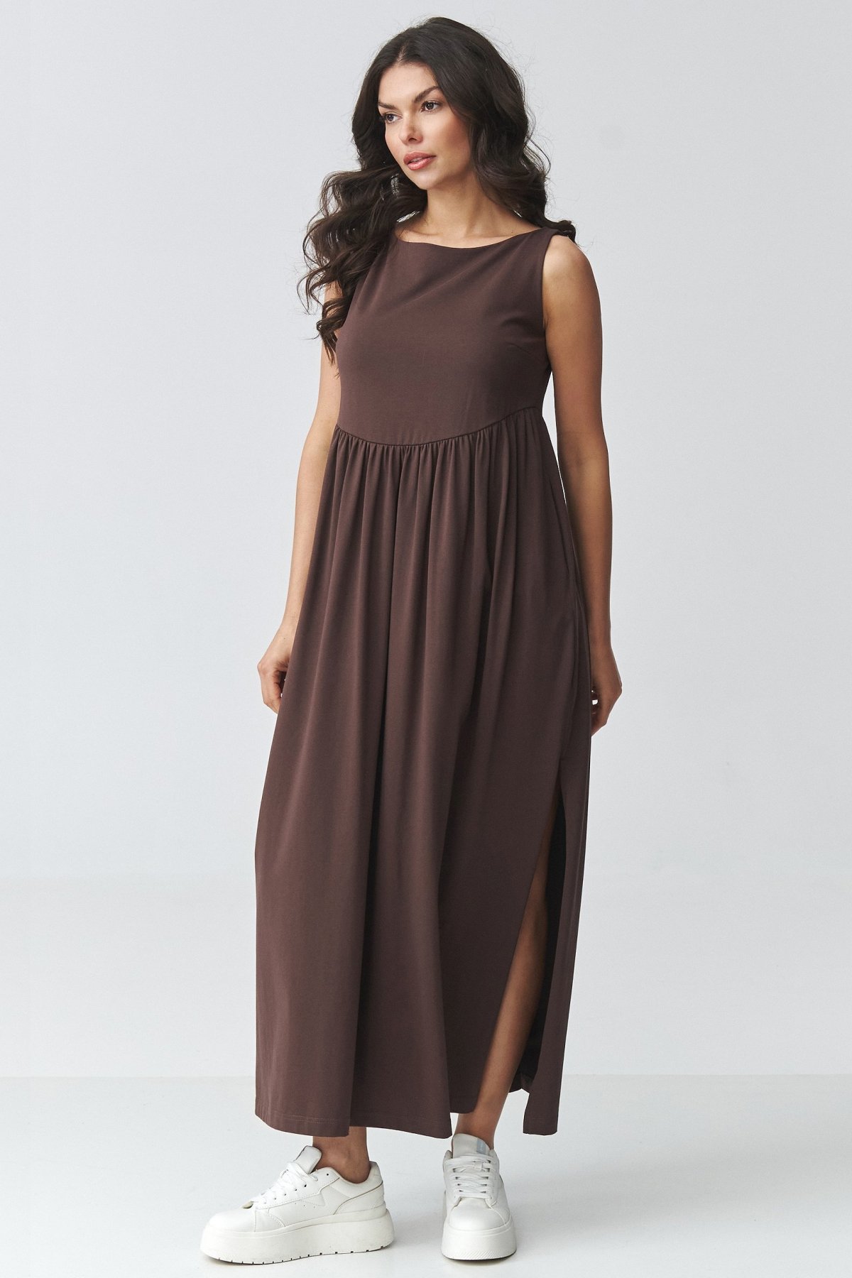 Tmavě hnědé šaty přinášející pohodlný střih, který na těle působí lehce a upraveně zároveň.