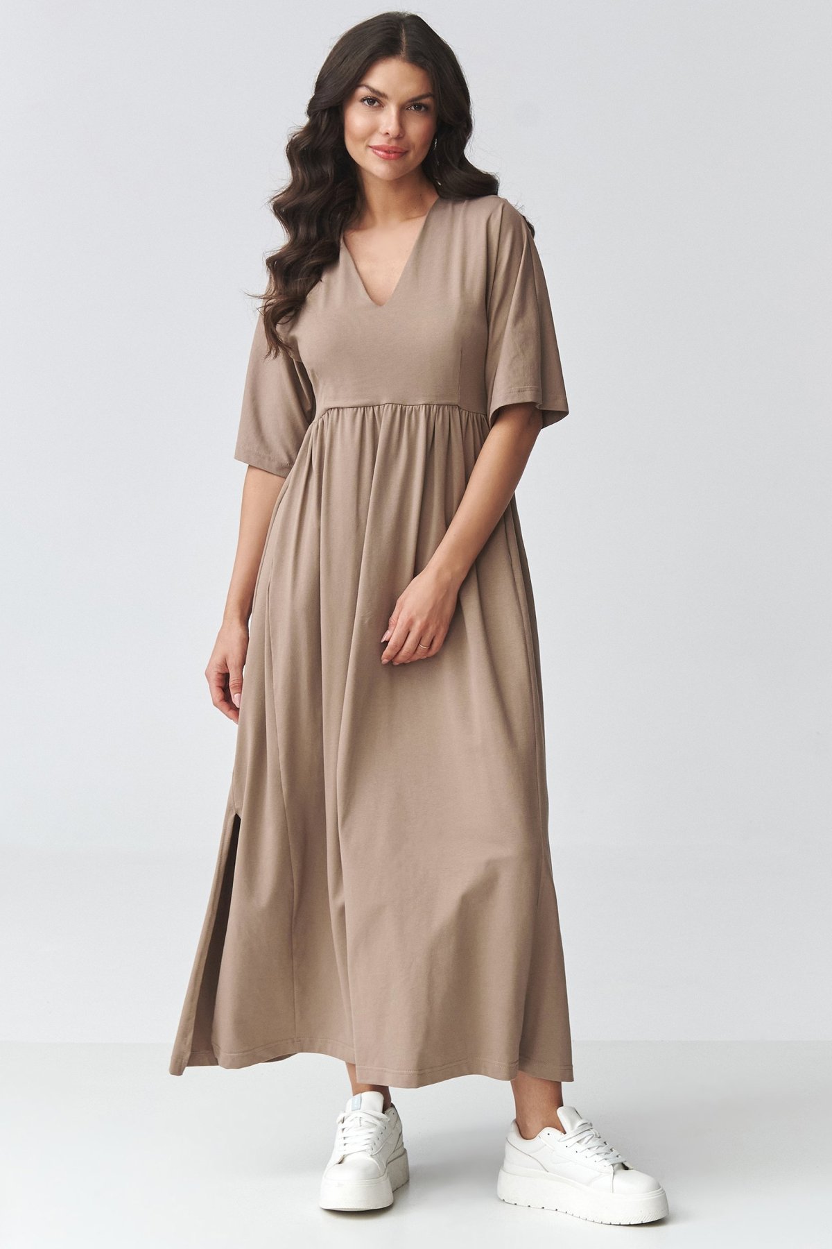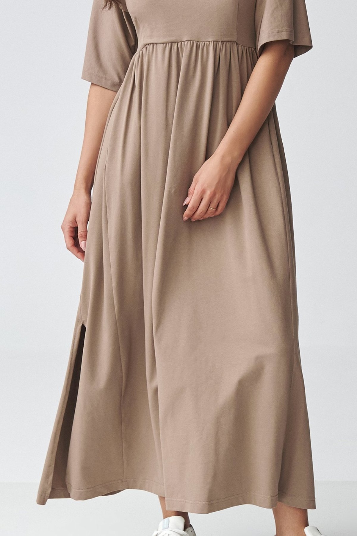 Působí lehce, čistě a velmi přirozeně. Volnější střih dopřává pohodlí při nošení, zatímco odstřižení pod prsy jemně zvýrazní horní linii postavy a dodá modelu ženský tvar. Krátké rukávy a rozparky po stranách přinášejí větší volnost pohybu a odlehčují celkový vzhled. Maxi délka dělá z tohoto kousku univerzální volbu na běžný den, do práce i na volnější společenské chvíle. Jednoduché provedení se snadno kombinuje se sneakersy, sandály i kotníkovými botami podle nálady a příležitosti.