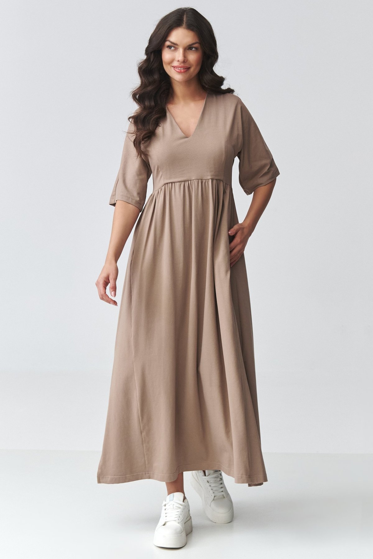 Dlouhé dámské šaty v barvě mokka s výstřihem do V.