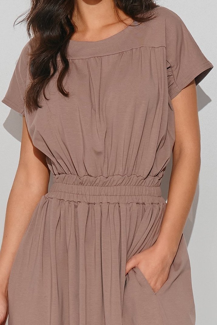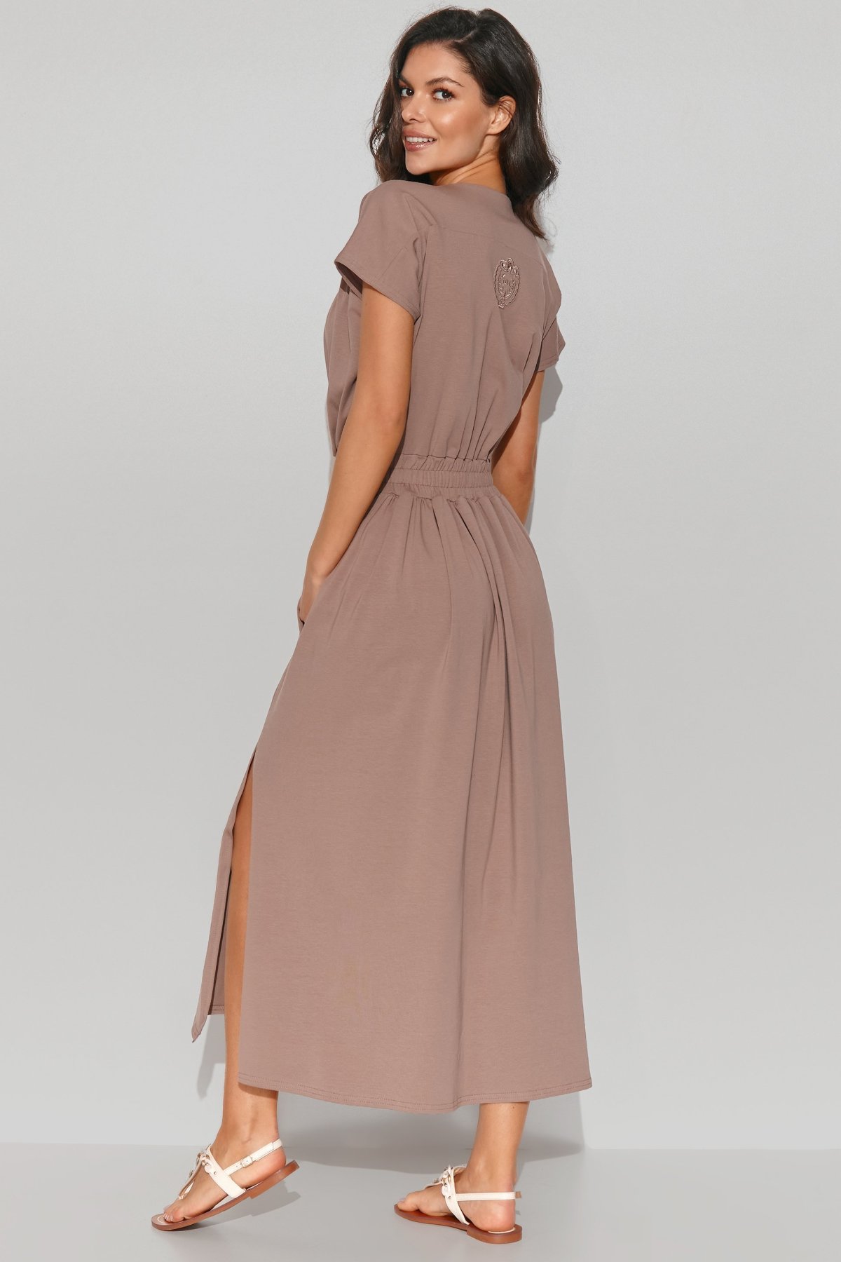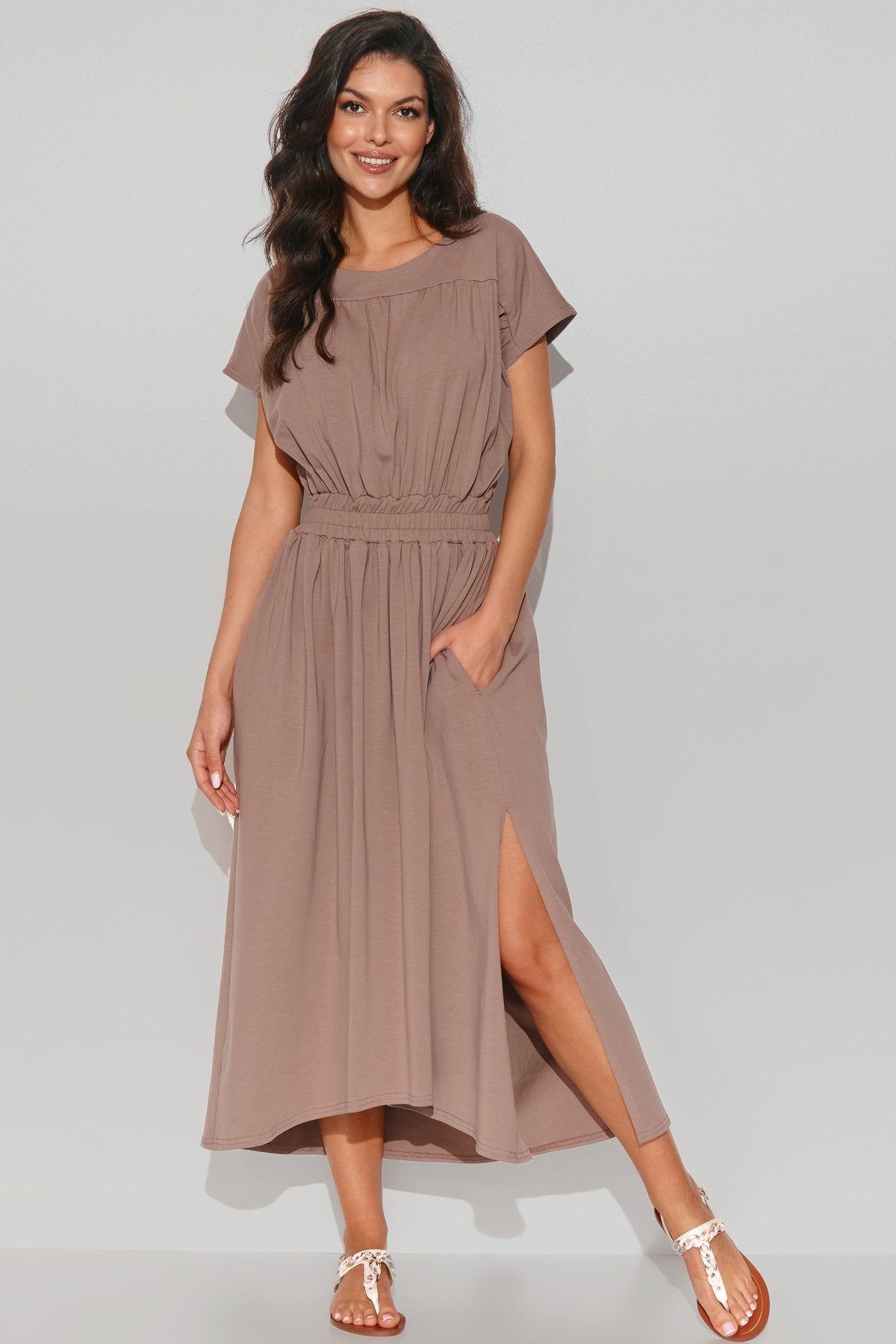 Dlouhé bavlněné šaty v odstínu mokka. Ideální pro ženy, které si cení pohodlí i stylu. Asymetrický střih s delším zadním dílem krásně zeštíhluje postavu a vytváří uvolněnou, přirozeně elegantní linii. V pase je všitá pružná guma, která zvýrazní ženské křivky, zatímco lehce řasený materiál dodává modelu jemný pohyb. Krátké rukávy decentně zakrývají ramena a umožňují pohodlné vrstvení.