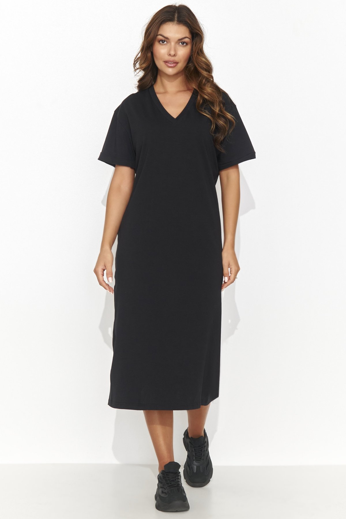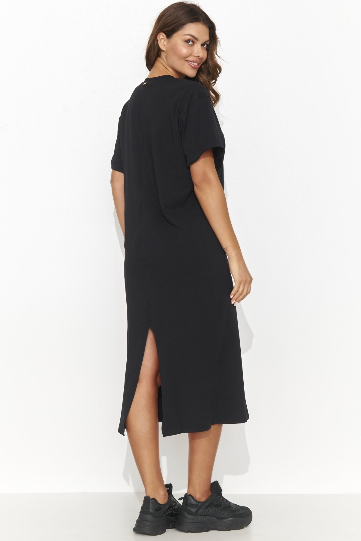 Tyto úpletové šaty v klasické černé barvě jsou dokonalou kombinací pohodlí, stylu a ženskosti. Jejich volný střih a příjemná tkanina zaručují komfort po celý den, zatímco decentní rozparek vzadu dodává šatům jemnou dávku elegance. Krátké rukávy a výstřih do „V“ působí vzdušně a lichotivě, díky čemuž jsou šaty ideální pro každodenní nošení – do práce, na procházku i na neformální setkání. Zlatý detail na zádech podtrhuje jejich moderní a nadčasový charakter.