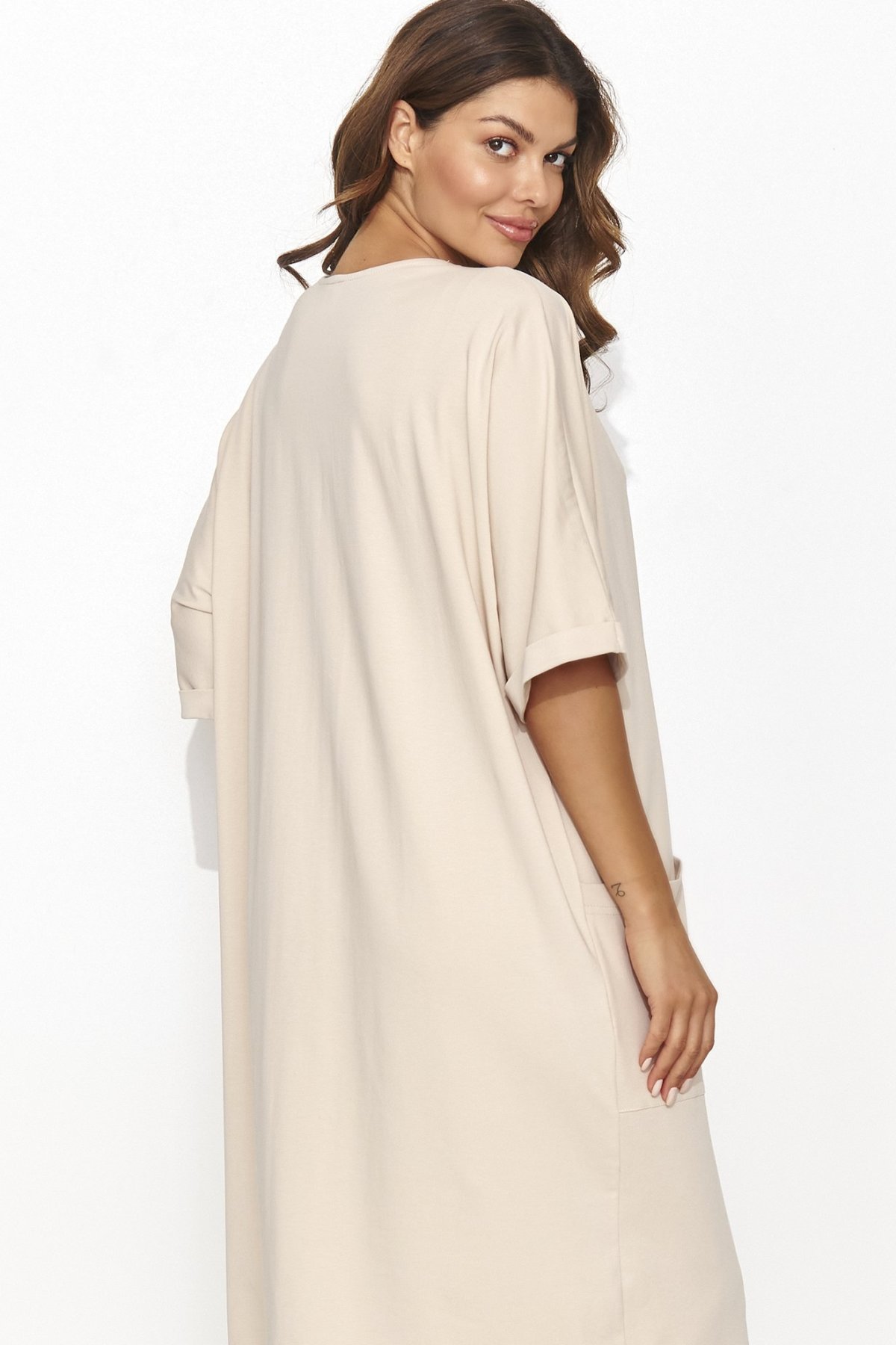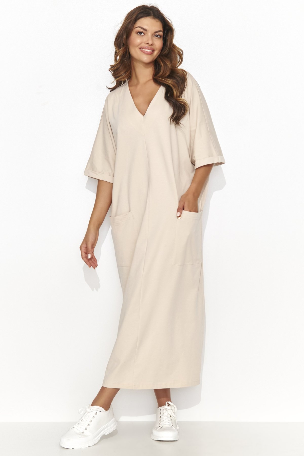 Lehké a vzdušné šaty ve světle béžovém odstínu spojují pohodlí a eleganci v dokonalé rovnováze. Díky volnému střihu a měkkému materiálu jsou ideální pro každodenní nošení – v práci, při procházce i na dovolené. Výstřih do „V“ působí žensky a opticky prodlužuje postavu, zatímco praktické kapsy dodávají ležérní šmrnc.