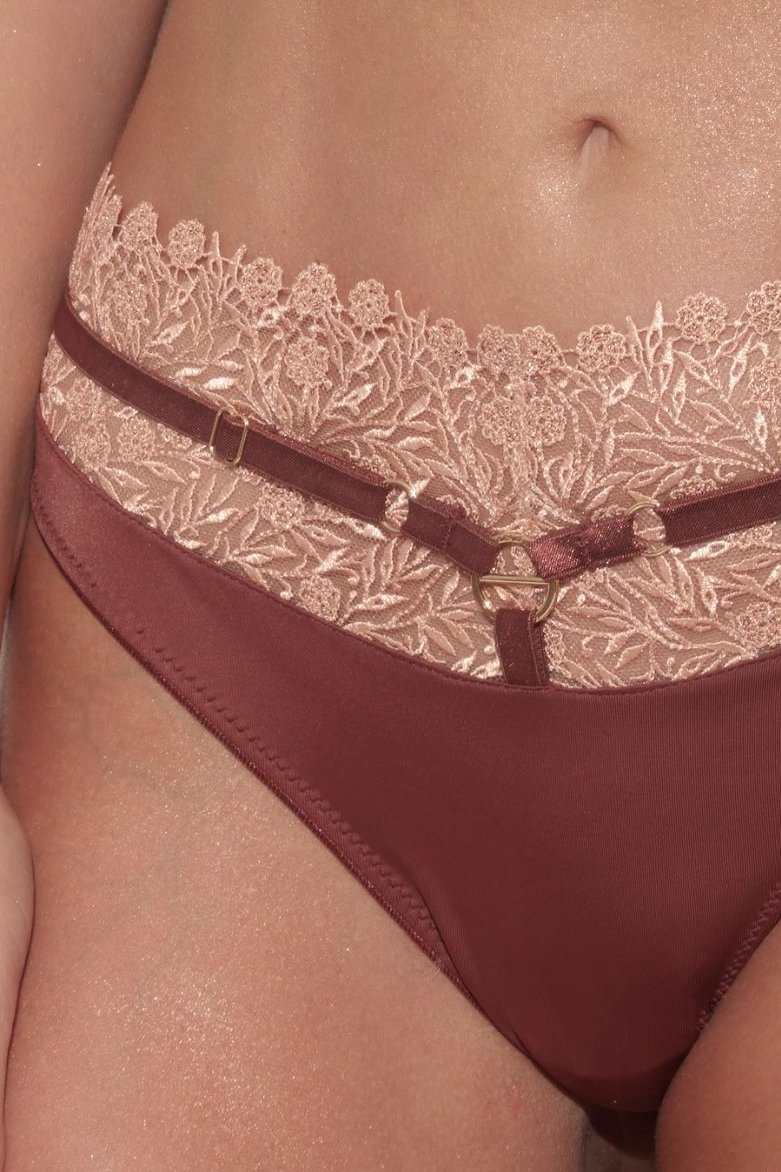 Brazilky Liv II působí smyslně a elegantně díky kontrastu hladkého čokoládového mikrovlákna a jemné béžové výšivky se zlatým detailem.
