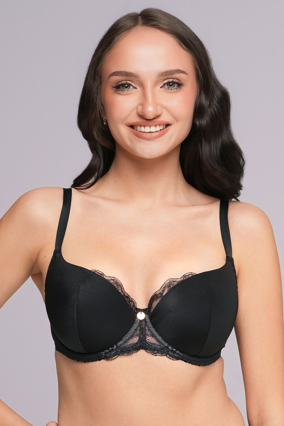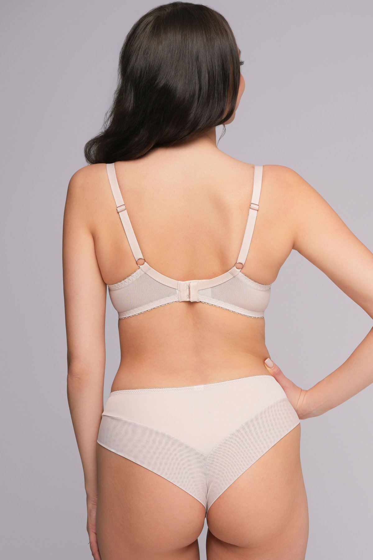 Nižší košíčky zakrývají spodní část prsou, zatímco horní část zůstává jemně odhalená. Vertikální šev pomáhá vytvarovat prsa do kulatějšího tvaru a zajistit přirozené nadzvednutí. Hladký materiál působí čistě pod oblečením, jemná krajka na horním okraji dodává ženský detail. Vnitřní bavlněná podšívka zvyšuje komfort při nošení. Síťovaný obvod dobře drží tvar a přizpůsobí se postavě.