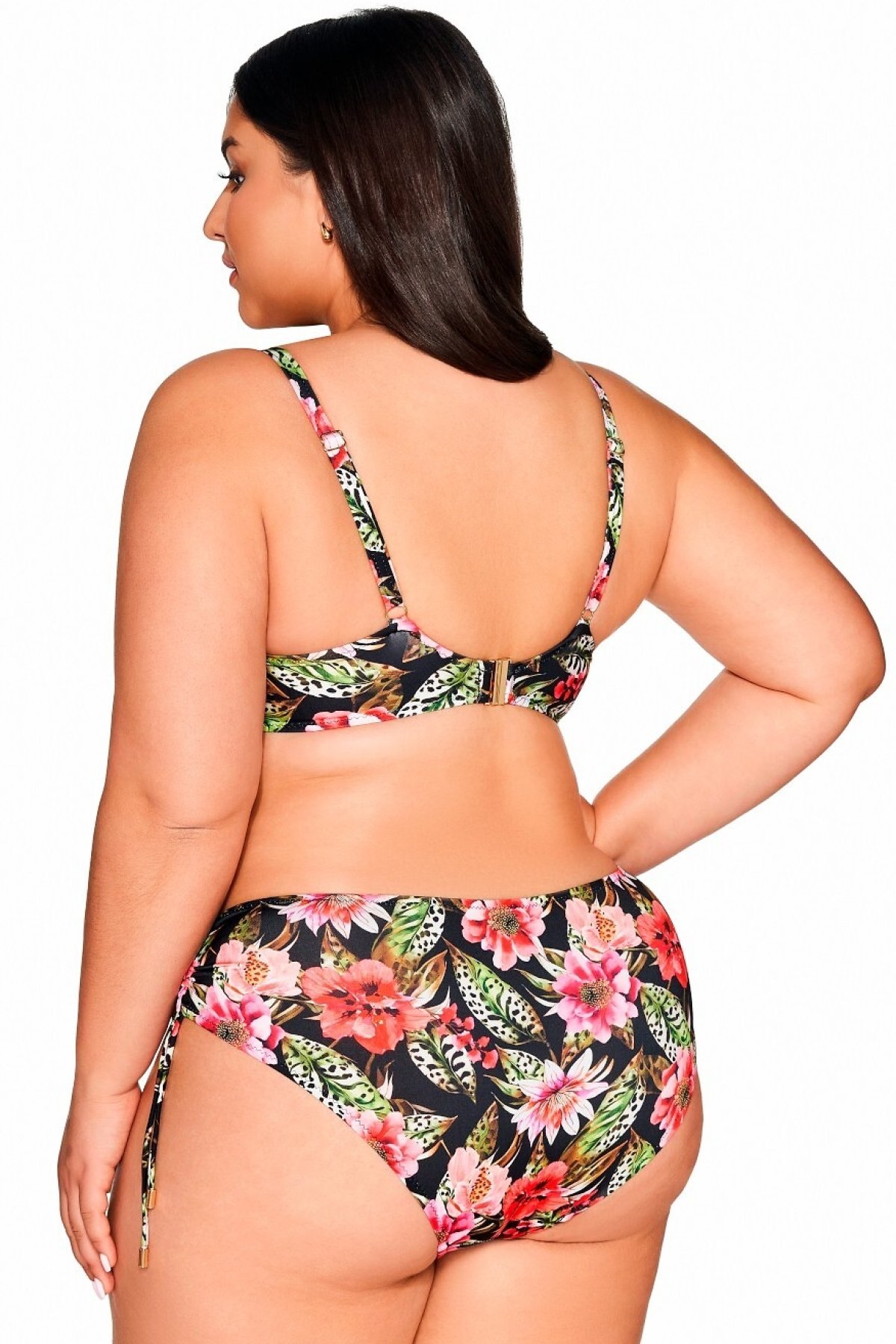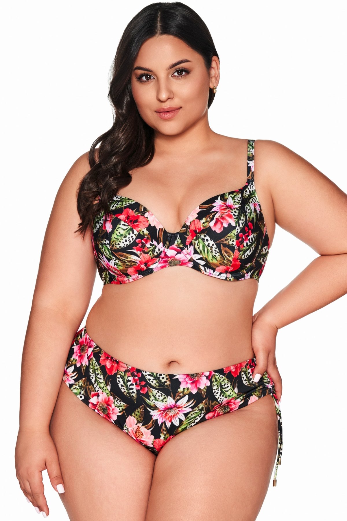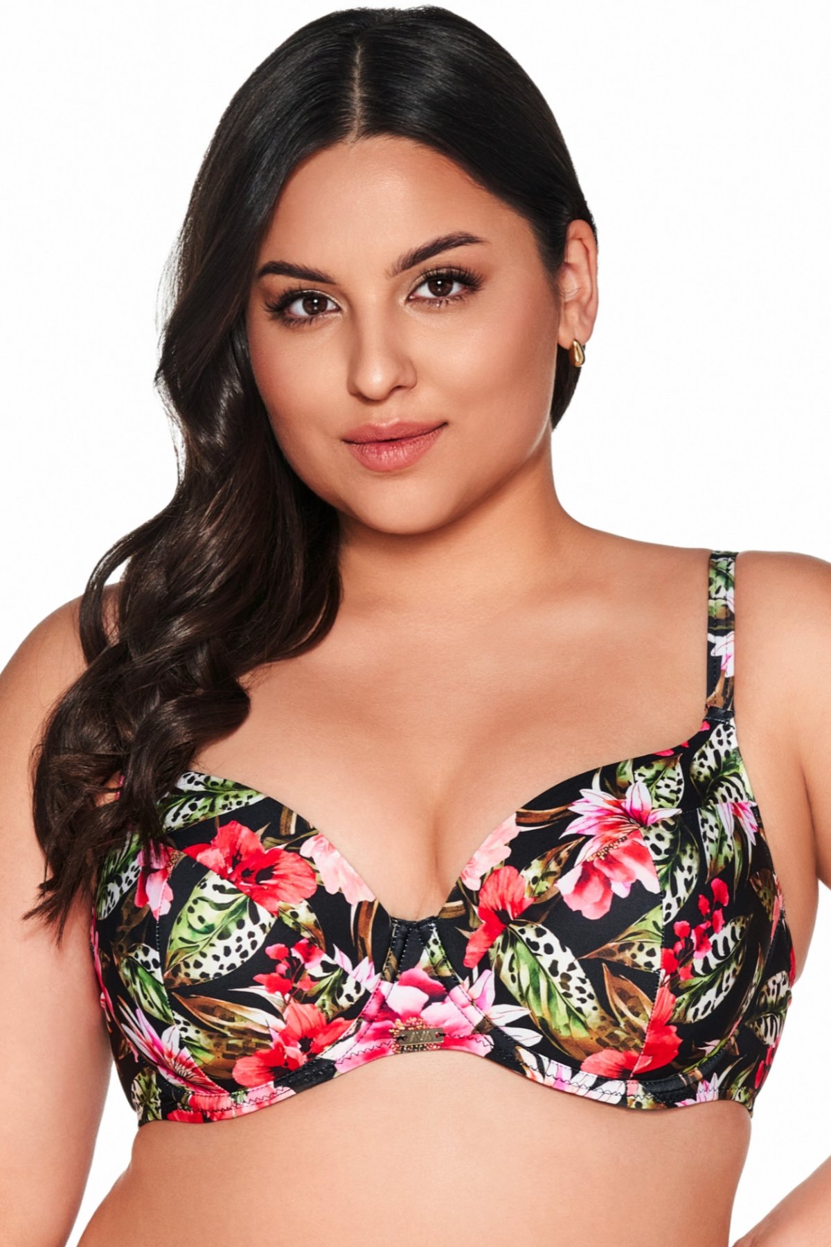 Nevyztužená plavková podprsenka s lichotivým květinovým vzorem na černém základu.Střih podprsenky s měkkými košíčky a…