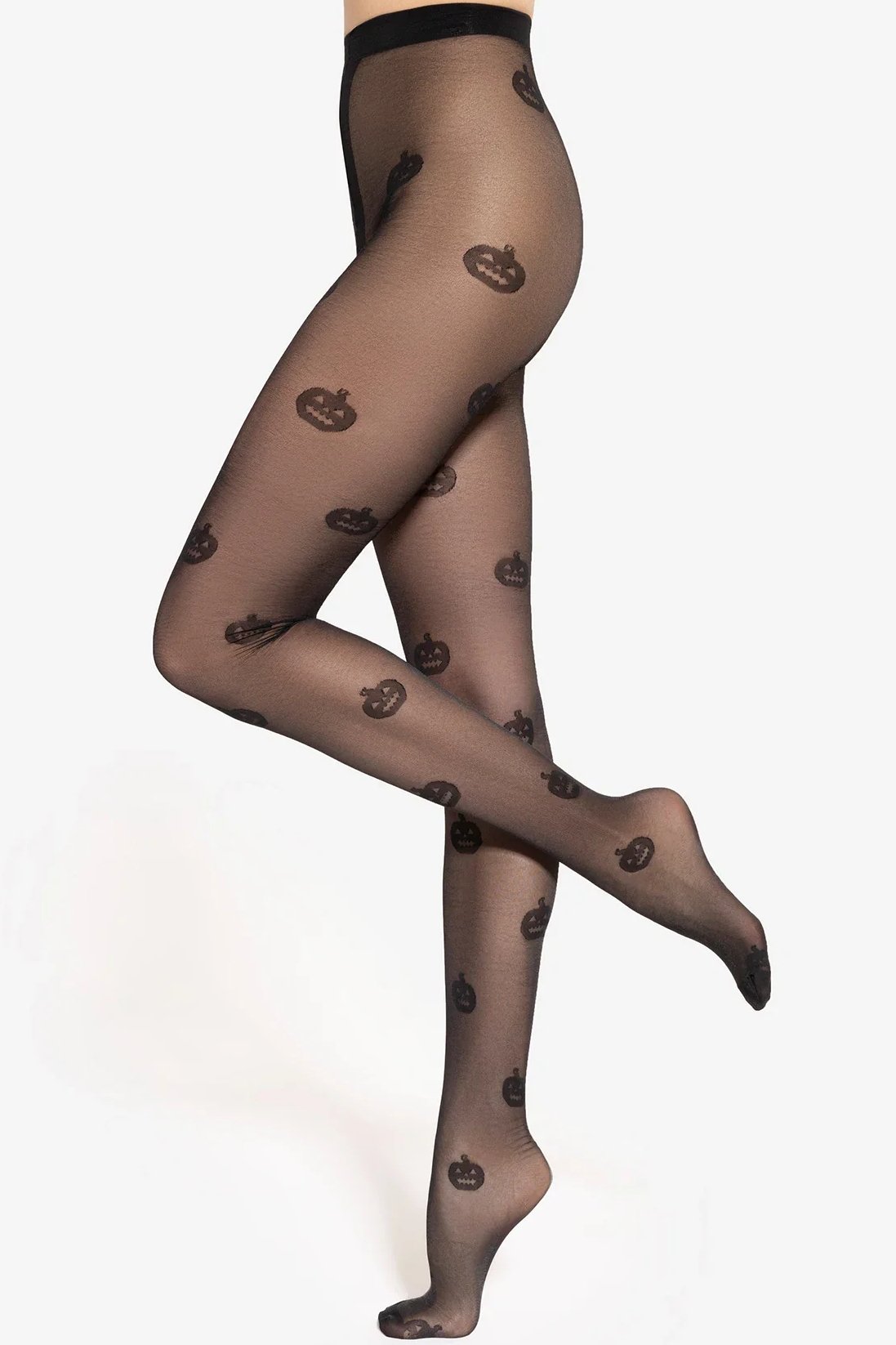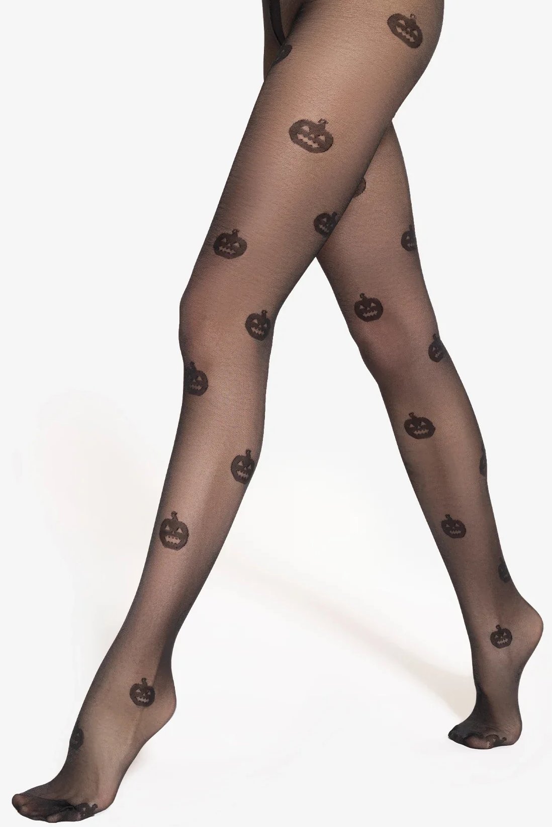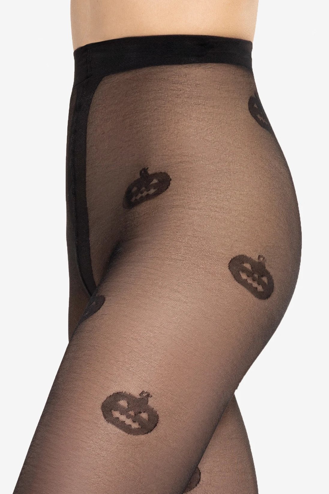 Punčocháče Crazy Trick 04 dodají vašemu outfitu hravý halloweenský nádech v elegantním stylu. Transparentní černý materiál zdobí drobné dýně rozmístěné po celé délce nohou, které zaujmou na první pohled. Elastická příze zajišťuje pohodlí i přirozené přilnutí k tělu, zatímco část T-band vytváří hladký přechod pod oblečením. Skvělá volba pro tematické večírky i originální podzimní kombinace.
